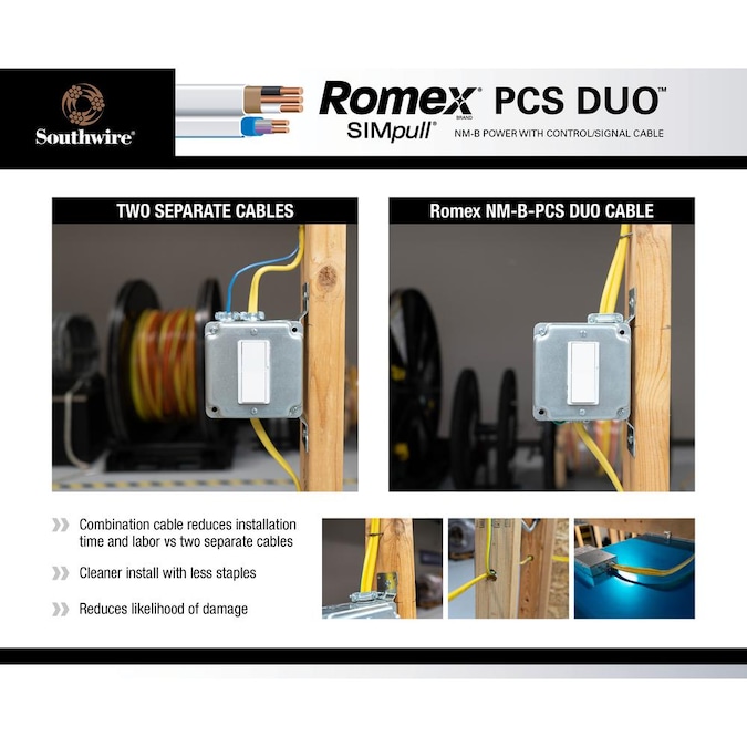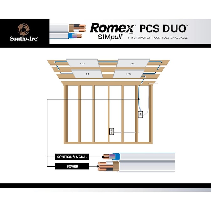Southwire’s new Romex brand SIMpull NM-B-PCS duo cable combines power conductors along with control/signal cables all under one jacket, saving you time and money compared to traditional installations of two cables. Romex brand SIMpull NM-B-PCS duo cable is ideal for use with LED or fluorescent dimming controls and smart homes. Romex brand SIMpull NM-B-PCS duo cable is the all in one cable UL listed wiring solution to connect 0-Volt to 10-Volt dimmable LED and fluorescent lighting fixtures to 0-Volt to 10-Volt dimmers and switches.