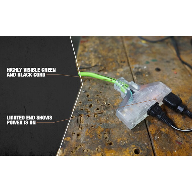 • Highly visible 14 gauge, green and black striped extension cord prevents tripping