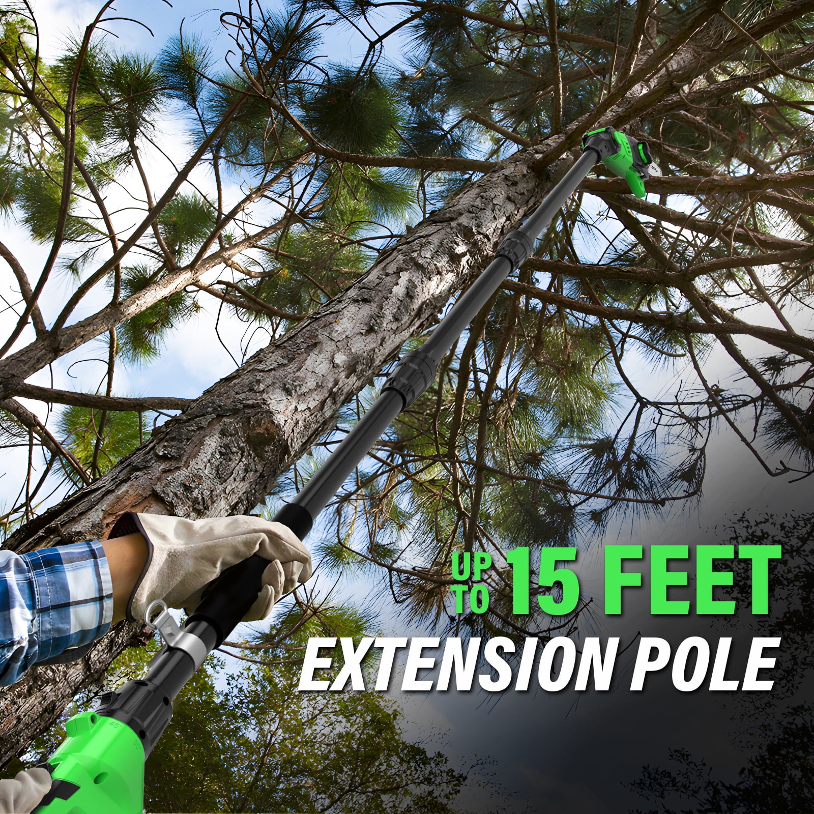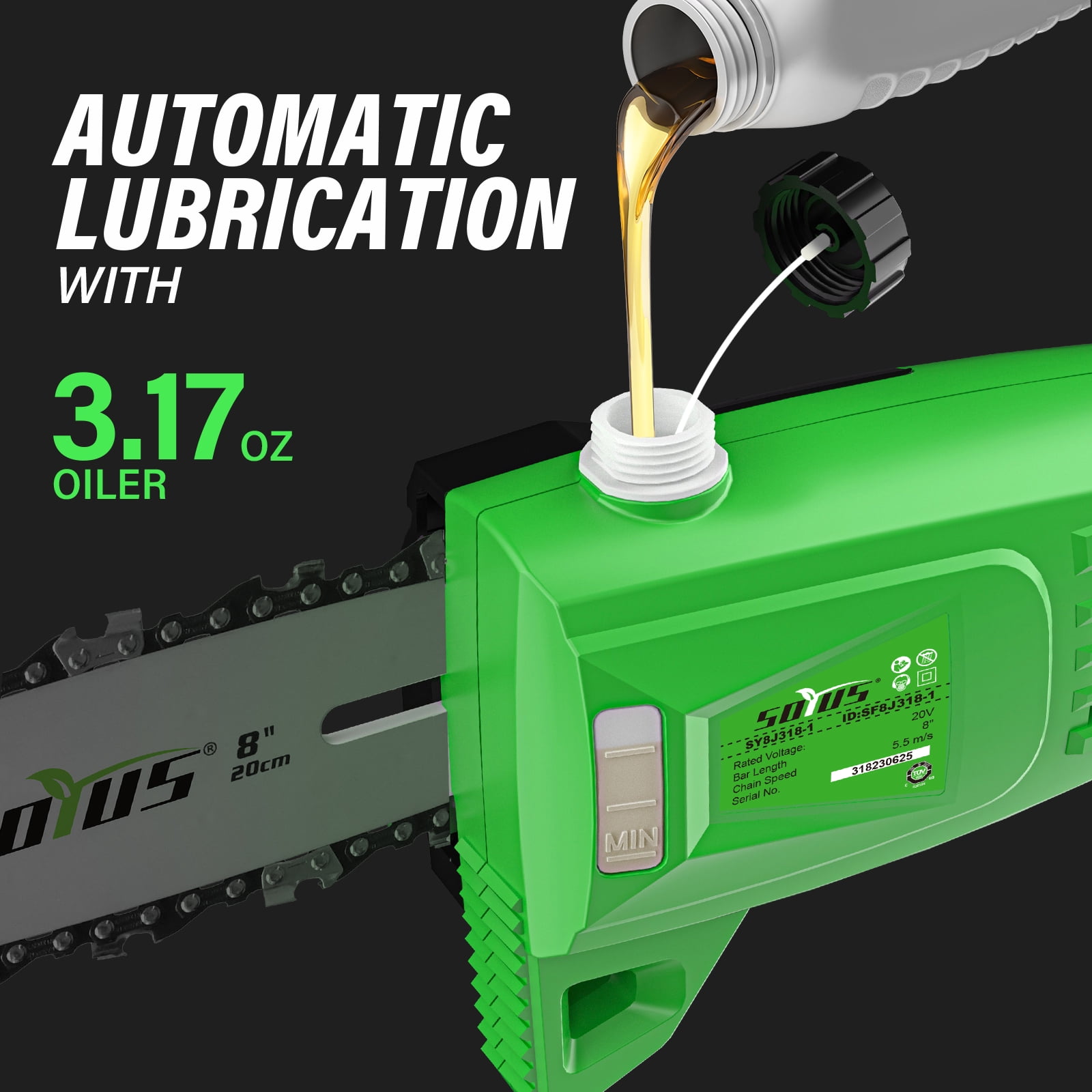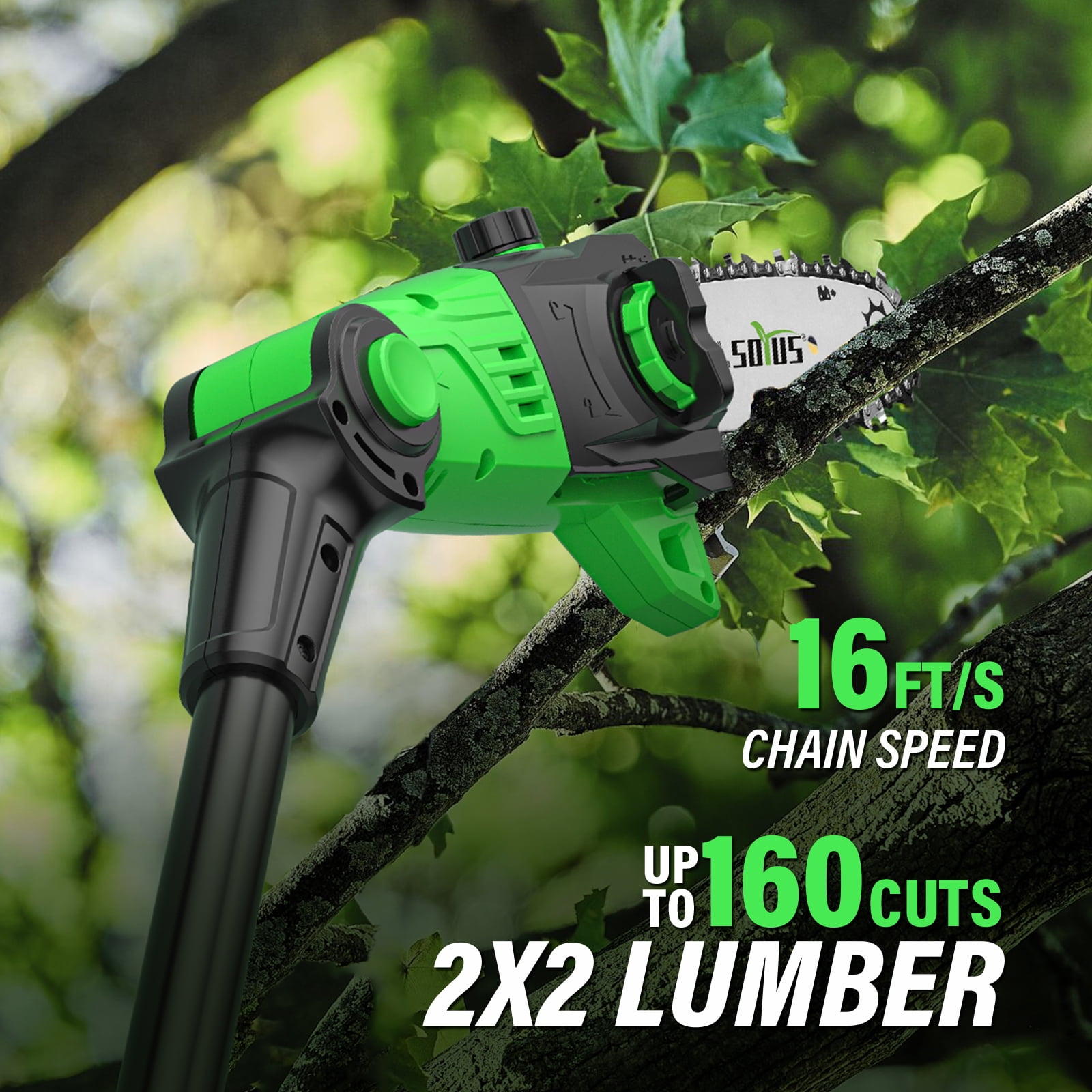 2-IN-1 POLE SAW & HEDGE TRIMMER – The newly designed 2-in-1 pole saw with saw head attachment and hedge trimmer attachment is able to fully satisfy all your branch pruning needs. For the convenience of customers, we added a section of the extension tube, which is convenient for customers to prune tree branches. It does not depend on unstable ladders, making the work of pruning branches easy. UP TO 15 FEET EXTENDED HEIGHT – When you encounter hard-to-reach branches but don’t want to risk climbing a ladder for safety reasons, you deserve to have this SOYUS cordless pole saw. With an extension pole from 9.4 feet to 10.4 feet, you can reach heights of up to 15 feet (based on a 5.4-foot person holding the pole in an extended position at shoulder level). And there are 3 adjustable angles that allow you to easily trim branches in different locations. SAFETY PROTECTION DESIGN – This pole saw incorporates a safety protection system that can only be activated when the safety lock and trigger are pressed, thus preventing the operator from accidental injury. Meanwhile, the new battery pack is equipped with an advanced battery management system, which can make the use safer. AUTOMATIC OILING & TOOL-FREE TENSIONING – SOYUS pole saw is equipped with automatic oiling system to keep the chain running perfectly at 16FT/S, which greatly extends the service life of the high branch saw. Meanwhile, equipped with tool-free tensioning chain system, you can adjust the chain loosely and freely. Therefore, every time you use it, it can help you cut more efficiently and faster.