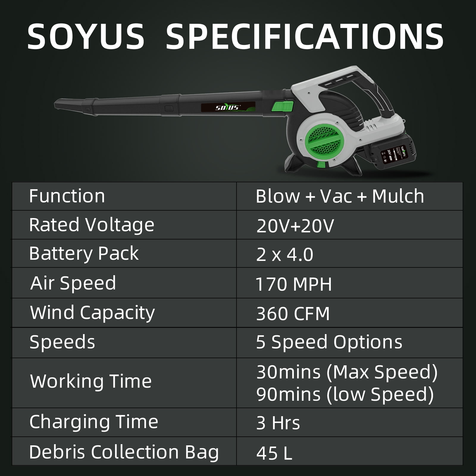 Soyus Leaf Blower Vacuum Cleaner does 3 duty as a leaf blower & leaf vacuum & leaf mulcher at the same time, saving you the cost of purchasing additional equipment. With 2 operating modes, you can easily switch between jobs, blowing leaves from your yard and vacuuming/mulching leaves.The leaf blower cordless with battery and charger has a powerful battery capacity,which can support more than 30 minutes of cleaning at max speed,and a battery life of up to 90 minutes at low speed,and a full charge takes only 1.5 hours.The cordless leaf blower vacuum is designed with 4 speeds, you can clearly check the wind speed status and battery capacity through the control panel of the battery powered leaf blower.The leaf vacuum mulcher with bag has a 45L Extra large capacity leaf collector organizer bag, sturdy and durable, can hold more leaves.The bottom is designed with a zipper for easy dumping, you can use the blowers for lawn care with confidence. Basic information Power input: 40V Form Factor:Handheld Power Source:Battery Powered Special Feature:Cordless Air Flow Capacity:360 Cubic Feet Per Minute Condition: Brand New Style:Leaf Blower/Vacuum Kit Product Dimensions:37″L x 5″W x 12″H Speed:170 Miles per Hour Item Weight:14.32 pounds Package includes 1 x Leaf Blower/Vacuum 2 x 20V 4.0 Ah Battery 1 x Charger 1 x User Manual 1 x 45L Leaf Collection Bag 1 x Shoulder Strap