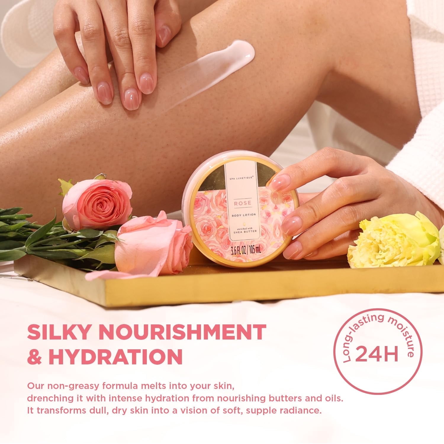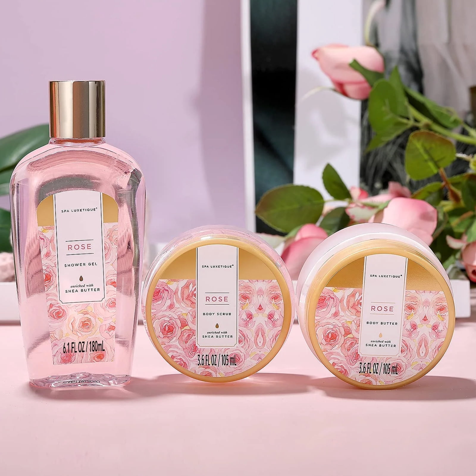 SPA LUXETIQUE, Love at First Scent–Each spa product designed with the concept of highest quality gift giving, whether it is for loved ones or for oneself. Wonderful present for Mother’s Day, Christmas, Birthdays, Holidays, Anniversaries and Valentine’s Day. Great for Your Skin – All of our products are enriched with Shea butter, Sunflower seed oil & Vitamin E. The Shea butter and sunflower seed oil contain a high quantity of saturated fats, Vitamin E helps heal dry skin and provides lasting moisturizing effects. Shower Gel & Bubble Bath – A soak in the bath can boost mood and soothe the skin. So just have a daily soak using our rose spa sets, lie back and relax, get lost in thought, listen to music, or read a book. Bath Salts – Tackle exhaustion with the help of our upgrade body scrub, which has a uplifting rose fragrance and has been formulated to enlighten moods.The bath salt is ideal for exfoliation and soothing tired mind and body. Soap & Shampoo Bar – Pure essential oils give these awesome soaps their natural scent and plant extracts like essential oil, Shea butter, and nutrient-rich vitamins E leave your skin clean and happy. For a morning infused with the scents of the rose garden, start the day with this hydrating bar soap. Hair Drying Towel adds Convenience – Suitable for you when you are cleaning face, taking shower, wearing makeup, doing sports and enjoying massage. This soft and comfortable hair drying tower not only keep you a gorgeous looking but also keep your hair style and absorbing water. Try the Body Brush – Our body brush can be the Exfoliator as well as the add-on skincare booster. Add the fine salts to customize your favorite body or facial wash. Give your skin what it craves – use as much or as little as you need. You’re ready to see the natural glow on your own skin.