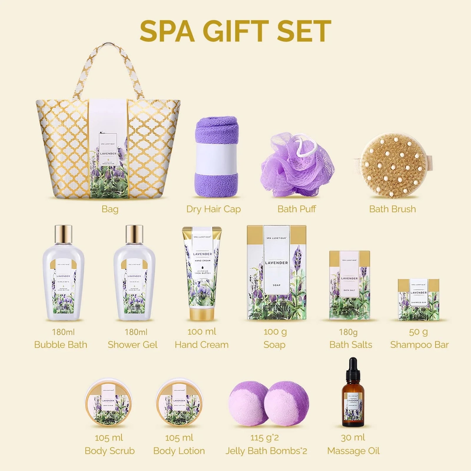 SPA LUXETIQUE, Love at First Scent Each spa product designed with the concept of highest quality gift giving! Our exquisite packaging and premium products are perfect as a gift for yourself or women you loved. Gift for Birthdays, Holidays, Anniversaries, Christmas, Mother’s Day and Valentine’s Day. A combination of Luxury & Relaxation Add a few drops to your bath, or pour sparingly into warm water; Dip a hand towel into the mixture; Keep the towel folded over your eyes for 10 to 15 Minutes; Add some fun to your bath time: Pop one bath bomb in your bath for a relaxing soak with an explosion of fragrance leaving your skin feeling soft and hydrate. Pampering 15pc Lavender Bath & Body Set: Shower Gel(235ml); Bubble Bath(235ml); Bath Salt(200g) Body Scrub(105ml); Body Lotion(105ml); Hand Cream(100ml) Massage Oil(30ml); Shampoo Bar(50g); Soap(100g) 2*Bath Bombs(150g); Bath Loofah; Body Brush Hair Drying Towel; Handmade Tote Bag