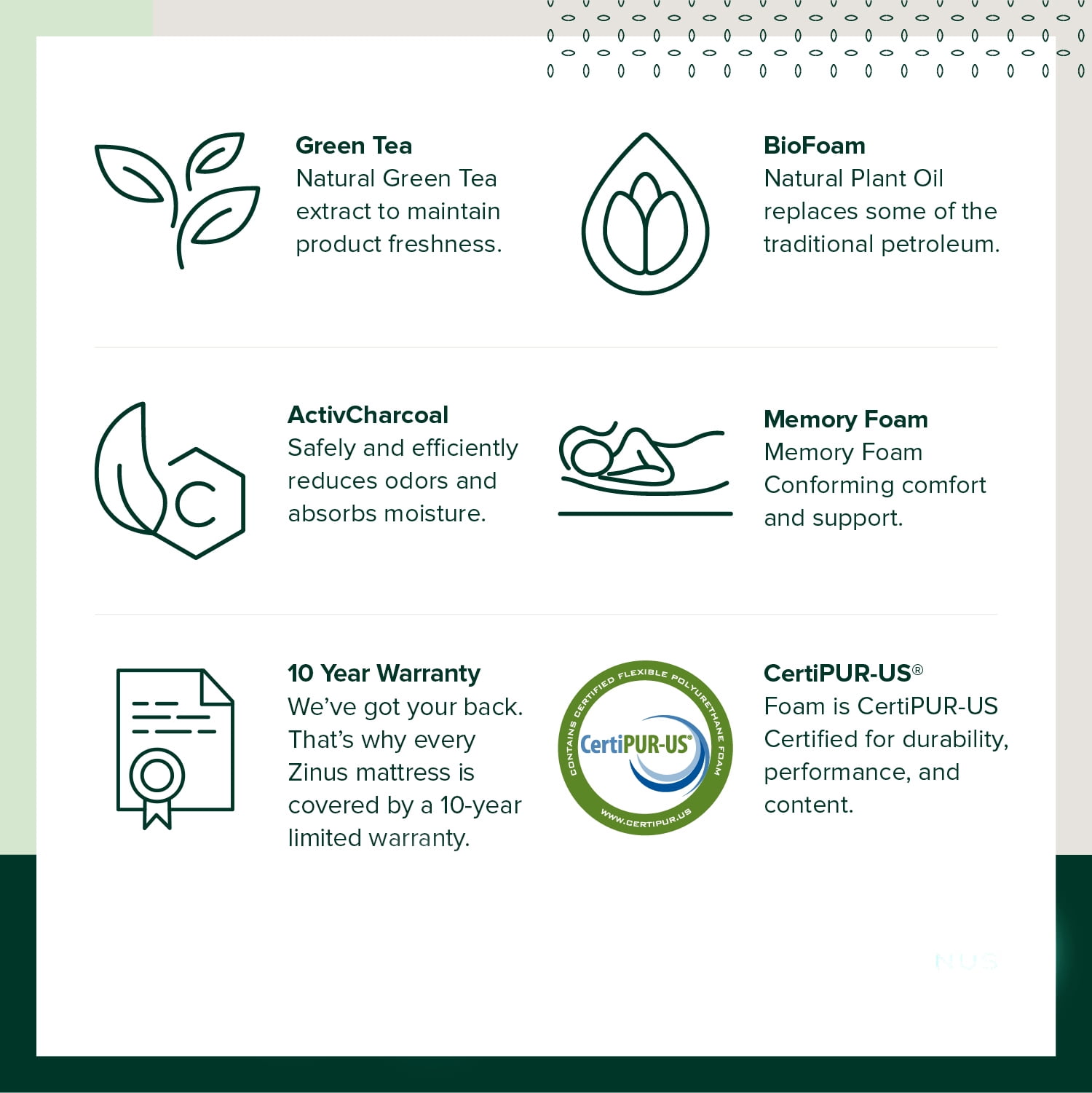 ActivCharcoal technology safely and efficiently absorbs moisture and removes odors Temperature-sensitive memory foam conforms to the shape of your body Treated with natural green tea extract to maintain freshness Stress-relieving layer system Outer plush cover 2.5″ layer of 3 lb memory foam 2″ layer of comfort foam 5.5″ layer of high density foam for support, durability and stability Available in Twin, Full, Queen, King and California King sizes 10-year worry free warranty Bed frame sold separately Smartly shipped in one box straight to your door See our assortment of Zinus products