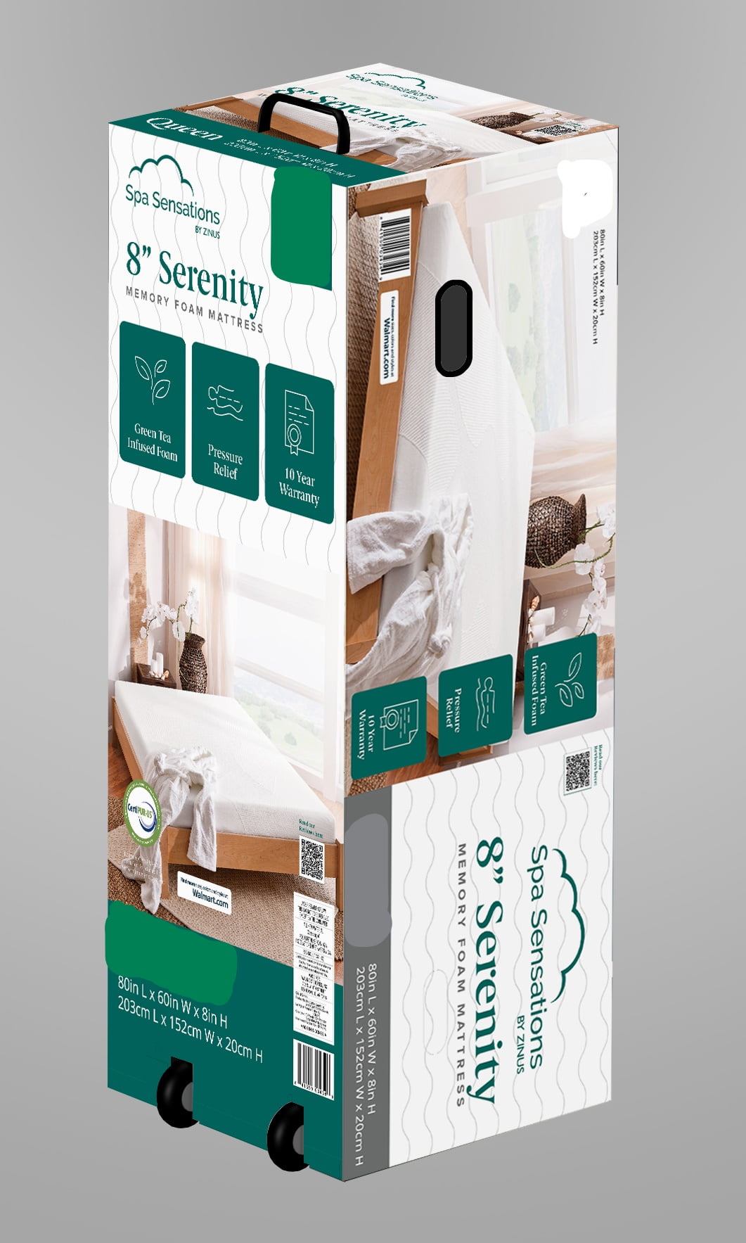 Spa Sensations by Zinus 8” Comfort Memory Foam Mattress, Queen Plush poly jacquard cover with a stress-relieving layer system Green tea and charcoal-infused memory foam eliminates odors and promotes freshness 2″ memory foam, 2” comfort foam, and 4” base support foam for stability Highest quality foam is CertiPUR-US Certified for durability, performance and content Twin size: 39” W x 75” L Full size: 54” W x 75” L Queen size: 60” W x 80” L King size: 76” W x 80” L California King size: 72” W x 84” L Twin Shipping Dimensions: 15” L x 15” W x 40” H Full Shipping Dimensions: 16” L x 16” W x 40” H Queen Shipping Dimensions: 16.5” L x 16.5” W x 42.5” H King Shipping Dimensions: 17.7” L x 17.7” W x 42.5” H California King Dimenions: 17.7” L x 17.7” W x 44.5” H Twin size can support up to 250 lbs, while all other sizes support up to 500 lbs 10 year worry free warranty See our assortment of Zinus products