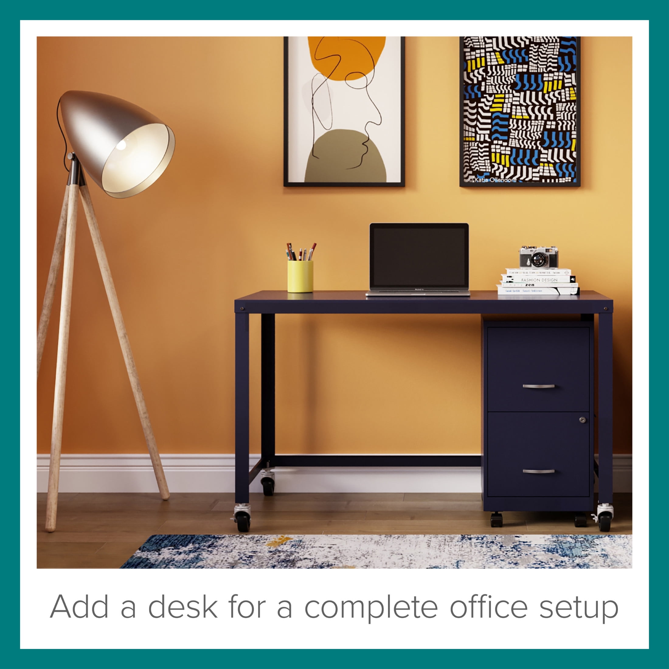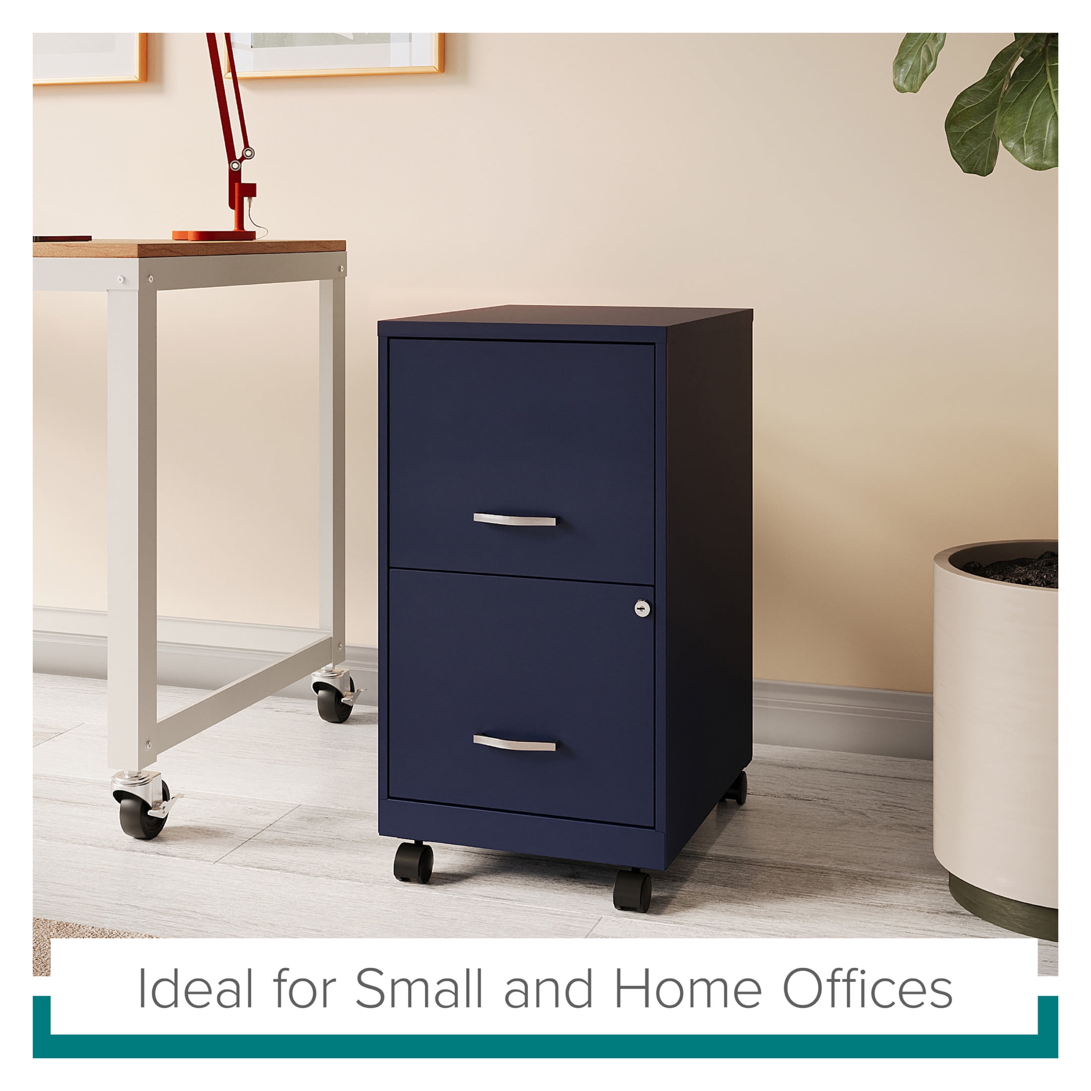 The Mobile Two Drawer Metal Vertical File Cabinet is designed for smaller professional offices or home office use. The cabinet features durable steel construction and a smart, efficient design that works well in small spaces, fitting easily under most work surfaces or office desks. Each drawer features high-sides to accommodate letter-sized hanging files. The drawers are also a perfect storage solution for other office essentials. Using a patented glide suspension, the drawer slides open and close smoothly with a three-quarter drawer extension to prevent tipping. In addition, you can keep your files and possessions secure with its locking drawers. The additional wheels that come with this file cabinet are both stylish and functional, which makes it easy to move around your home or office. The painted steel surface is non-porous and easy to clean. Bring storage and organization to your home or office with this stylish mobile two-drawer file cabinet. Your office supplies and files will always be organized and within reach. Color: Navy