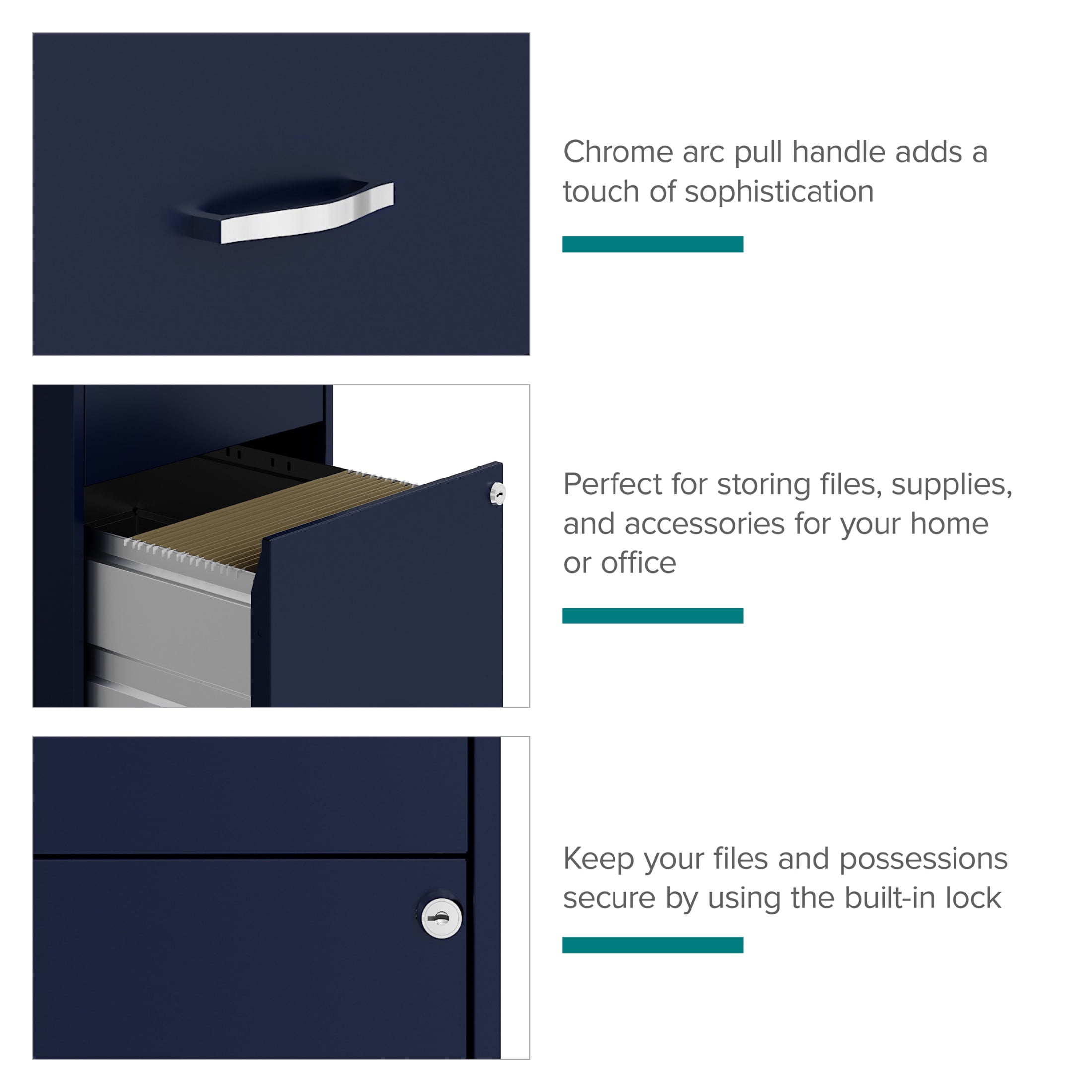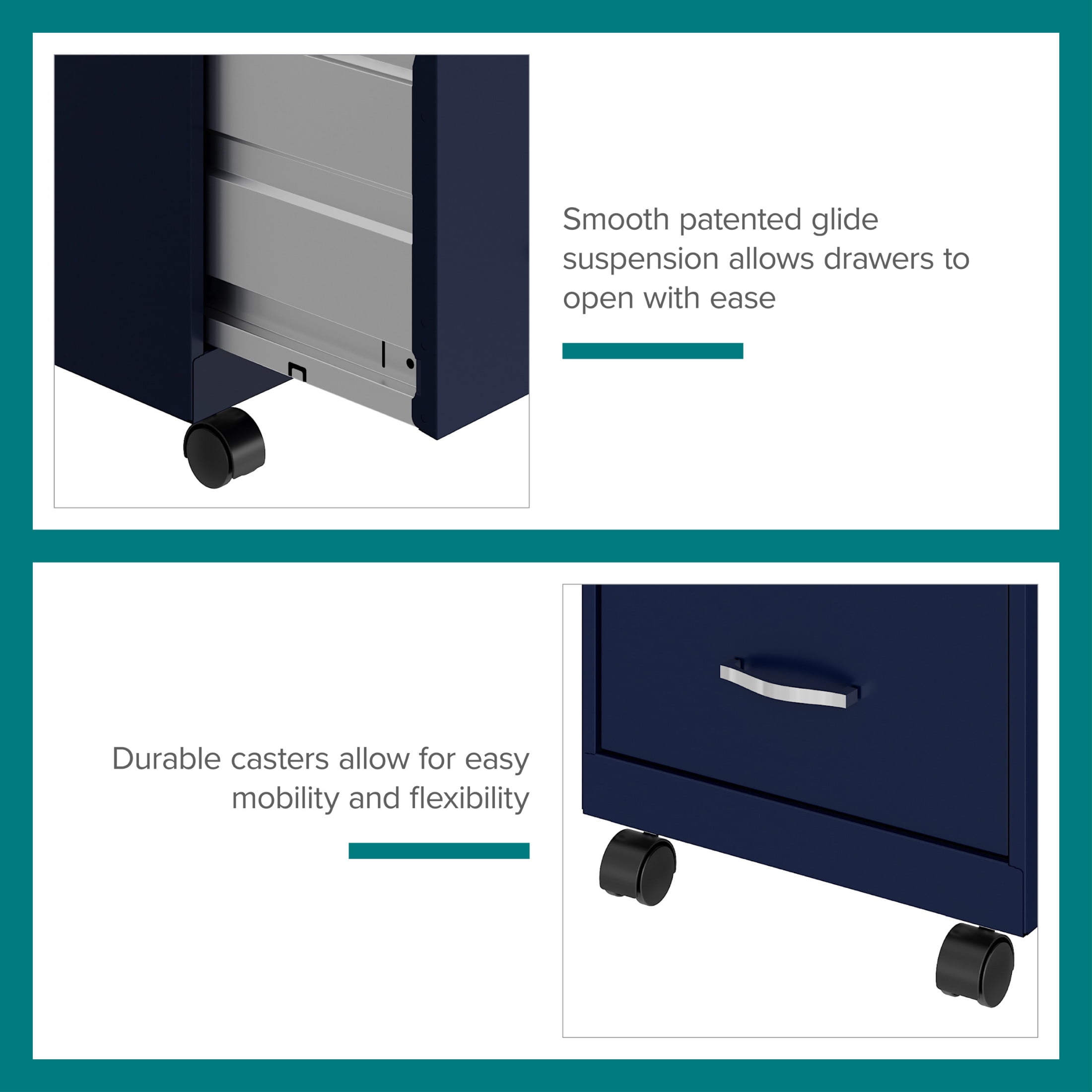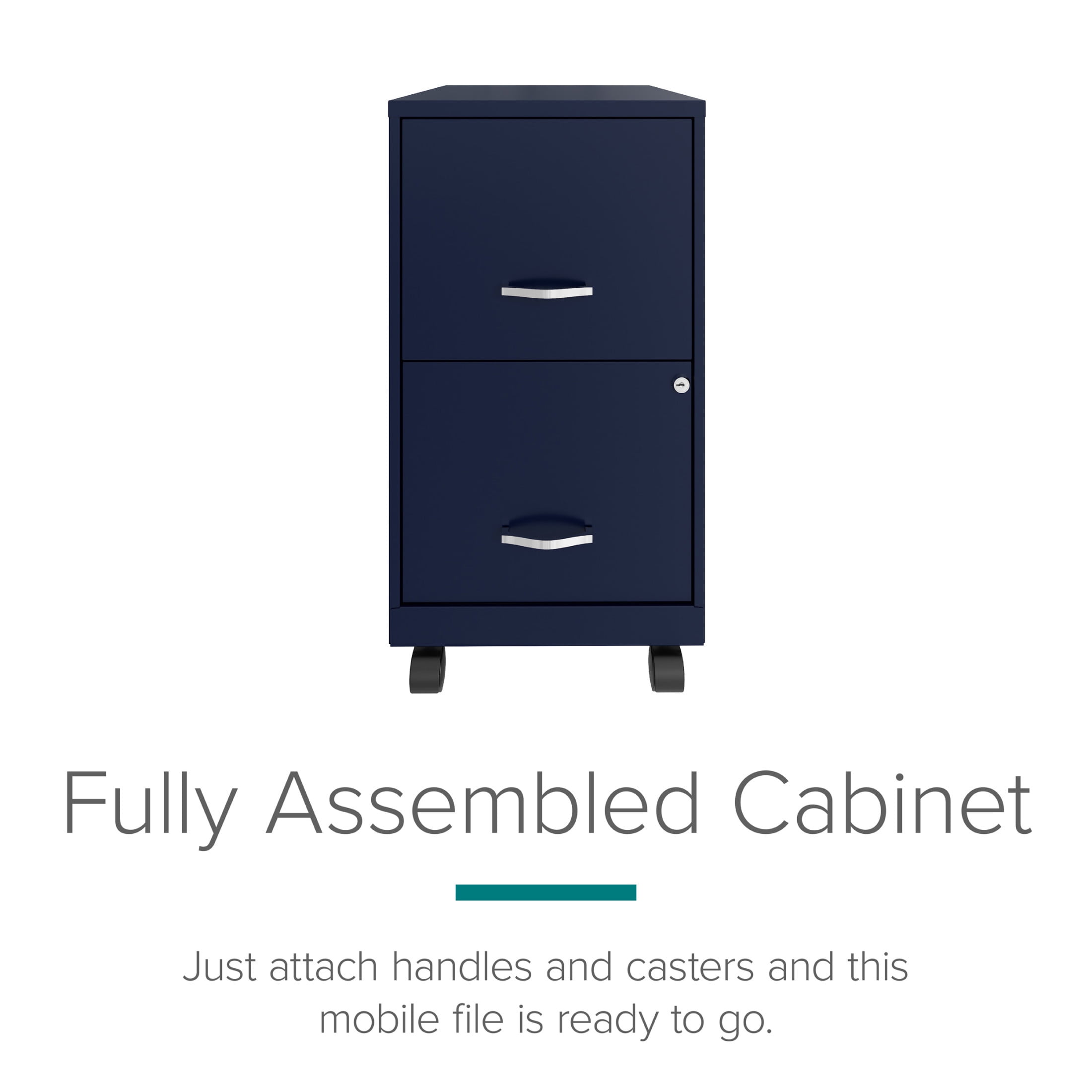 Vertical file drawers accommodate letter-size hanging file folders Full high-side drawers provide storage solutions for other office essentials Smooth patented glide suspension drawer slides Cam lock secures both drawers Three-quarter drawer extension Tucks under most work surfaces and office desks with easy roll casters Painted steel surface is non-porous and easy to clean Fully assembled welded cabinet. Assembly of the handles and optional casters required Space Solutions 18″ Deep 2 Drawer Mobile Letter Width Vertical File Cabinet, Navy