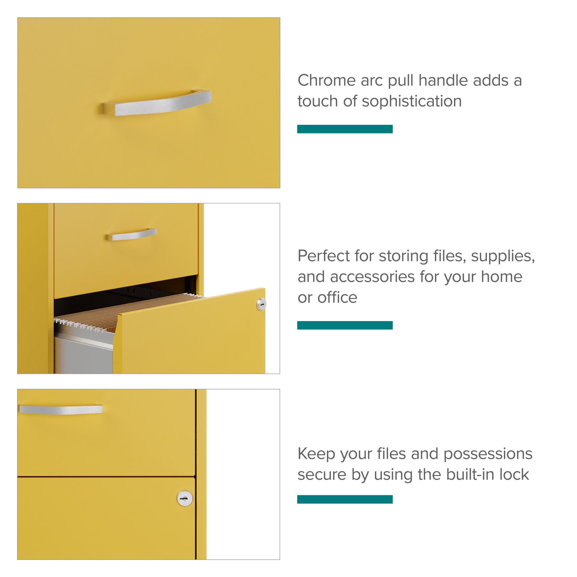 The Mobile Two Drawer Metal Vertical File Cabinet is designed for smaller professional offices or home office use. The cabinet features durable steel construction and a smart, efficient design that works well in small spaces, fitting easily under most work surfaces or office desks. Each drawer features high-sides to accommodate letter-sized hanging files. The drawers are also a perfect storage solution for other office essentials. Using a patented glide suspension, the drawer slides open and close smoothly with a three-quarter drawer extension to prevent tipping. In addition, you can keep your files and possessions secure with its locking drawers. The additional wheels that come with this file cabinet are both stylish and functional, which makes it easy to move around your home or office. The painted steel surface is non-porous and easy to clean. Bring storage and organization to your home or office with this stylish mobile two-drawer file cabinet. Your office supplies and files will always be organized and within reach. Color: Goldfinch