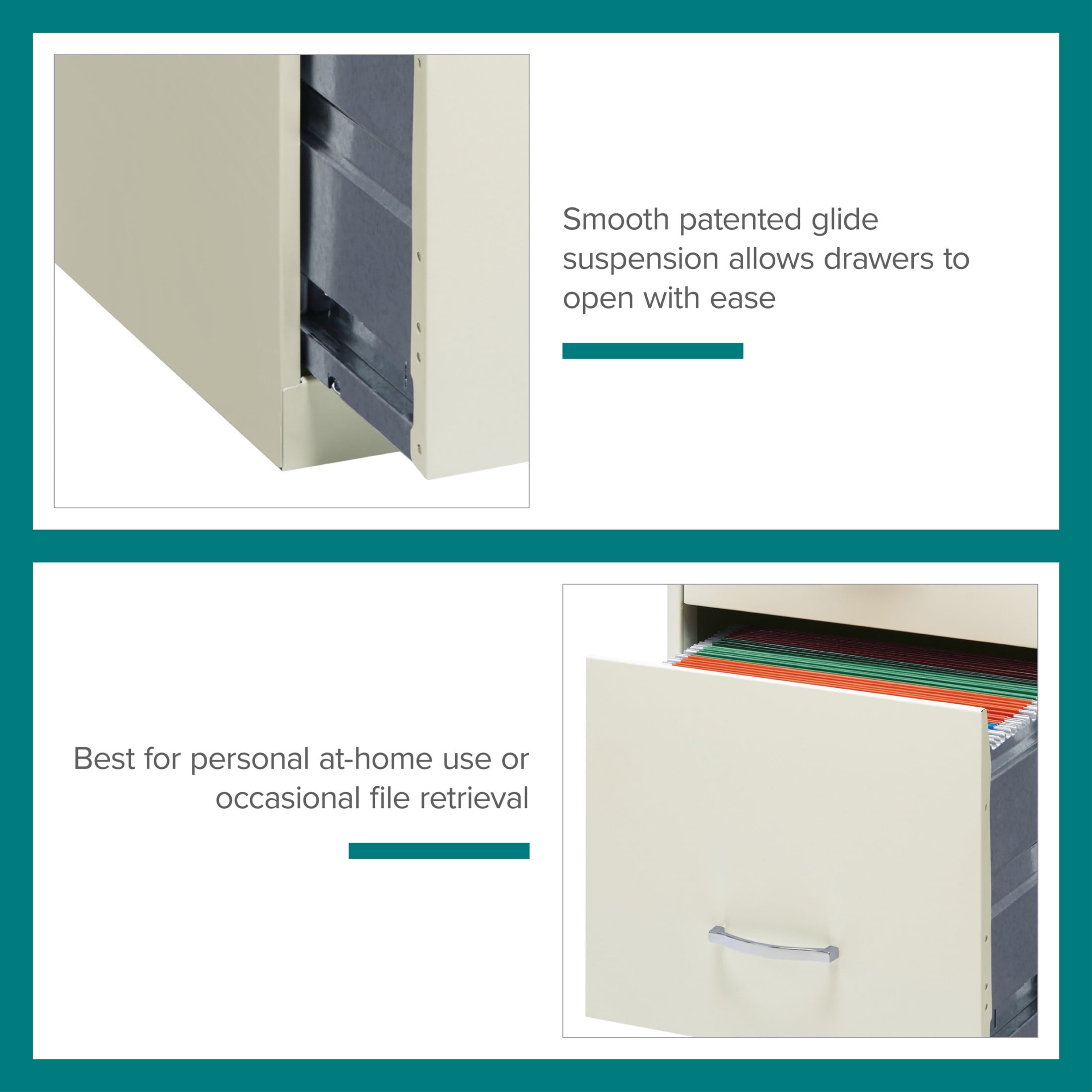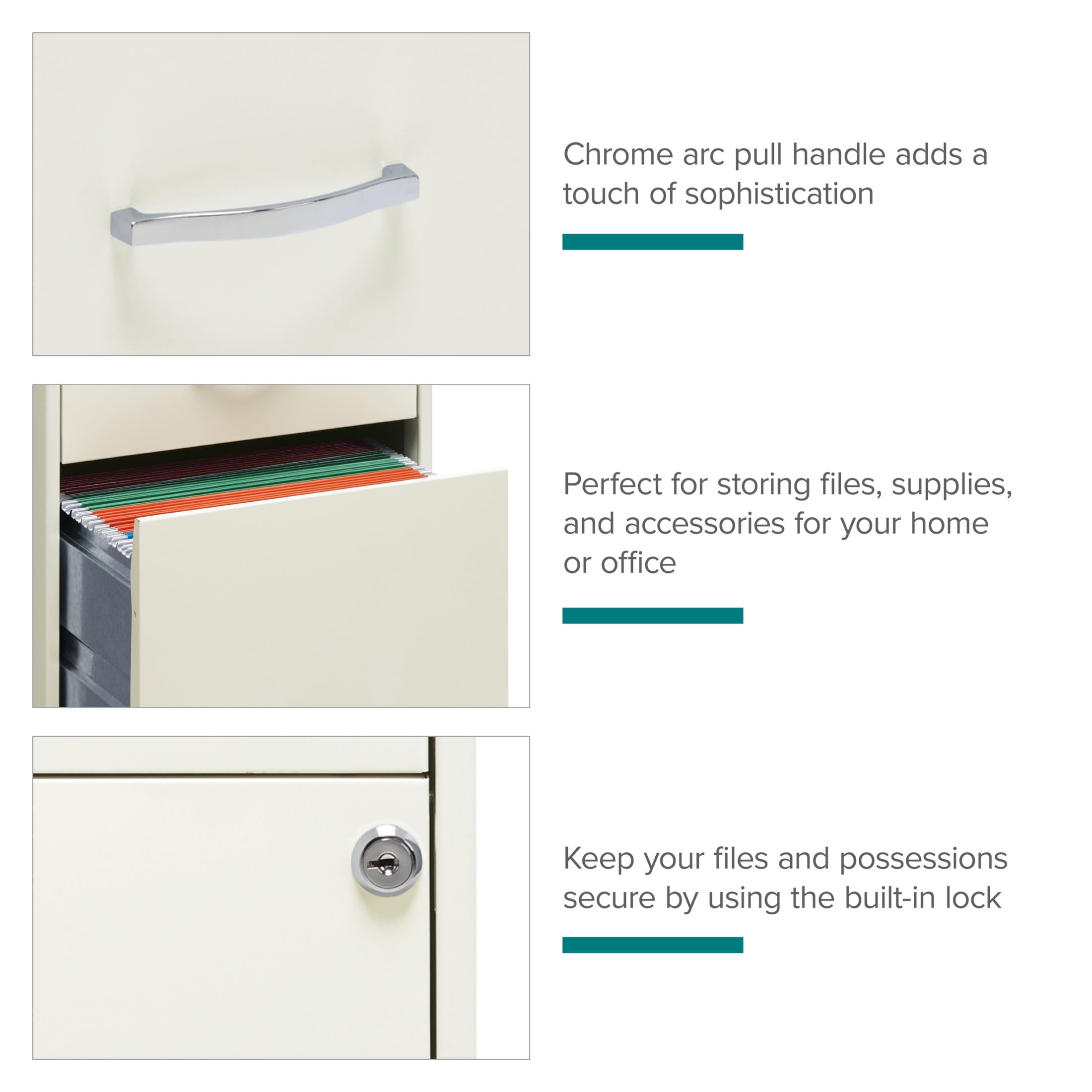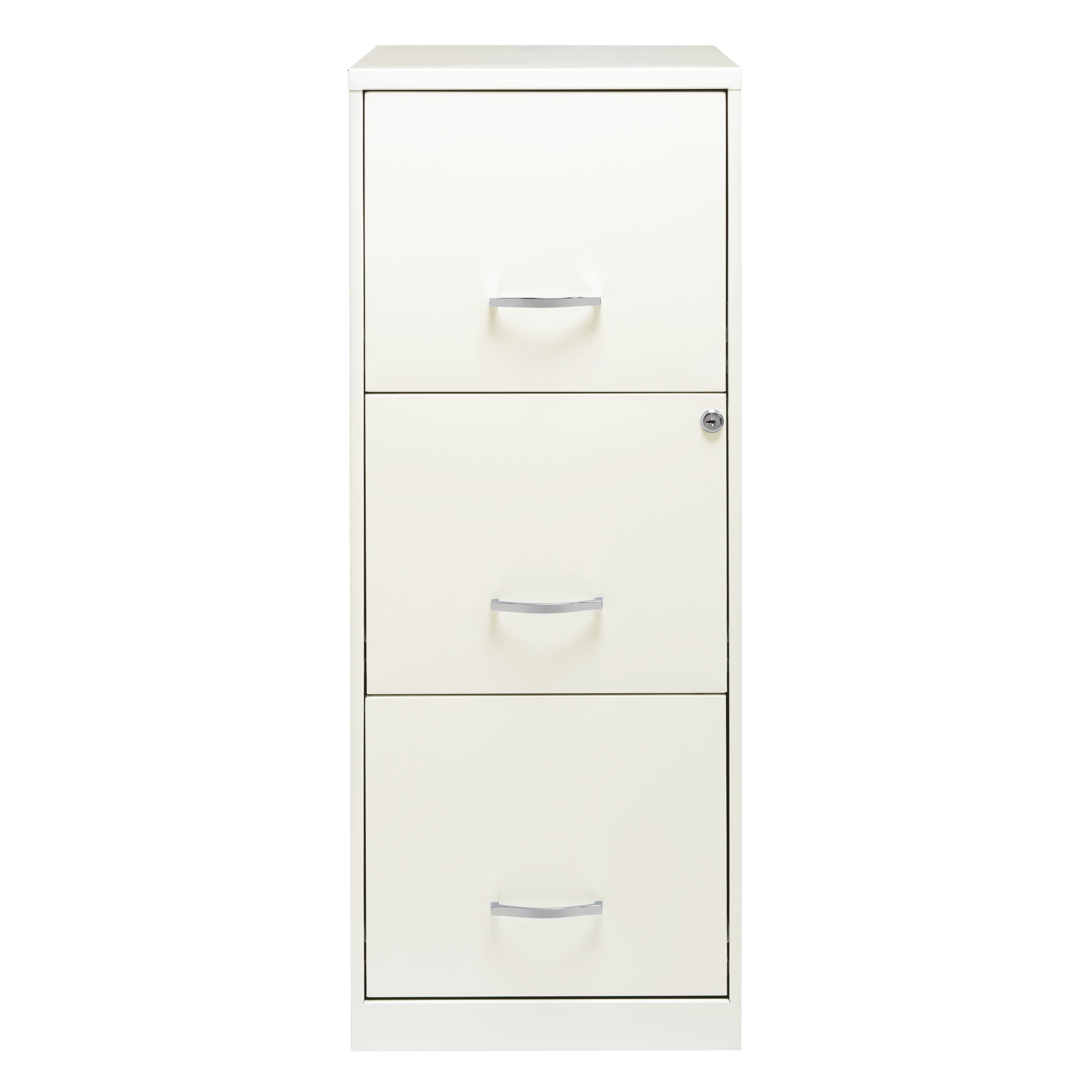 The Three Drawer Metal Vertical File Cabinet is designed for smaller professional offices or home office use. The cabinet features durable steel construction and a smart, efficient design that works well in small spaces. Each drawer features high-sides to accommodate letter-sized hanging files. The drawers are also a perfect storage solution for other office essentials. Using a patented glide suspension, the drawer slides open and close smoothly with a three-quarter drawer extension to prevent tipping. In addition, you can keep your files and possessions secure by using the built-in lock for the top two drawers. The painted steel surface is non-porous and easy to clean. Bring storage and organization to your home or office with this stylish three-drawer file cabinet. Your office supplies and files will always be organized and within reach. Color: Pearl White
