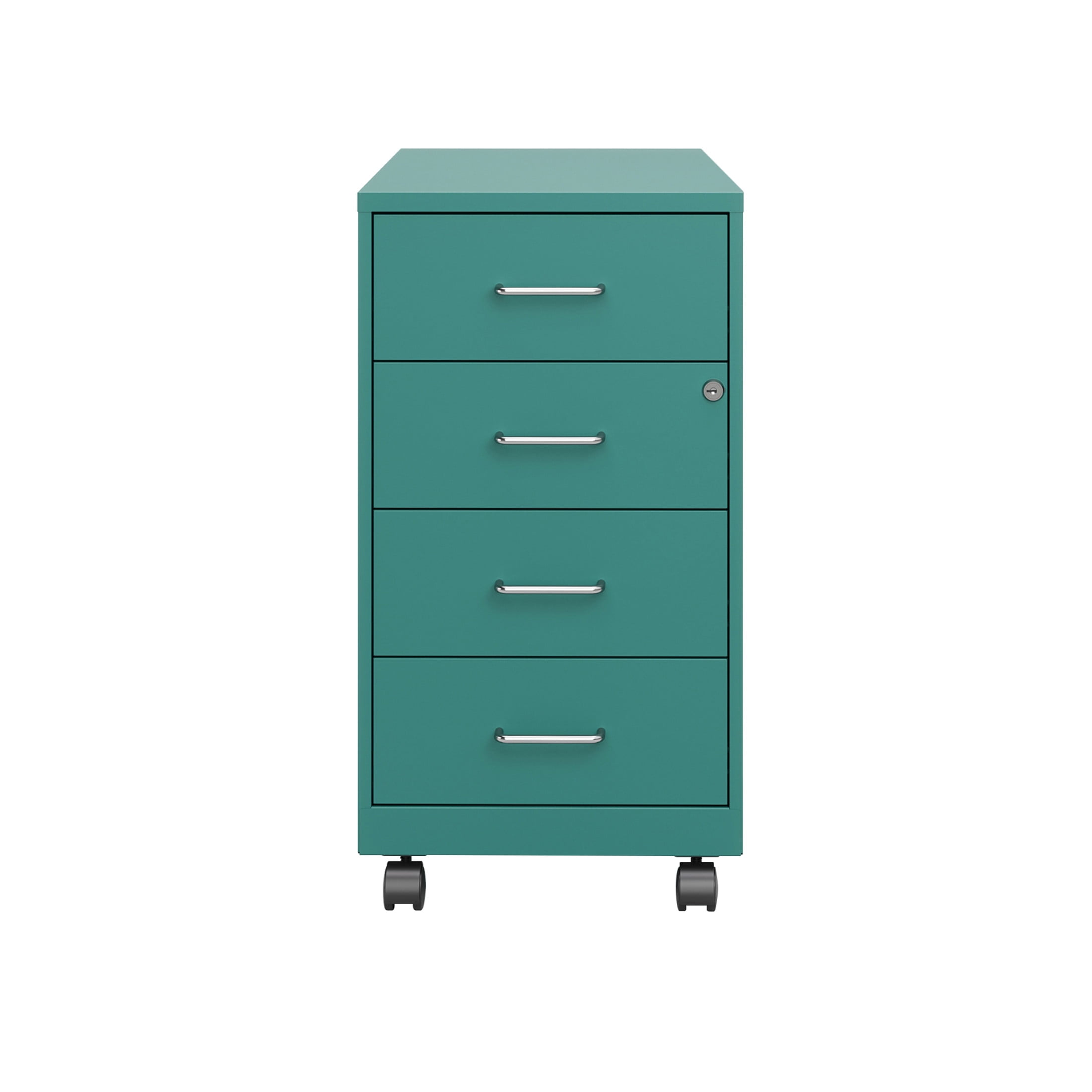 The Four Drawer Metal Organizer File Cabinet is a multi-functional storage solution perfect for files, office supplies, and accessories for your small professional office or home office. Featuring four storage drawers, this file cabinet features steel construction and a smart, efficient design. Our compact filing cabinet works well in small spaces and fits under most work surfaces or office desks. The four accessory drawers are perfect for office storage and organization. The additional wheels that come with this file cabinet are both stylish and functional, making it easy to move around your home or office. Using a patented glide suspension, the drawers have a smooth open and close slide with a three-quarter drawer extension to prevent tipping. In addition, you can keep your files and possessions secure by using the built-in lock for the top two drawers. The painted steel surface is non-porous and easy to clean. Bring organization and function to your home or office with this four-drawer file cabinet. Color: Teal