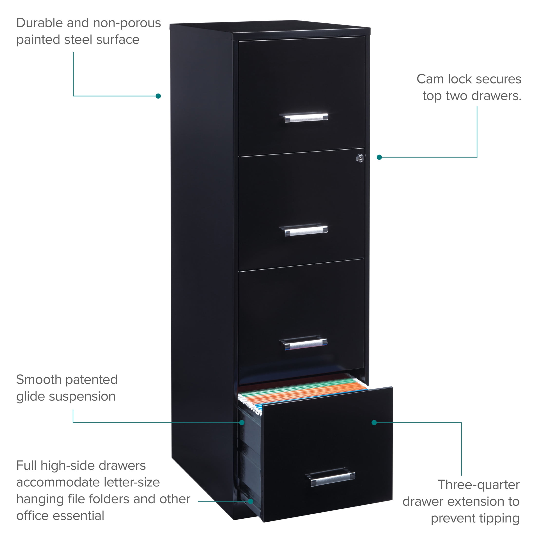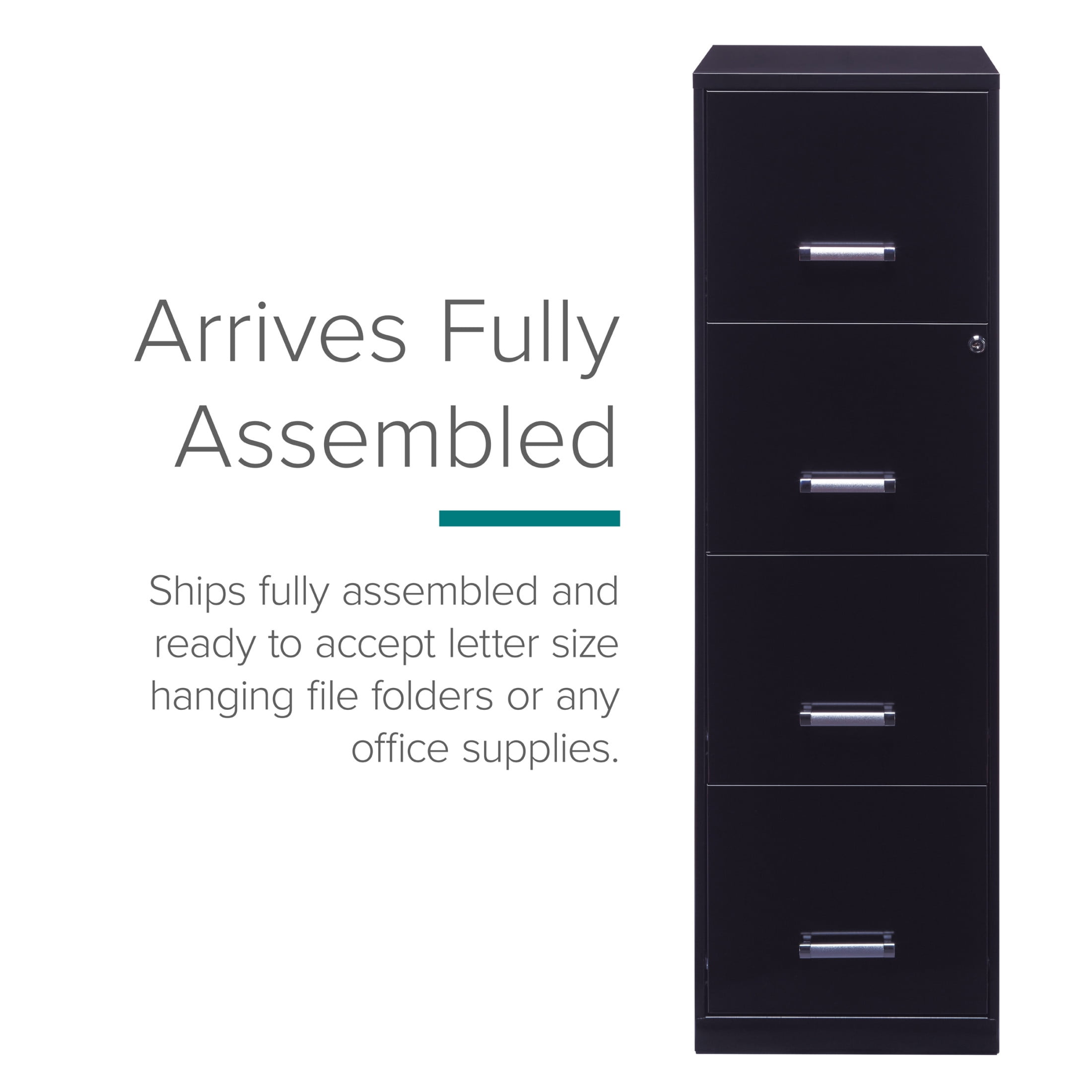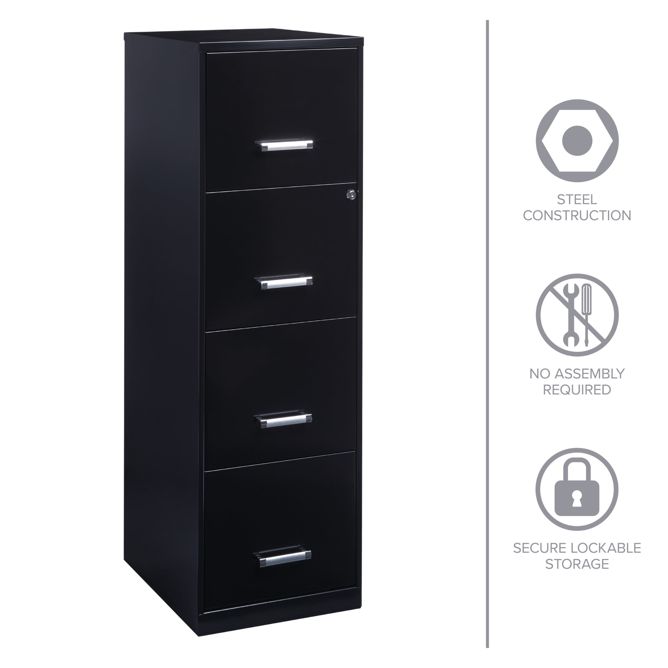 Vertical file drawers accommodate letter-size hanging file folders Full high-side drawers provide storage solutions for other office essentials Smooth patented glide suspension drawer slides Cam lock secures the top two drawers Three-quarter drawer extension Painted steel surface is non-porous and easy to clean Fully assembled welded cabinet. Assembly of the handles required Space Solutions 18″ Deep 4 Drawer Smart Letter Width Vertical File Cabinet, Black