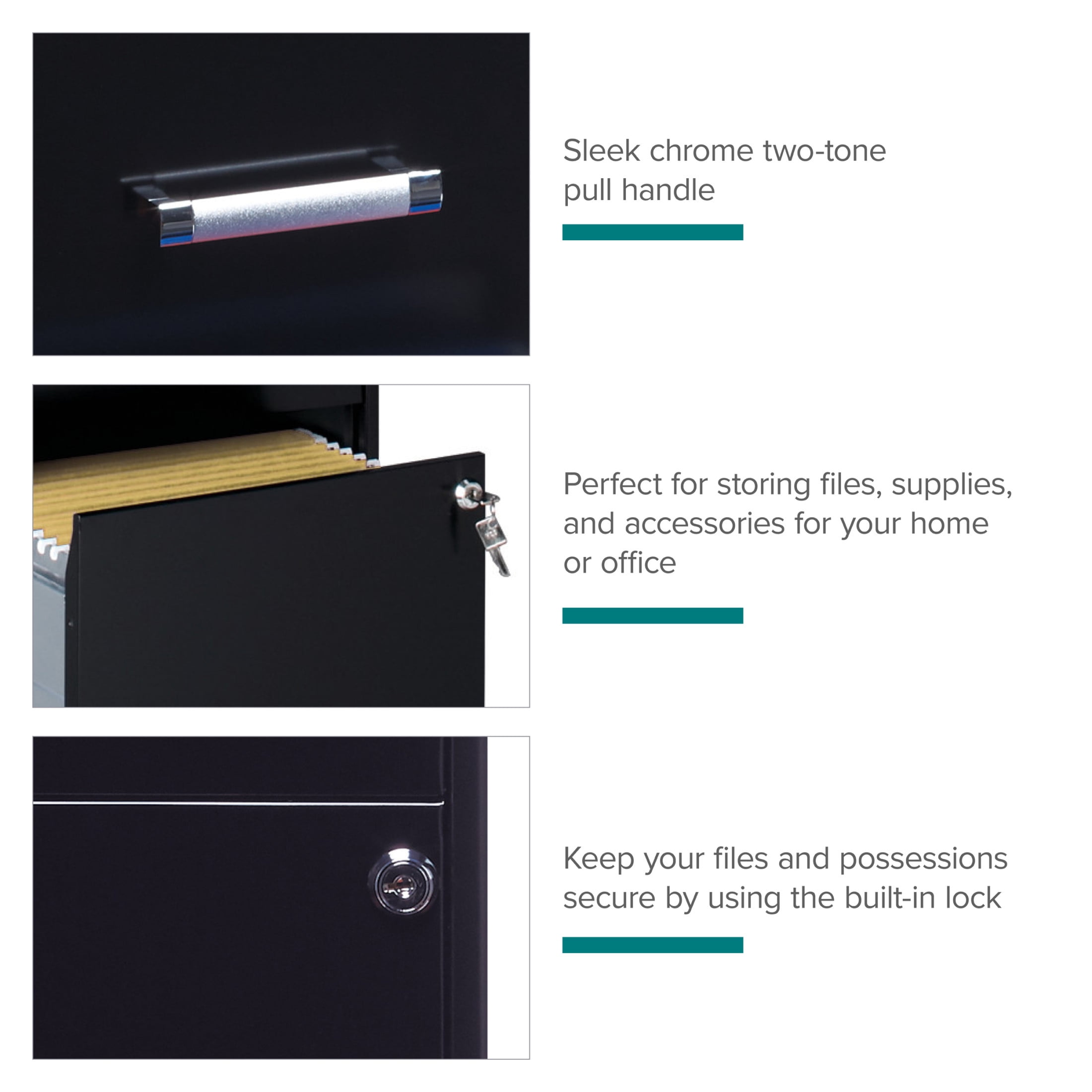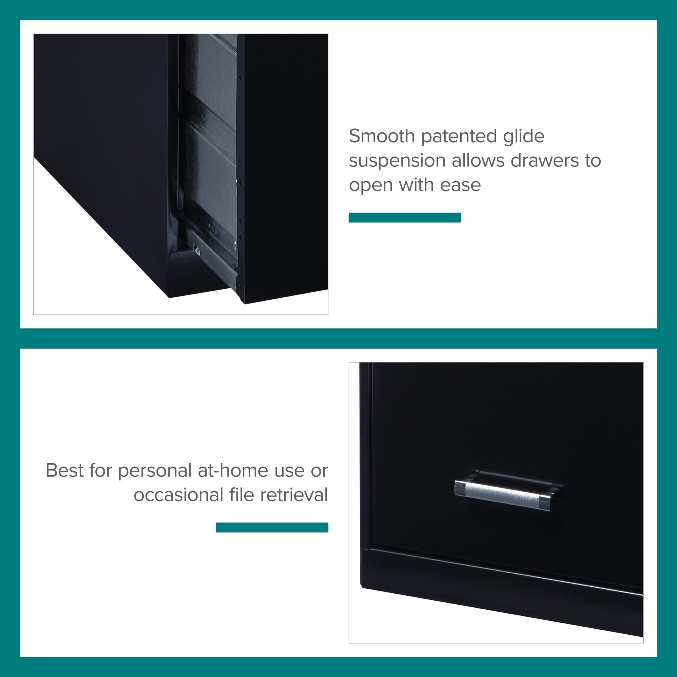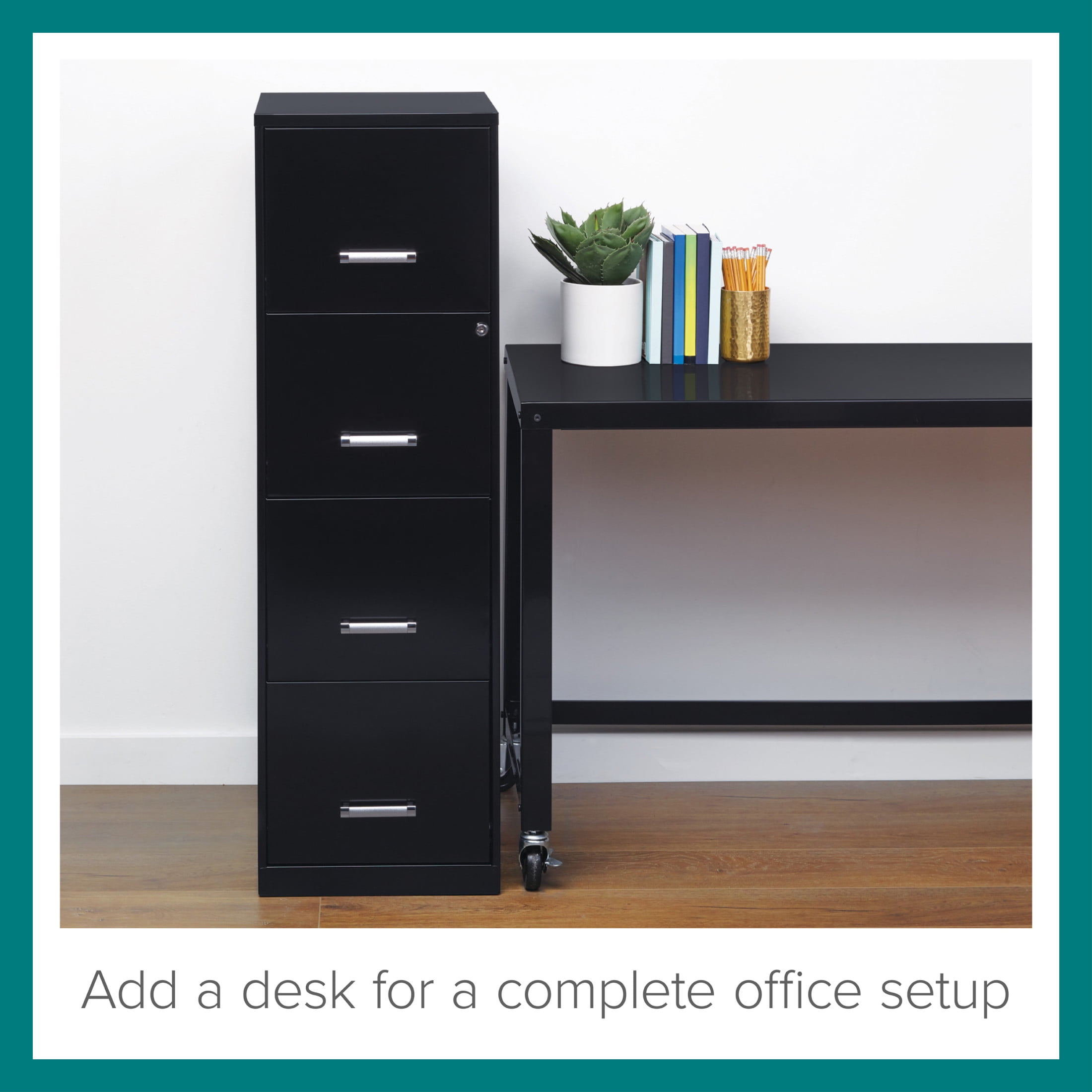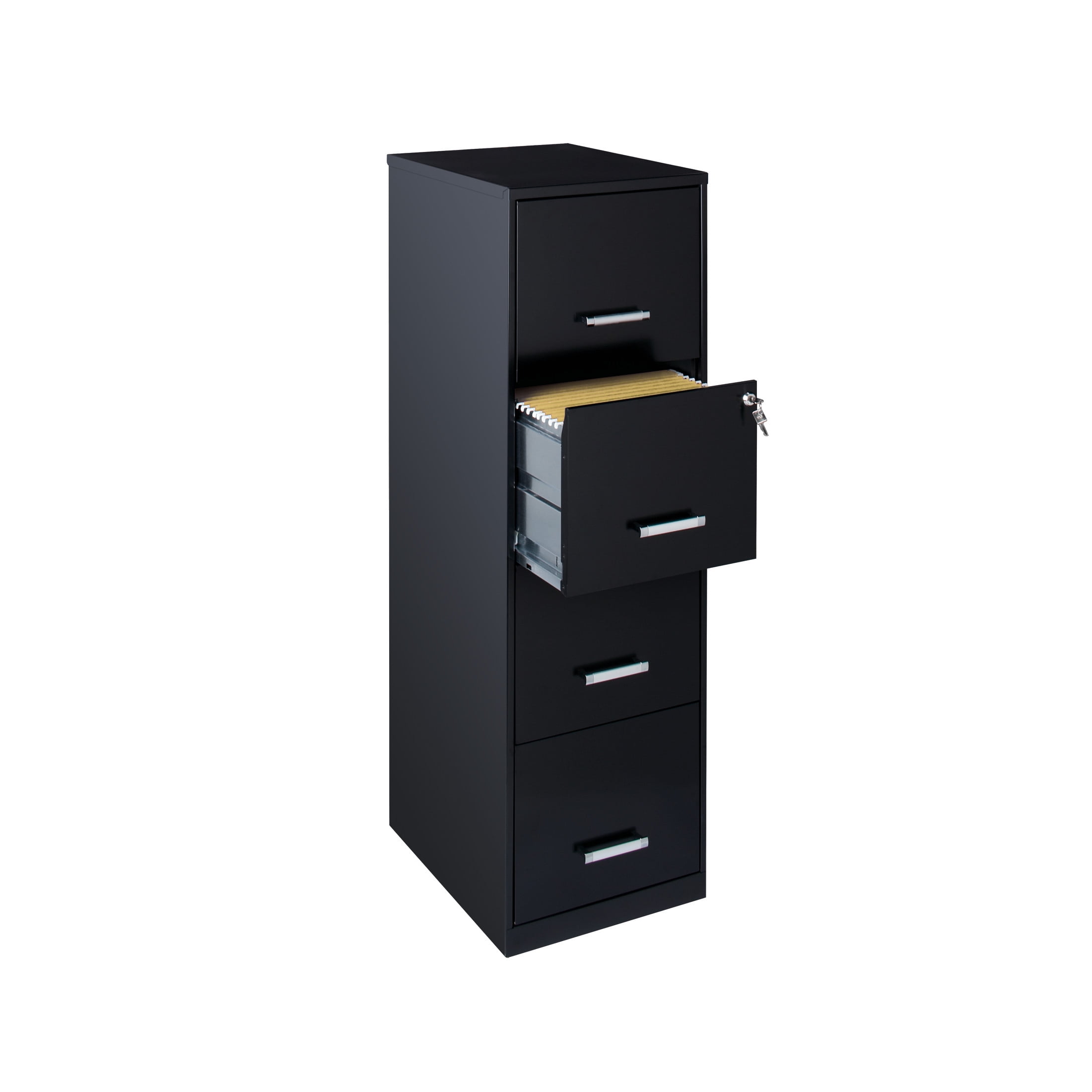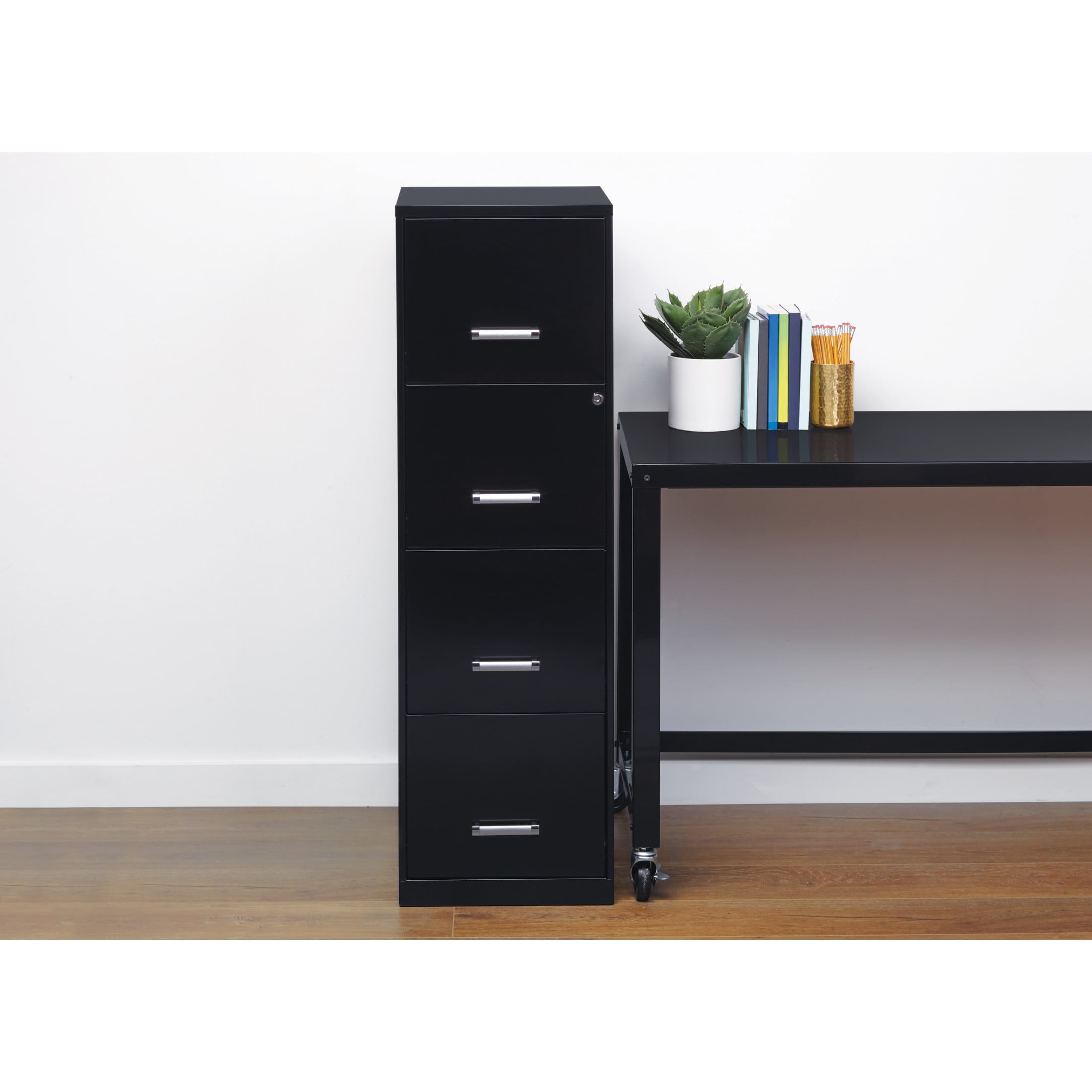 The Four Drawer Metal Vertical File Cabinet is designed for smaller professional offices or home office use. The cabinet features durable steel construction and a smart, efficient design that works well in small spaces. Each drawer features high-sides to accommodate letter-sized hanging files. The drawers are also a perfect storage solution for other office essentials. Using a patented glide suspension, the drawer slides open and close smoothly with a three-quarter drawer extension to prevent tipping. In addition, you can keep your files and possessions secure by using the built-in lock for the top two drawers. The painted steel surface is non-porous and easy to clean. Bring storage and organization to your home or office with this stylish four-drawer file cabinet. Your office supplies and files will always be organized and within reach. Color: Black