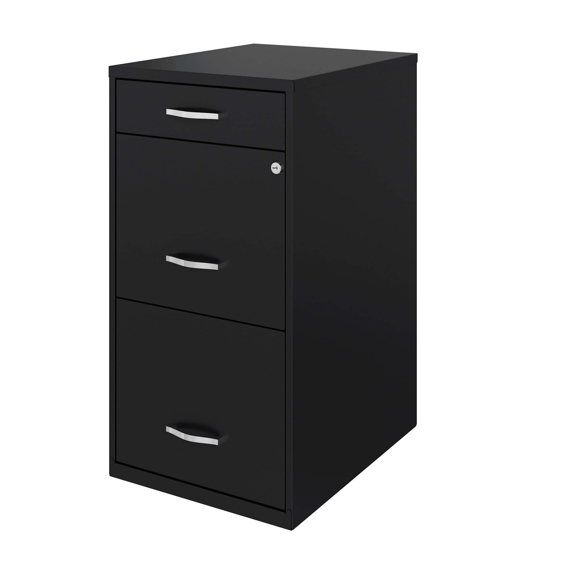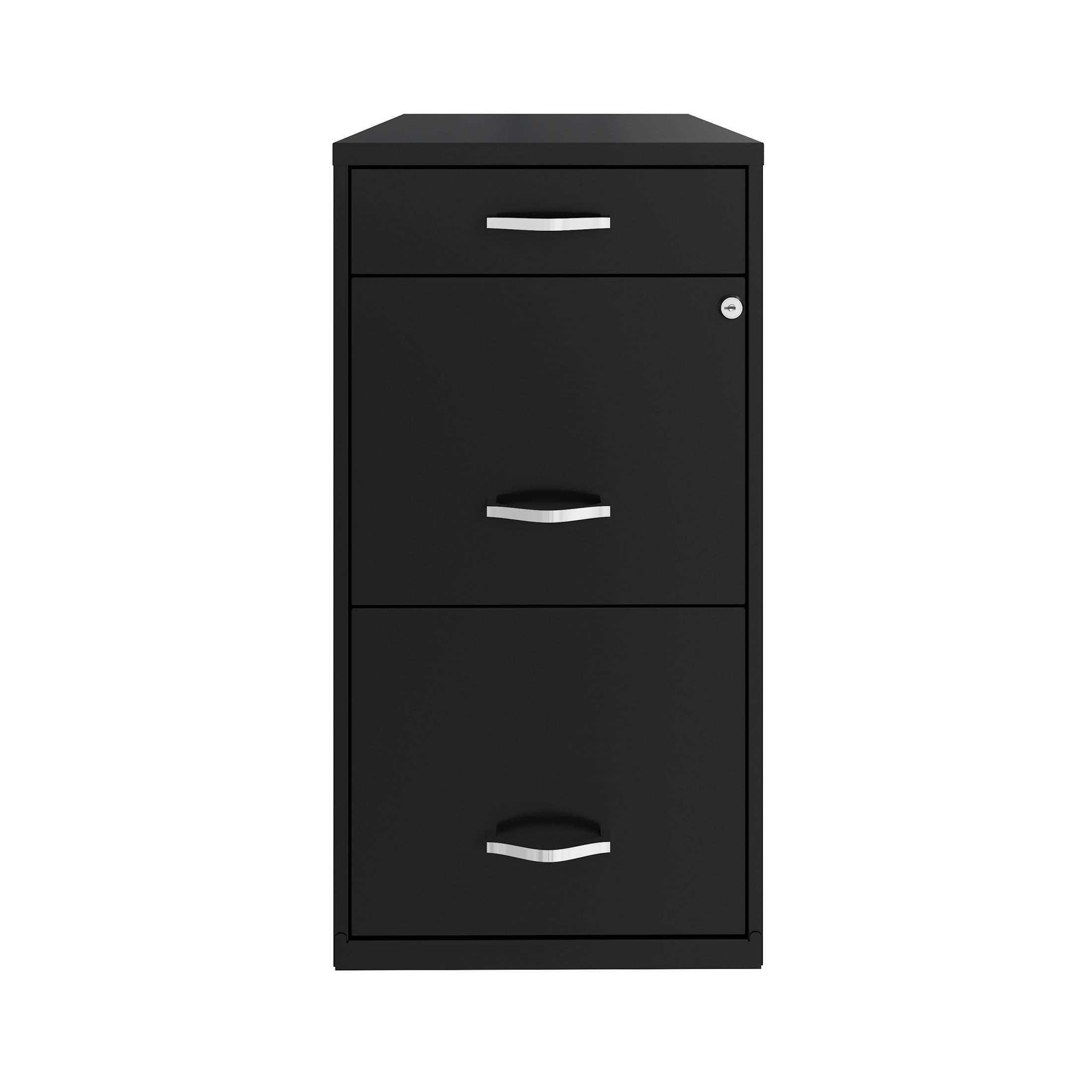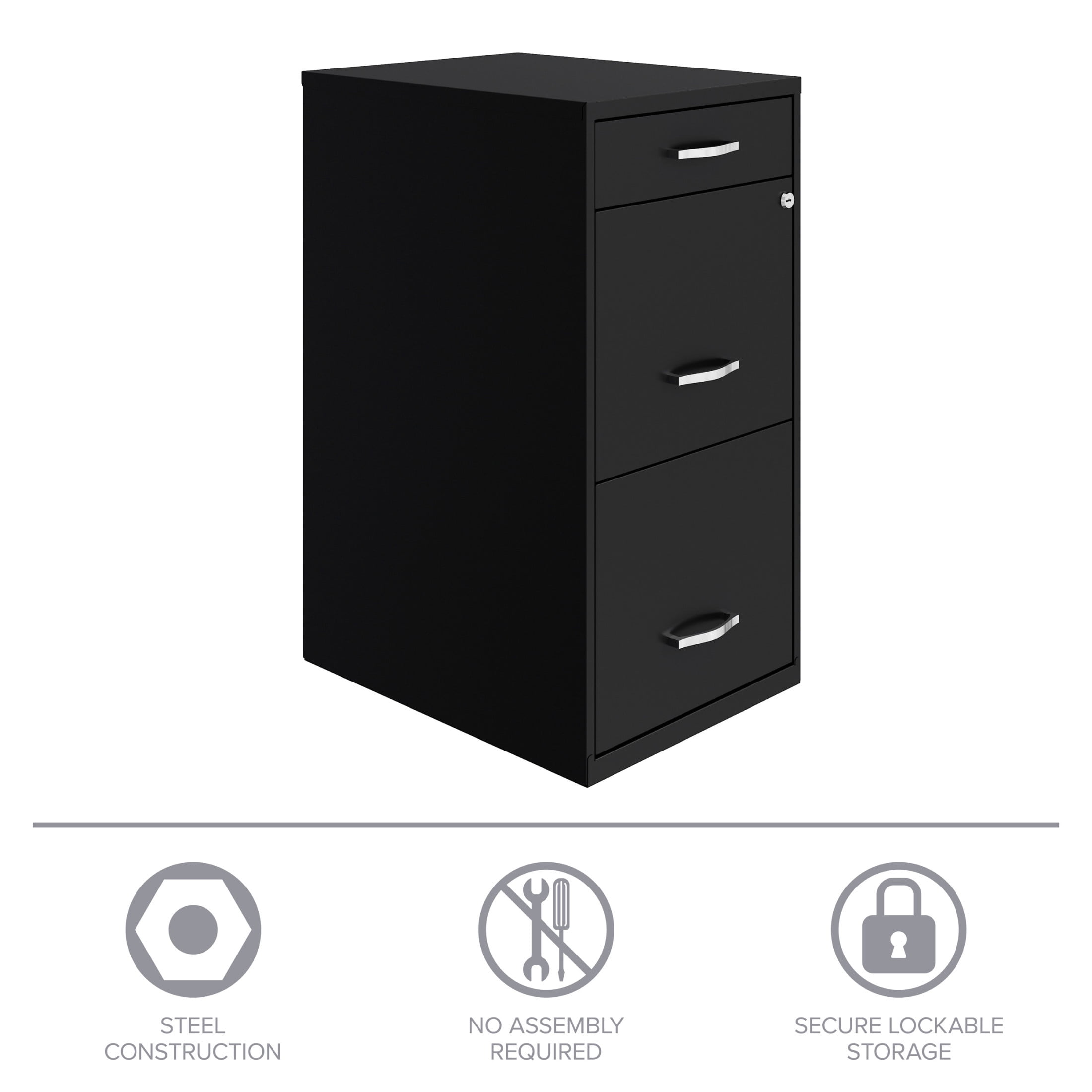 Vertical file drawers accommodate letter-size hanging file folders Vertical file drawers have high-sides allowing storage for other office essentials The top pencil drawer is ideal storage and organizational solution for office supplies Smooth patented glide suspension drawer slides Cam lock secures top two drawers Tucks under most work surfaces and office desks. Painted steel surface is non-porous and easy to clean Fully assembled welded cabinet. Assembly of the handles required Space Solutions 3 Drawer Letter Width Vertical File Cabinet with Pencil Drawer, Black