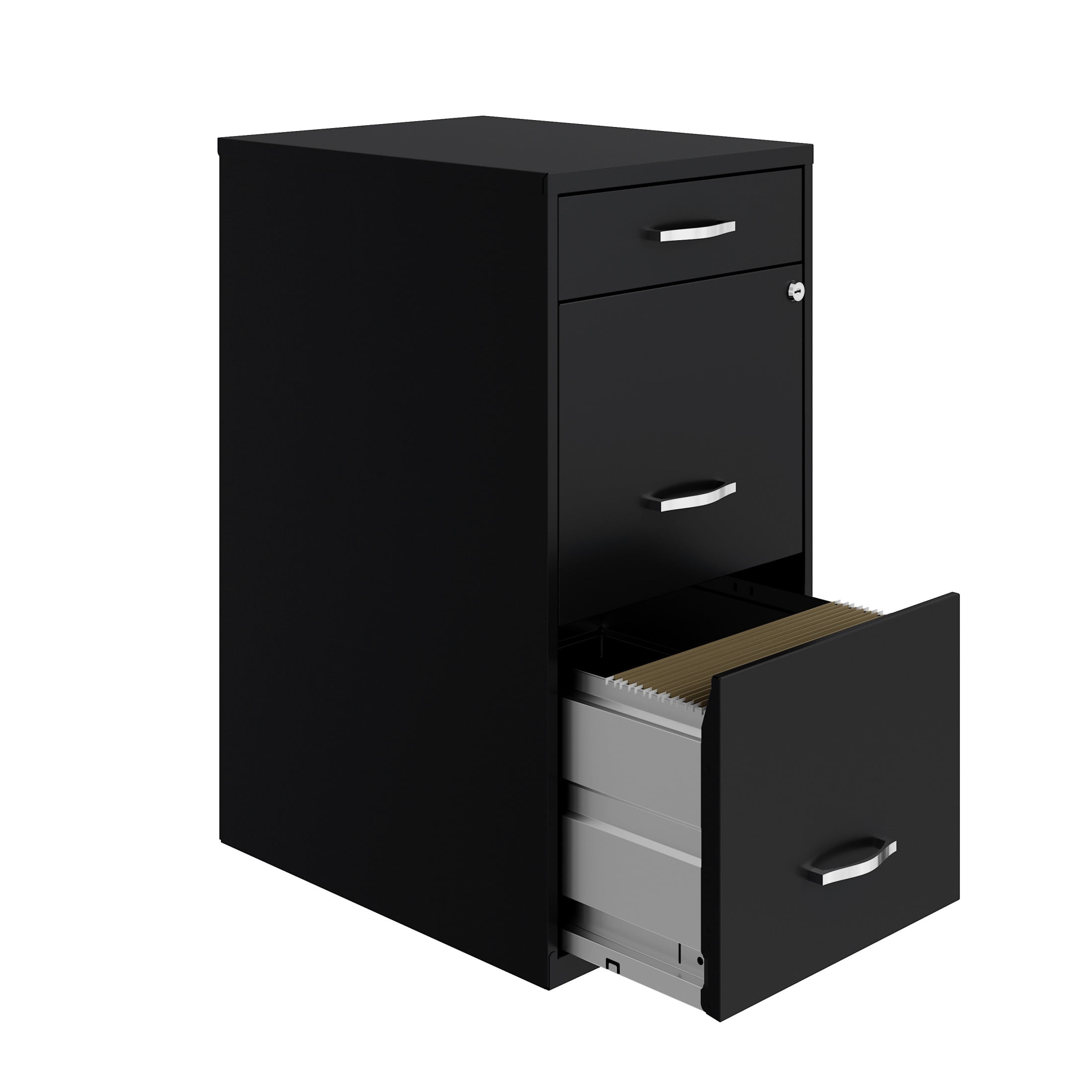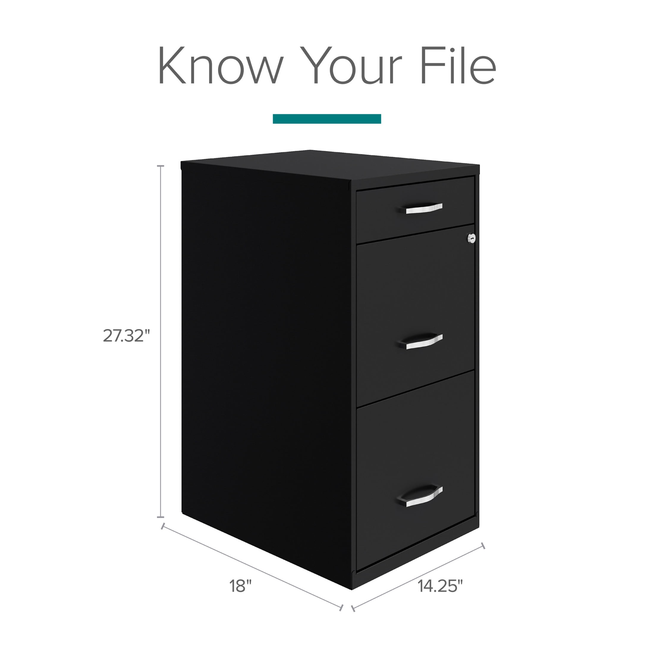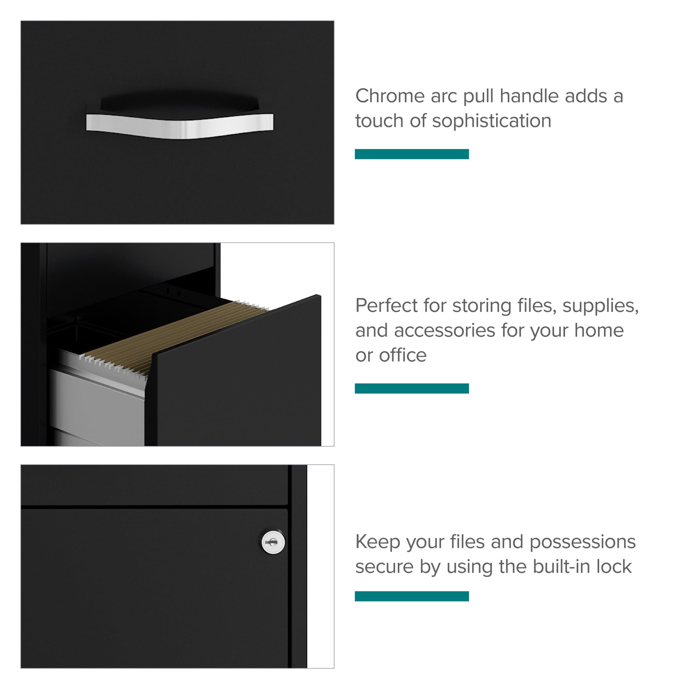 Vertical file drawers accommodate letter-size hanging file folders Vertical file drawers have high-sides allowing storage for other office essentials The top pencil drawer is ideal storage and organizational solution for office supplies Smooth patented glide suspension drawer slides Cam lock secures top two drawers Tucks under most work surfaces and office desks. Painted steel surface is non-porous and easy to clean Fully assembled welded cabinet. Assembly of the handles required Space Solutions 3 Drawer Letter Width Vertical File Cabinet with Pencil Drawer, Black