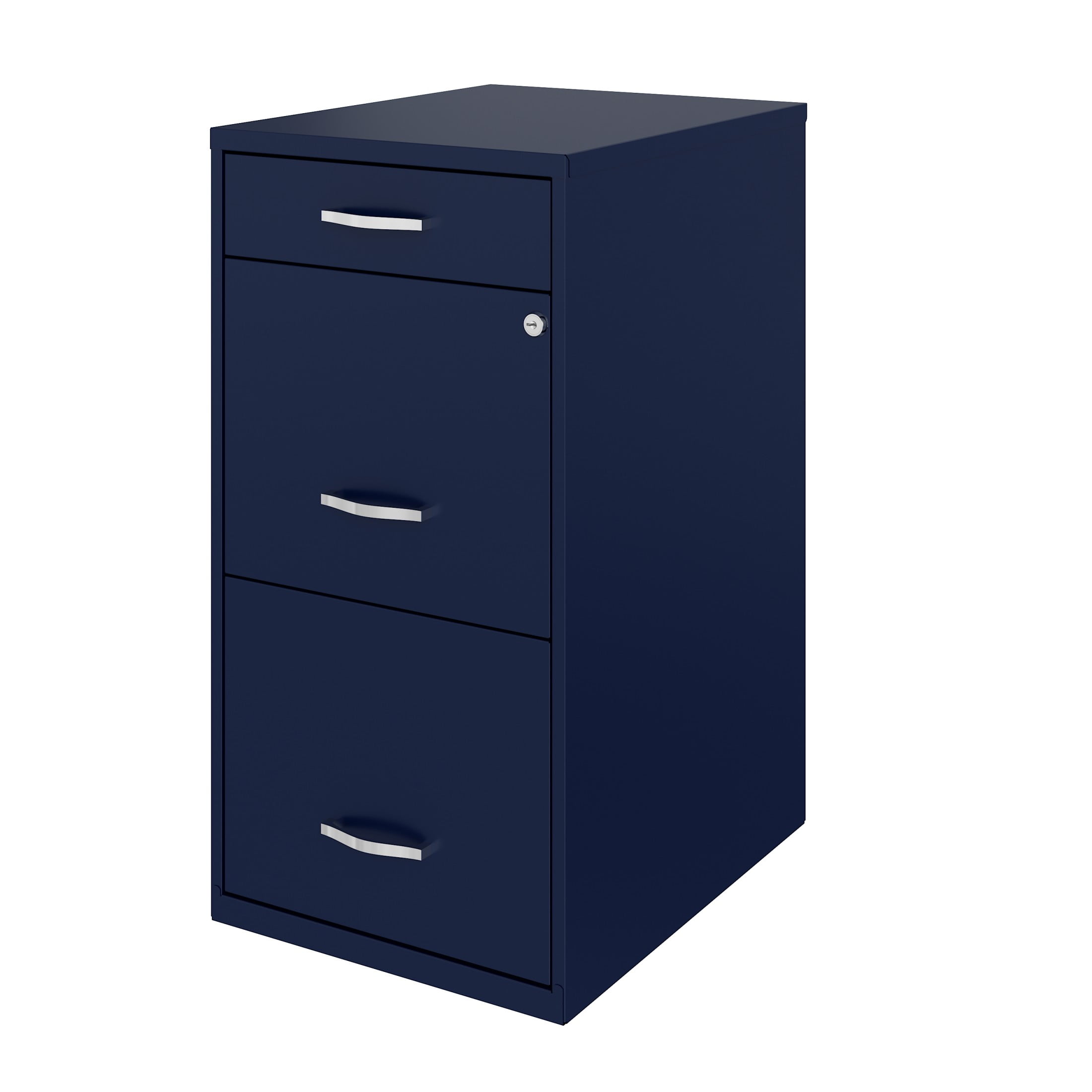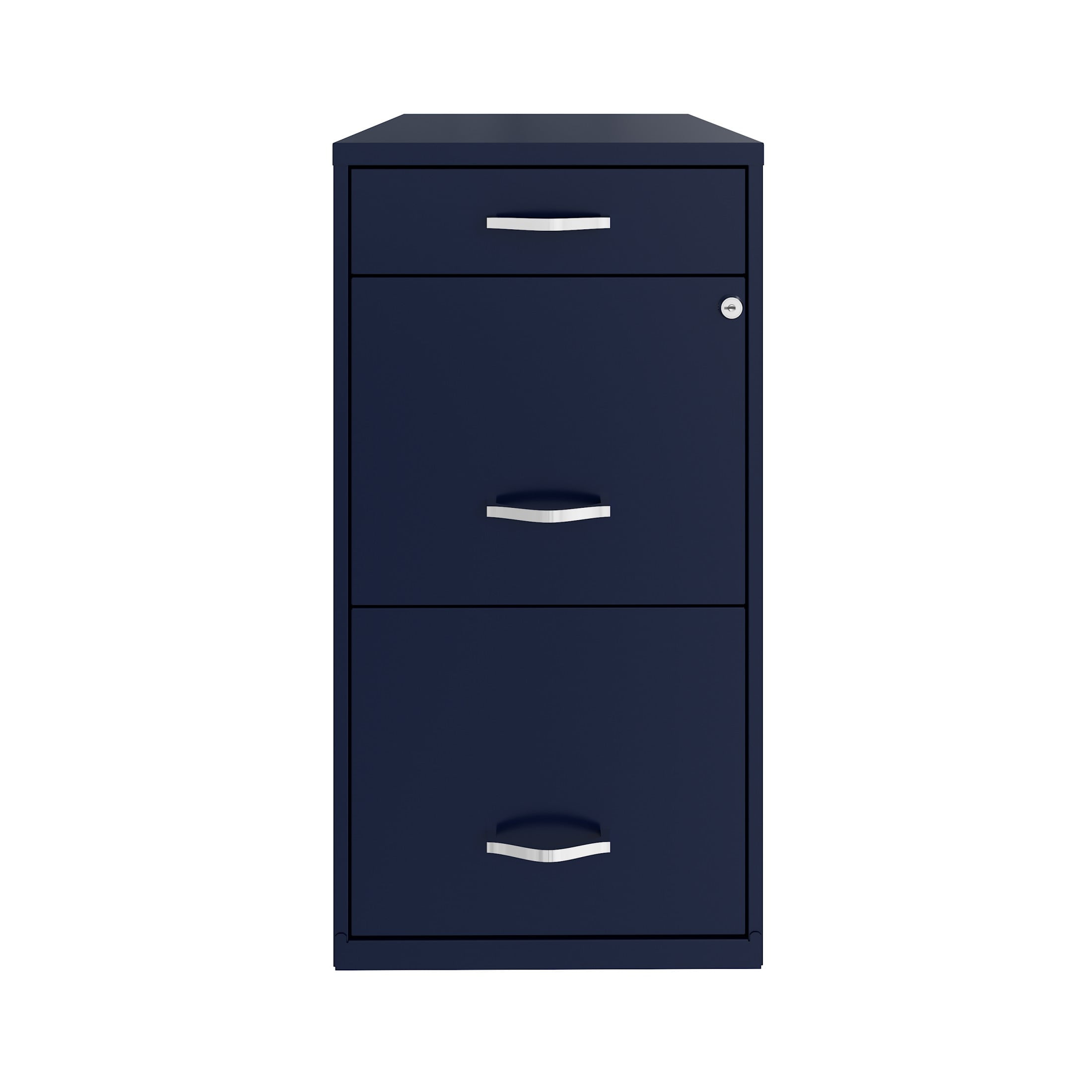 Vertical file drawers accommodate letter-size hanging file folders Vertical file drawers have high-sides allowing storage for other office essentials The top pencil drawer is ideal storage and organizational solution for office supplies Smooth patented glide suspension drawer slides Cam lock secures top two drawers Tucks under most work surfaces and office desks. Painted steel surface is non-porous and easy to clean Fully assembled welded cabinet. Assembly of the handles required Space Solutions 3 Drawer Letter Width Vertical File Cabinet with Pencil Drawer, Navy