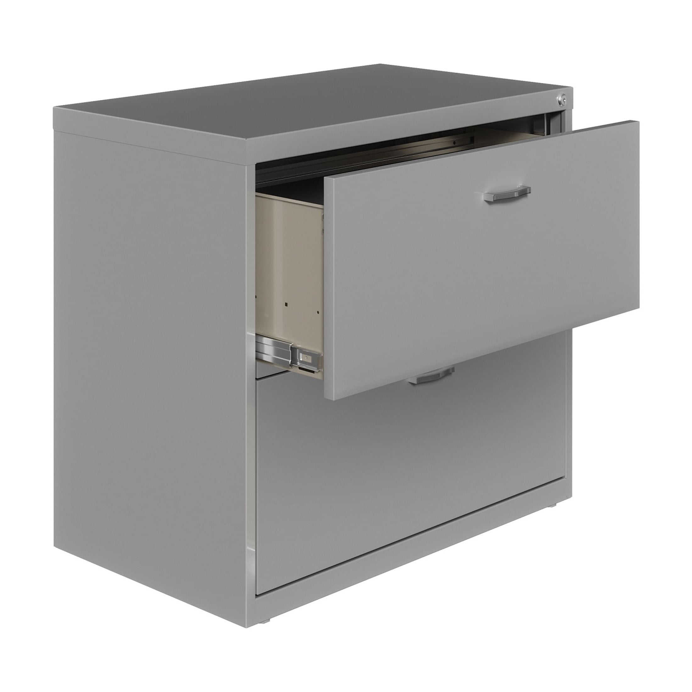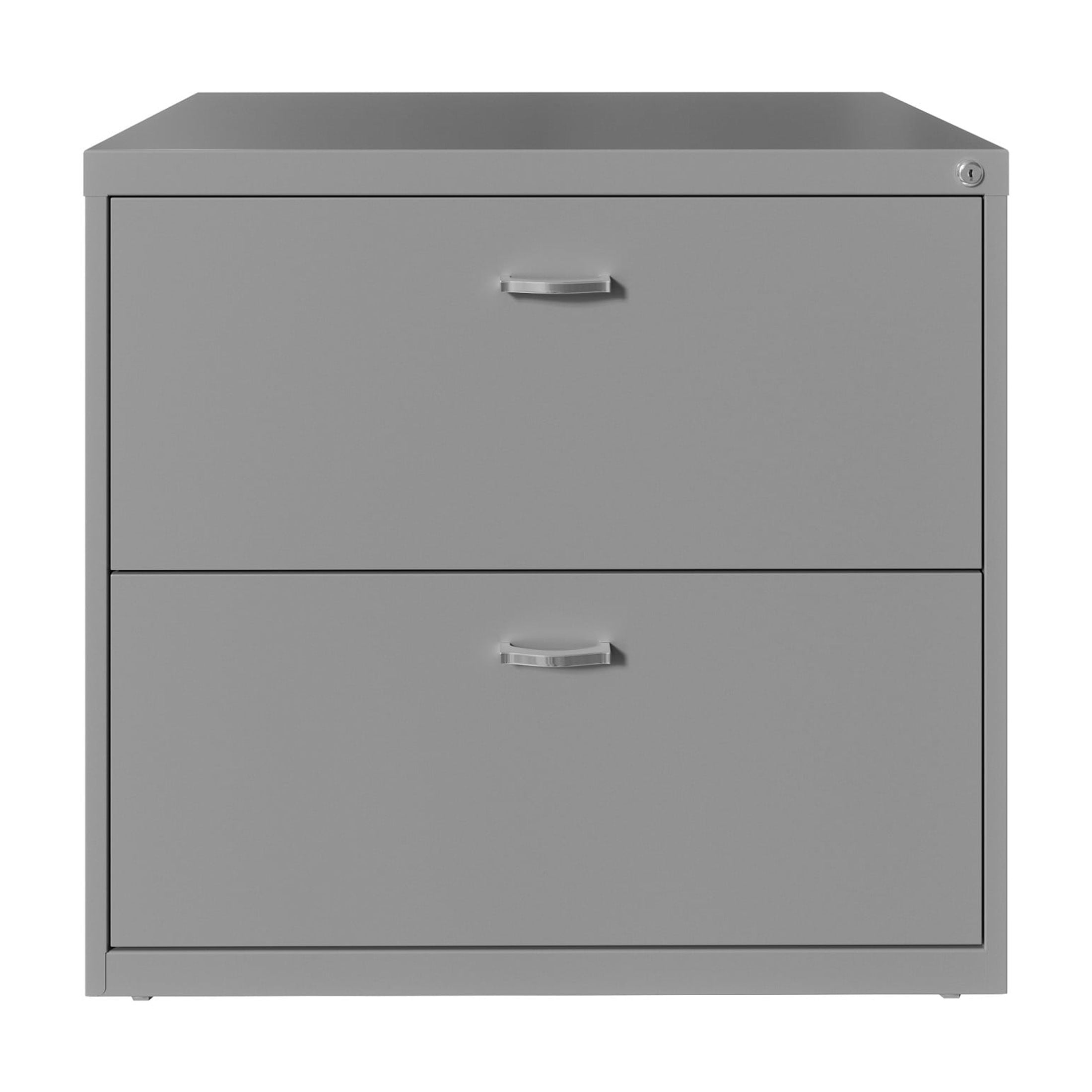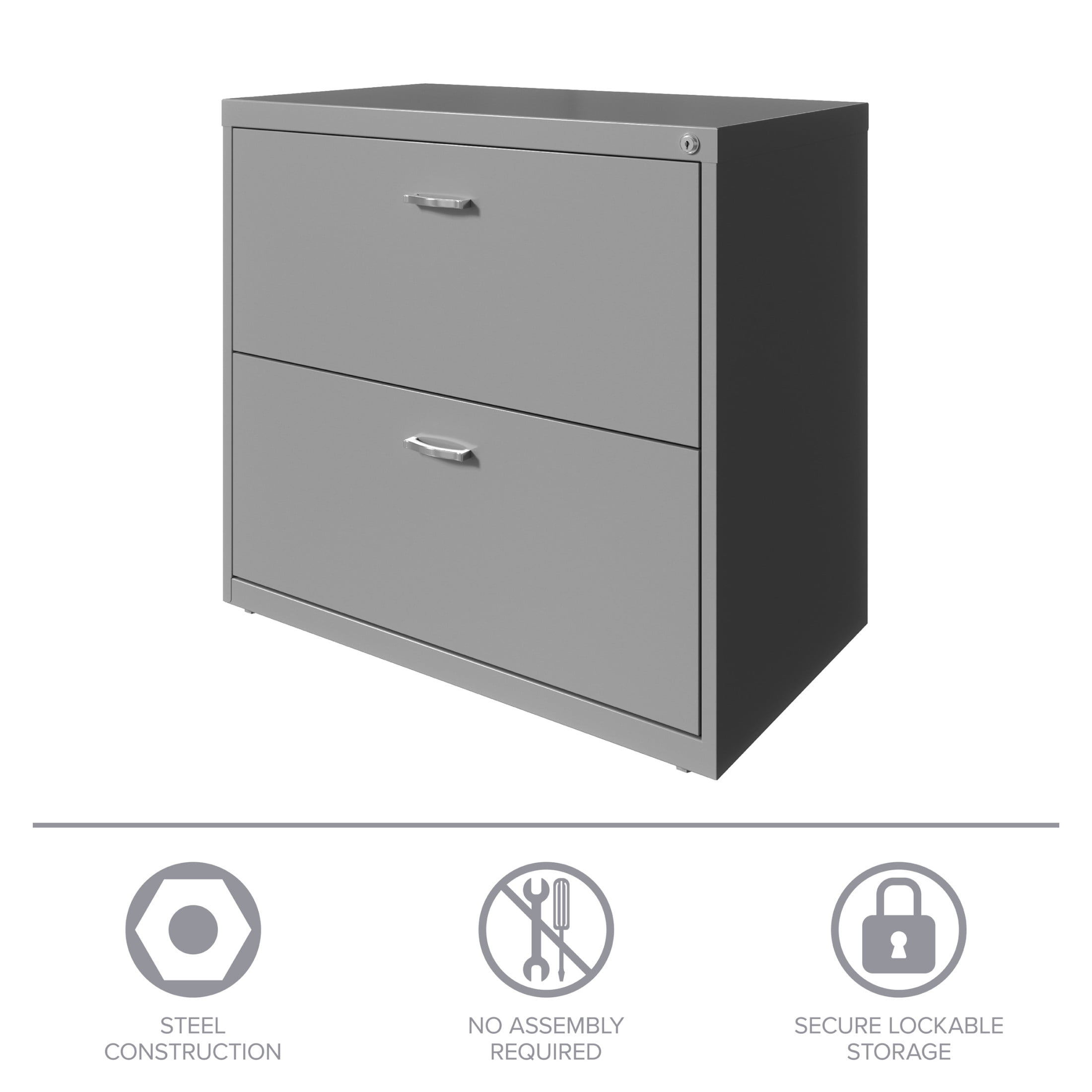 Sleek chrome arc pull handle File cabinet lock secures both drawers Durable, fully assembled steel construction with non-porous surface is easy to clean and disinfect Smooth action with commercial grade ball-bearing suspension drawer slides Interlock allows only one drawer to open at a time for safety Full high-side drawers provide storage for other office essentials Designed for letter width hanging files. Eco-friendly, containing up to 30% recycled material GREENGUARD Gold certified Space Solutions 30 inch Wide 2 Drawer Lateral File Cabinet for Home or Office, Arctic Silver