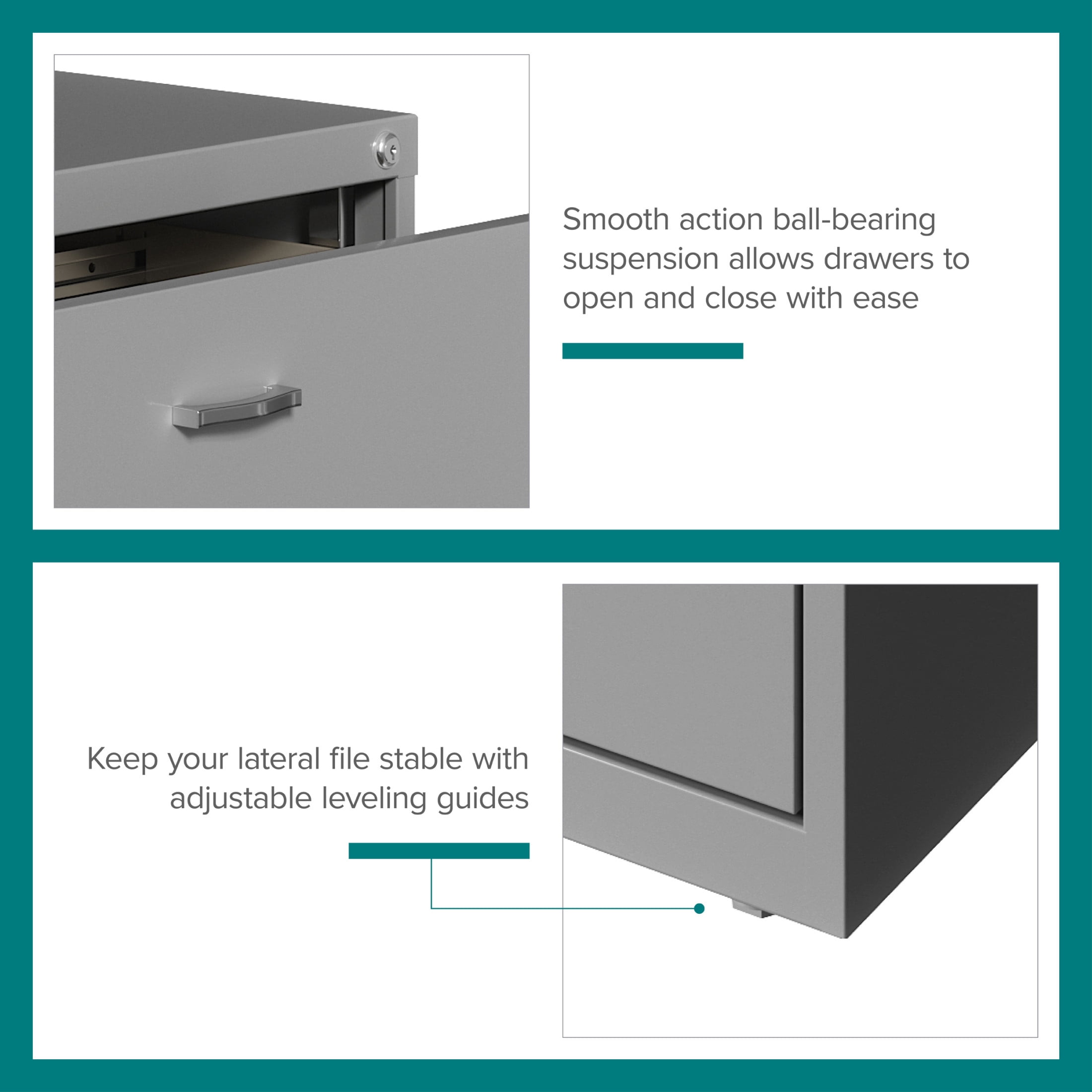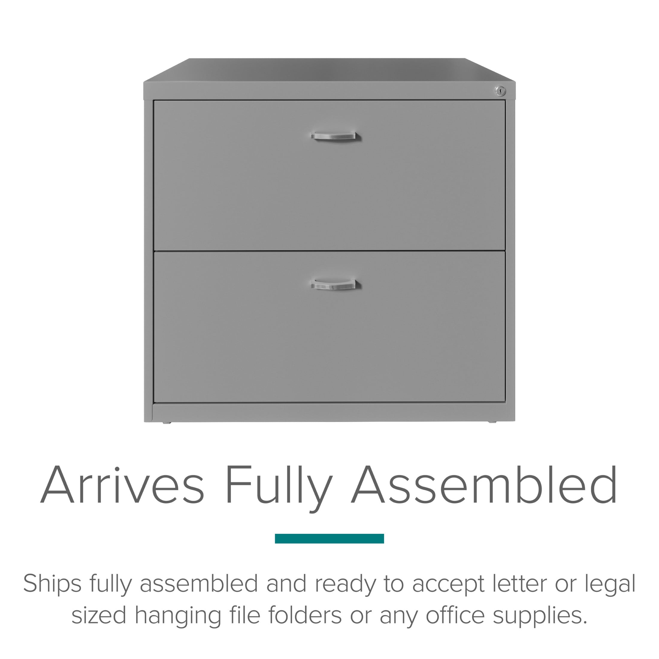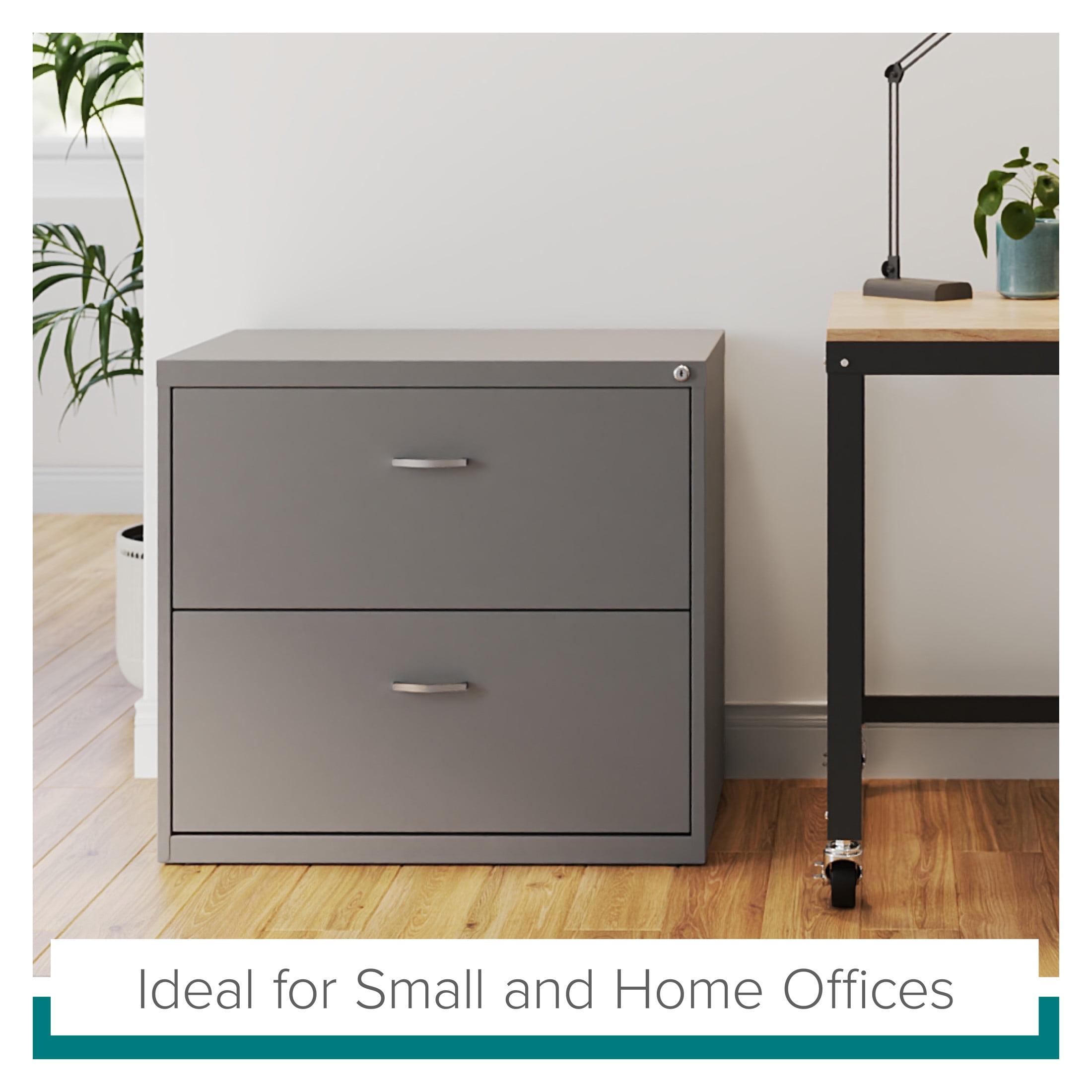 Sleek chrome arc pull handle File cabinet lock secures both drawers Durable, fully assembled steel construction with non-porous surface is easy to clean and disinfect Smooth action with commercial grade ball-bearing suspension drawer slides Interlock allows only one drawer to open at a time for safety Full high-side drawers provide storage for other office essentials Designed for letter width hanging files. Eco-friendly, containing up to 30% recycled material GREENGUARD Gold certified Space Solutions 30 inch Wide 2 Drawer Lateral File Cabinet for Home or Office, Arctic Silver