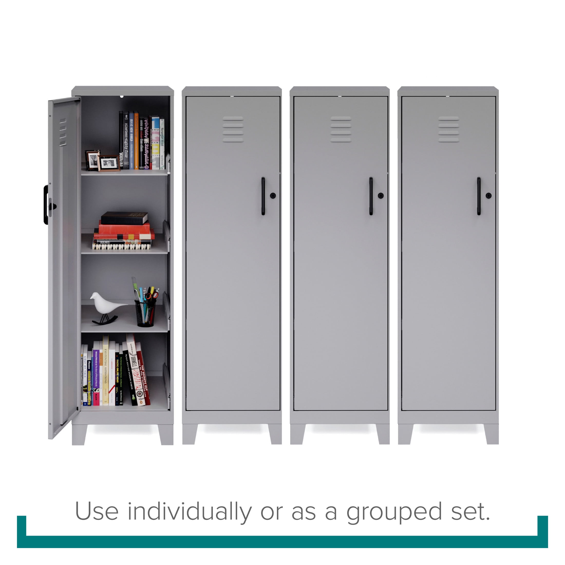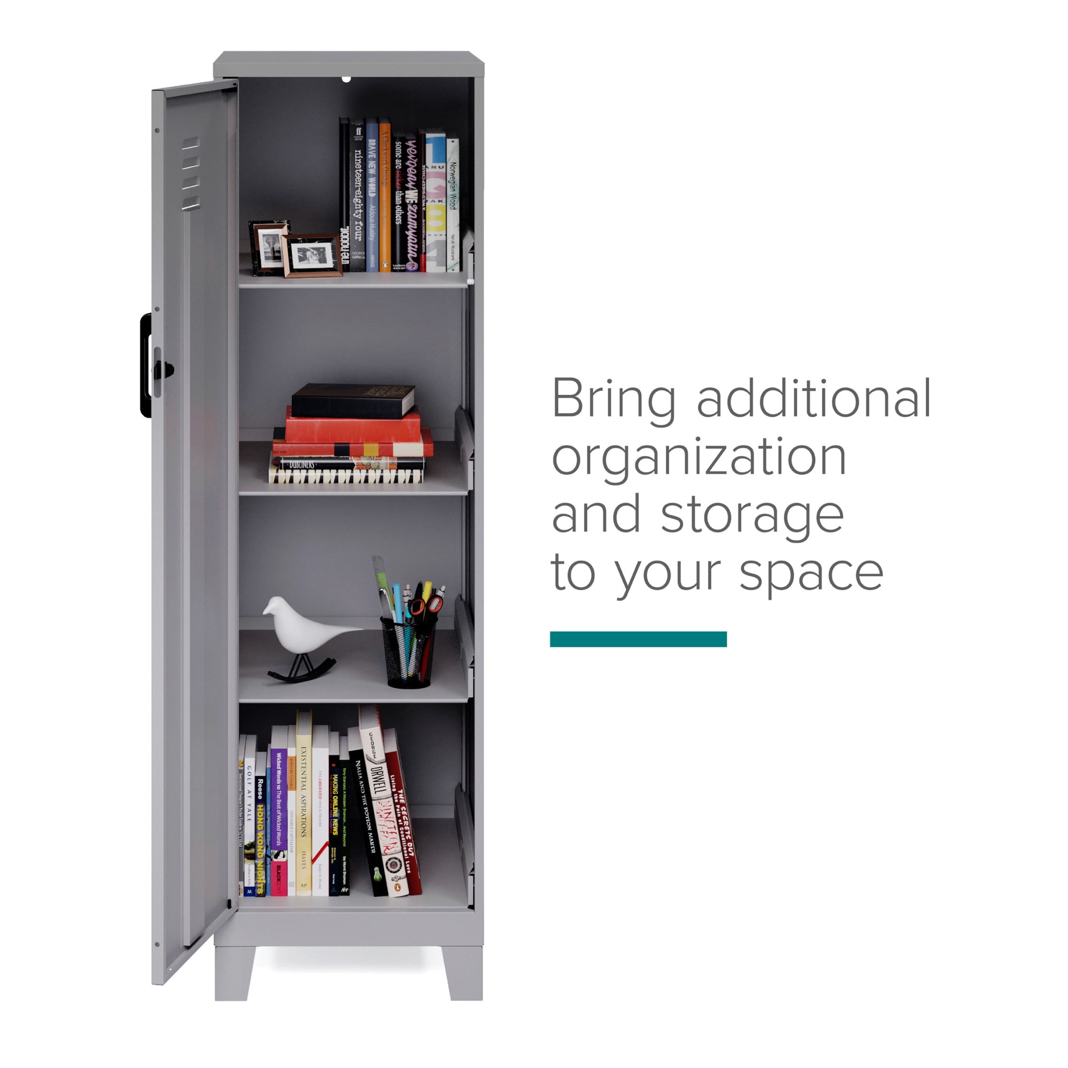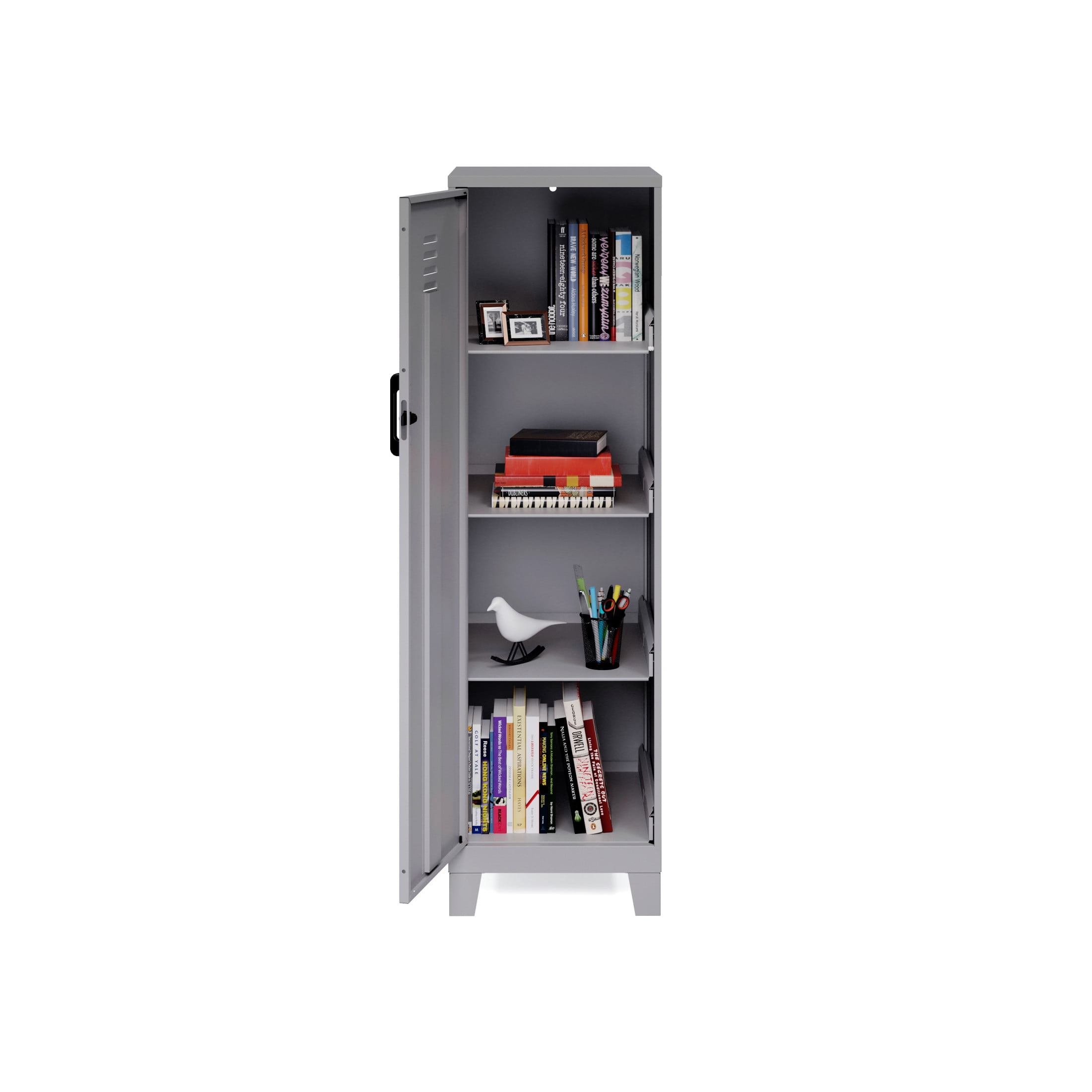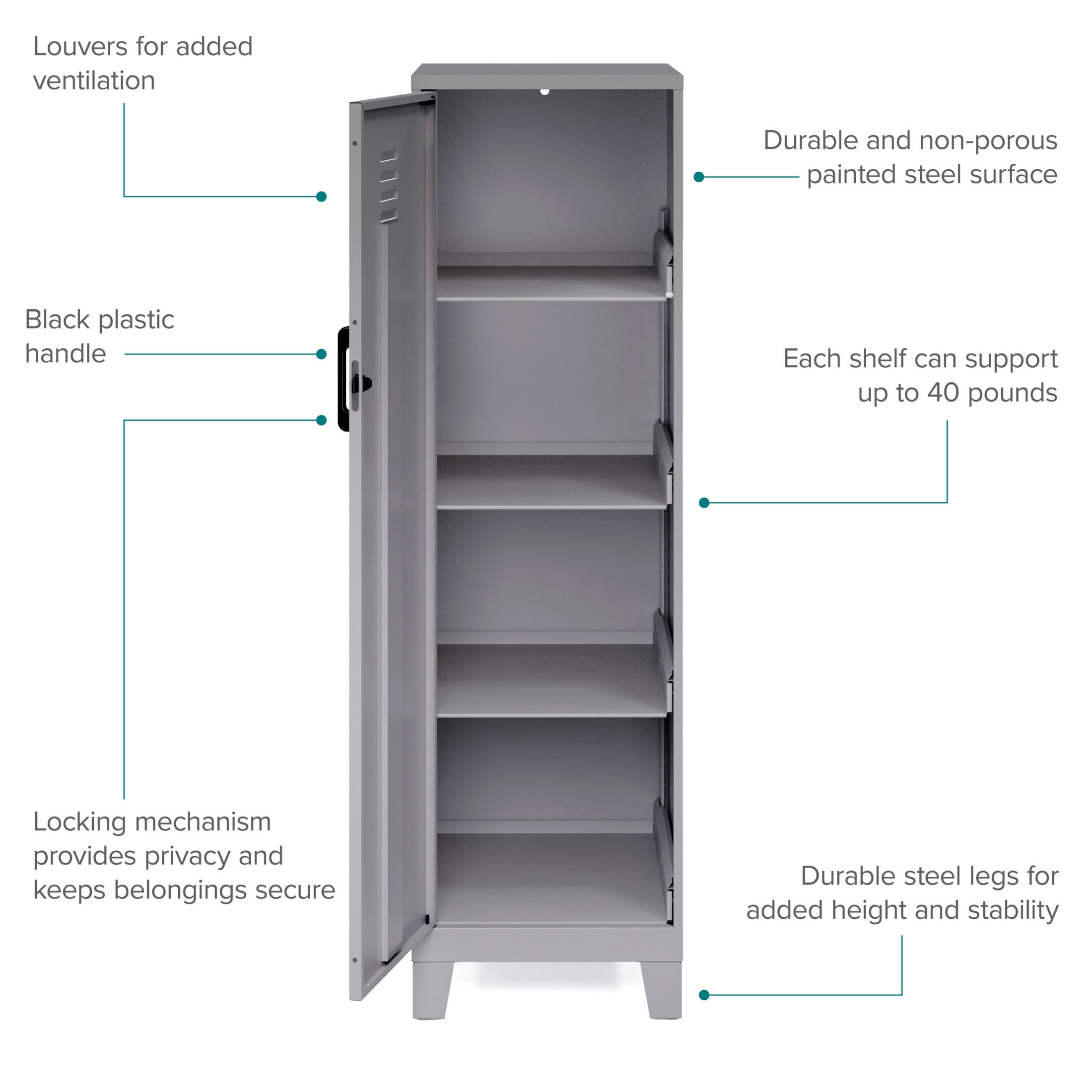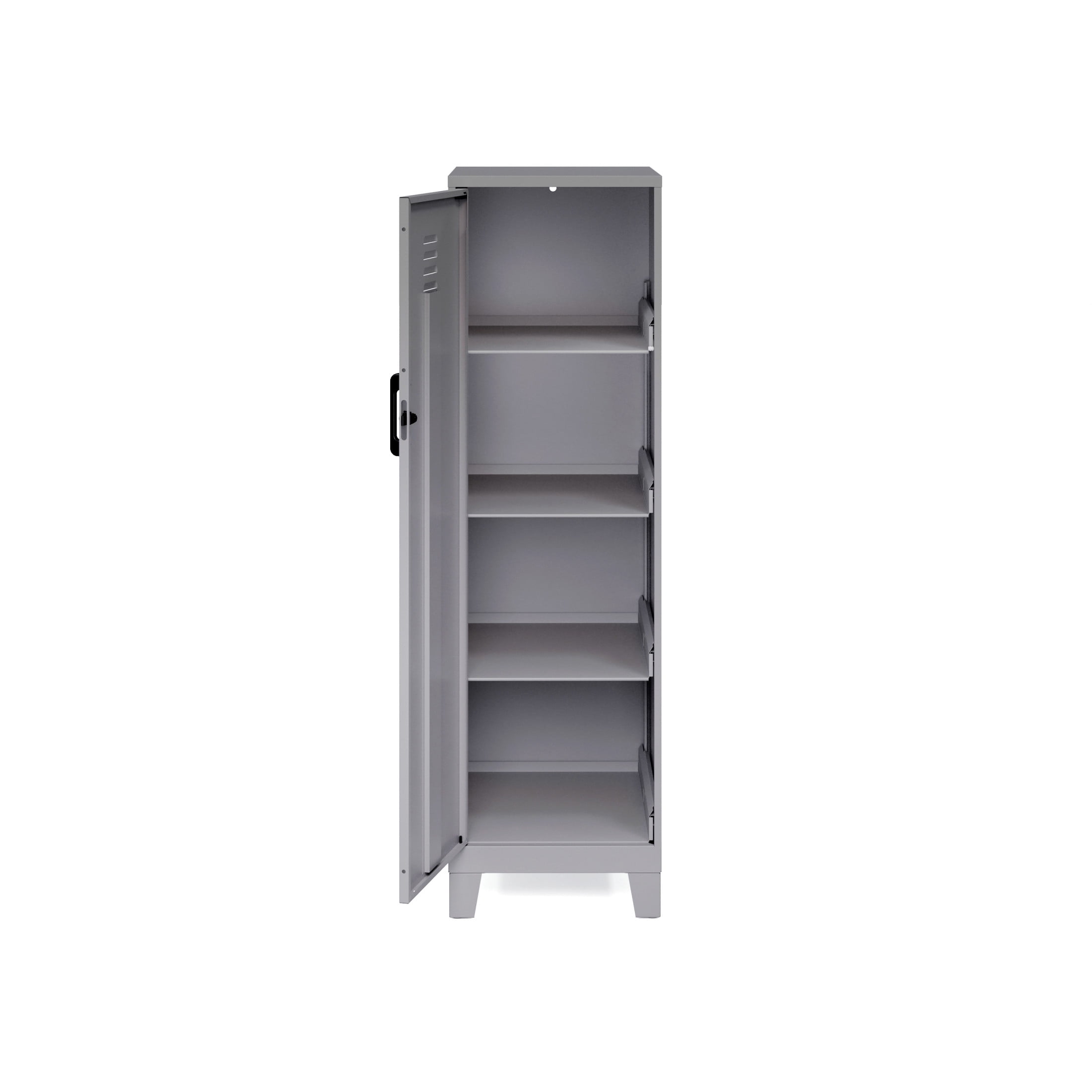 Storage locker comes with a hinged door and a locking mechanism to provide privacy and keep your belongings safe The 4 built-in shelves are perfect for stashing schoolwork, organizing work supplies, and putting away sporting equipment, toys, and games Each shelf can support up to 40 pounds to meet all your different needs Painted steel won’t warp and it is non-porous and easy to clean. Welded steel construction provides strength and support. Fully assembled welded cabinet. Assembly of the handles and optional legs required The personal locker is is GREENGUARD GOLD Certified for indoor air quality. ANSI-BIFMA rated for small office and home office safety standards Space Solutions 53.38 inch High 4 Shelf Storage Locker Cabinet, Welded Metal, Fully Assembled, Vented Door, 3 inch Riser Legs, Arctic Silver
