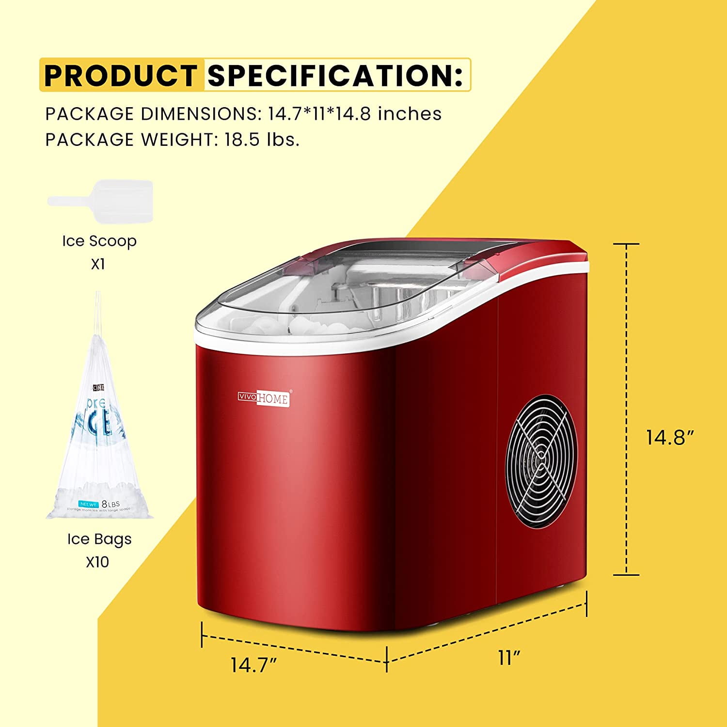 SPECSTAR Upgraded Portable Countertop Ice Maker We now present an upgraded model of portable countertop ice maker! The new ice maker has improved its functionality in almost every way to provide an easier and smoother user experience. Enjoy fresh ice wherever you go with this portable ice maker! 27 Lbs/24h Faster And More Ice Cubes Round Bullet-shaped ice that is smooth and not easy to melt. Mega See-Through Window Provide you with a clear and convenient view of the ice-making process Self-cleaning Function Long-press the “CLEAN” button for 5 seconds and it will start self-cleaning.(A clean takes 30 minutes) 40 dB Quiet Running With an exhaust cooling function, the working process is efficient and quiet. Ice Bags Provided The package comes with 10 pcs of ice bags, so you can use them foe multiple occasions. Product and Package information Attention: Please do not turn the ice maker upside down to drain the water! Material: ABS Power: 115V/60Hz Ice Making Current: 1.7A Ice Harvest Current: 2.0A Refrigerant: R600a 0.81z/23g Pressure (High/Low): 290/88Psig Vesicant: C5H2 Dimensions: 14.7 x 11 x 14.8 inches Item Weight: 16.9 lbs. Capacity: 27lbs/day Note: Please move ice from the ice maker to the refrigerator to keep ice from melting.