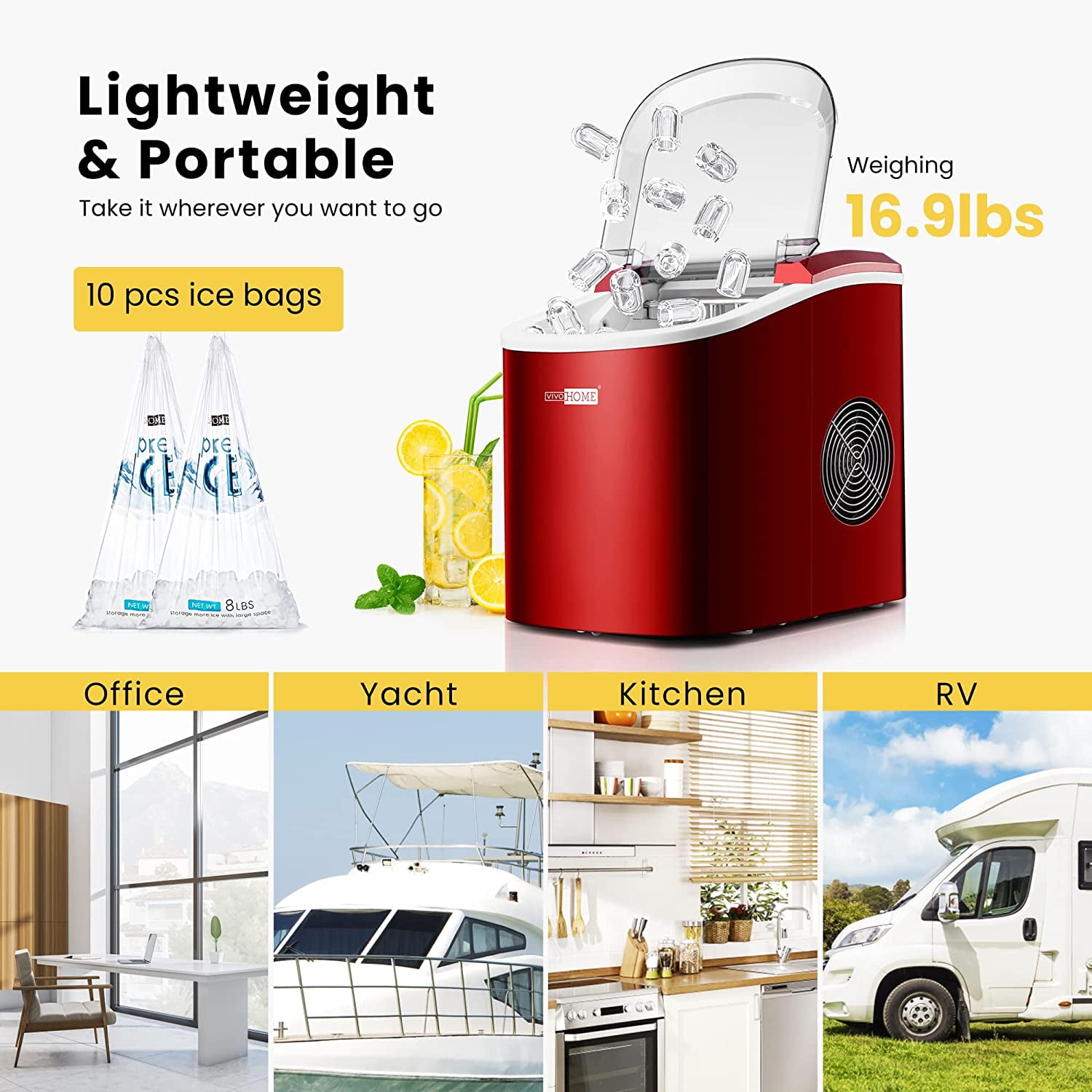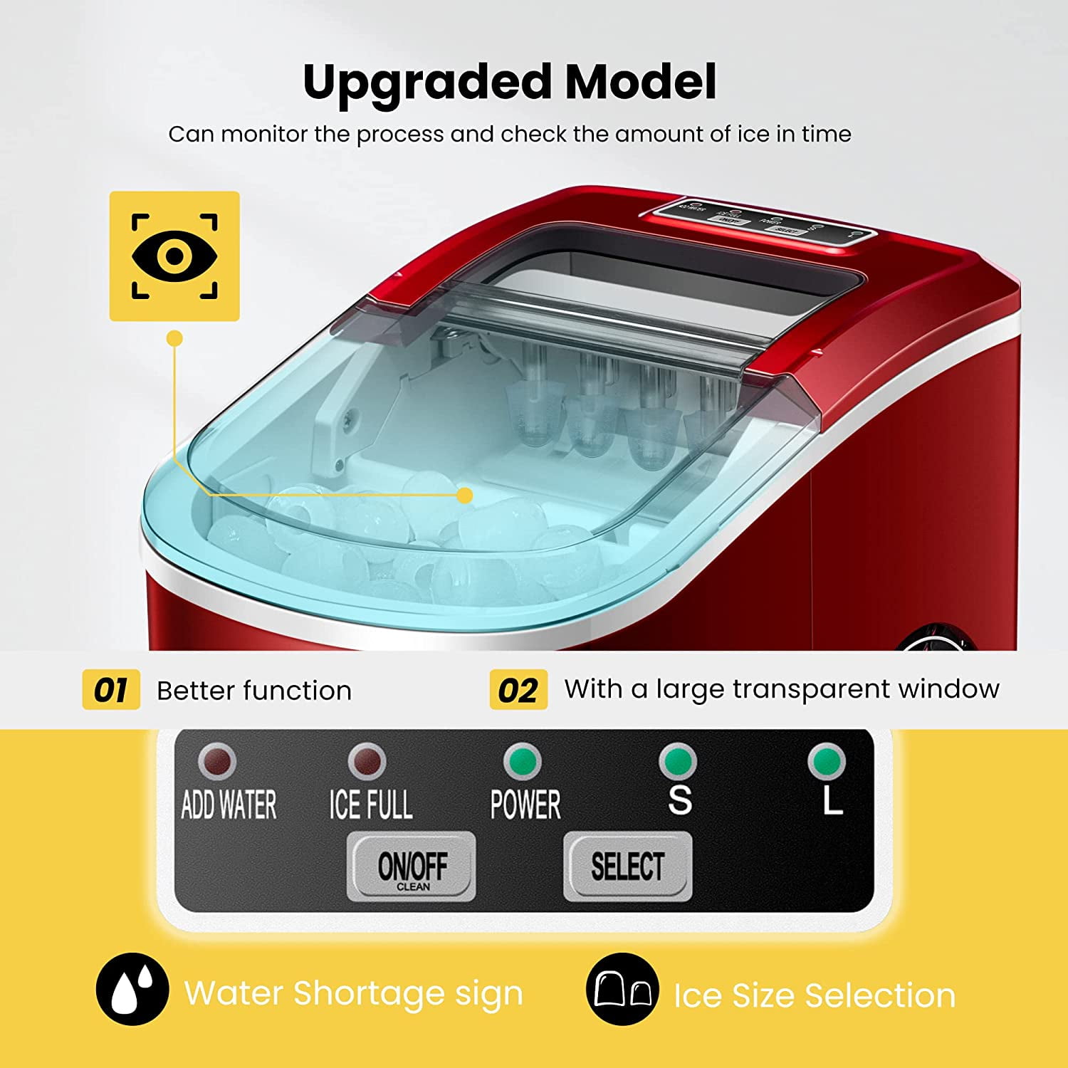 UPGRADED MODEL– The upgraded SPECSTAR portable ice cube maker provides you with an upgraded user experience with better functions; The machine comes with a mega transparent window for you to monitor the ice-making process clearly; As compact as it is, the ice cube maker can make up to 27 lbs. of ice cubes per day in 24 hours; The package also comes with 10 pcs of ice bags for more convenience FAST AND QUIET – Just plug in the power, add water and enjoy a batch of ice in about 6-10 minutes; The upgraded model makes ice faster and can make up to 27 lbs. bullet ice cubes in 24 hours; Featuring 40 DBS when working, it is super quiet during the ice making process, and will not disturb your daily life USER FRIENDLY DESIGN – The countertop ice maker is designed with a large see-through window on the top so you can monitor the process and check the ice level in time; It also comes with indicators to give you an alarm when the reservoir is low and when the ice bucket is full; With automatic overflow protection, you’ll never have to deal with the mess on ice trays ever again SELF-CLEANING FUNCTION – Add water to the sink and long-press the “CLEAN” (ON/OFF) button for 5 seconds, then the machine starts to auto-clean; The cleaning process will last about 30 mins, and after cleaning, you can open the small rubber stopper at the bottom and drain the dirty water out of the machine; The cleanser for exclusive use is also suitable for the self-clean system of this machine, but only be needed for every half year or 1 year a time LIGHTWEIGHT & PORTABLE – Weighing only 16.9 pounds, the countertop ice maker is light enough for you to take it wherever you want to go; Compact design performs well on any occasion; Perfect for RVs, boats, kitchens, tea shops, KTVs, offices, bars, restaurants, parties, gatherings, holidays, and so on