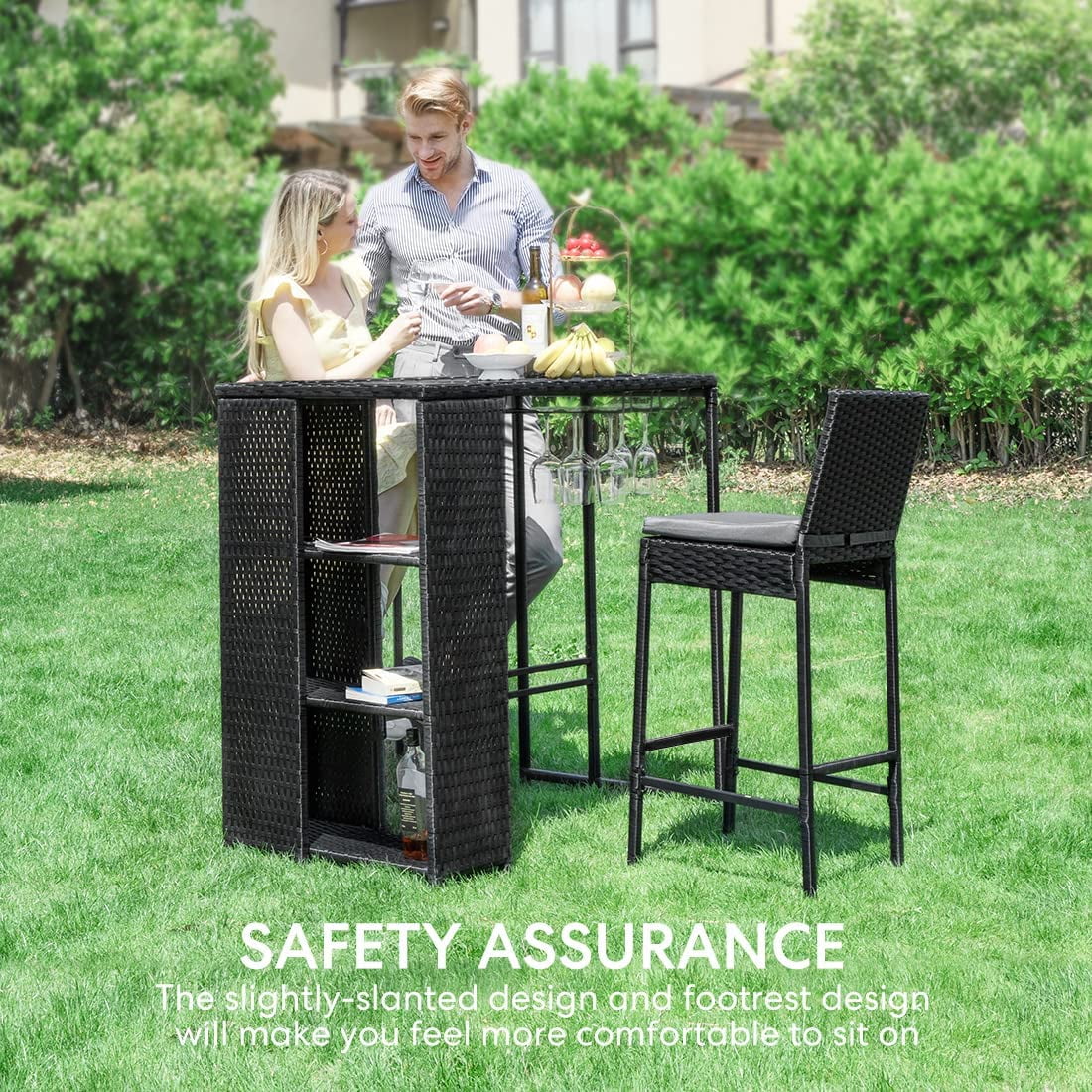 PREMIUM MATERIALS – Made from high-quality PE ratten material, the barstools are UV-resistant and have a long service life; Constructed with a heavy-duty iron frame for better stability, it can be used outdoors even in bad weather; With the sturdy but lightweight structure, you can easily move them to wherever you want COMFORTABLE CUSHIONS – Every barstool comes with a dark gray cushion that is made from advanced vertical cotton material; With the 1.97”-thick cushion, you will not feel any uncomfort or ache even after a long-time sitting; The cover of the cushion can be removed easily and be cleand STRONG SUPPORT – Comes with a premium iron frame and tightly wrapped woven, the barstool can support up to 330lbs; Product Dimensions: 17.7″(L) x 15.7″(W) x 40.9″(H) SAFETY ASSURANCE – The slightly-slanted design and footrest design will make you feel more comfortable to sit on; Every barstool has been tested lean-back pressure to ensure the safety and security of your family FOR ANY OCCASION – Elegant and fashionable design is suitable for various indoor or outdoor activities like balconies, lawns, gardens, porches, backyards, poolside, beaches, and so on