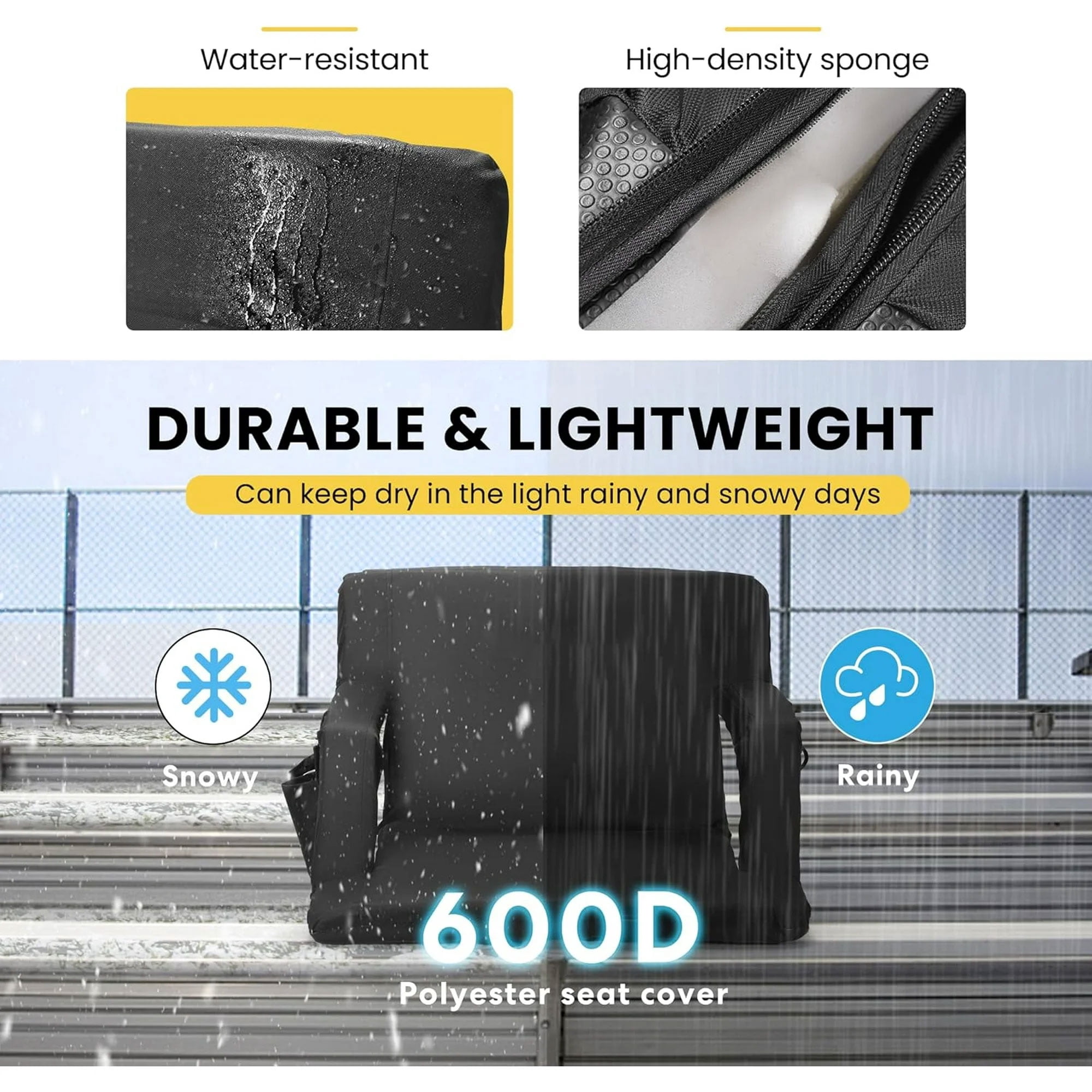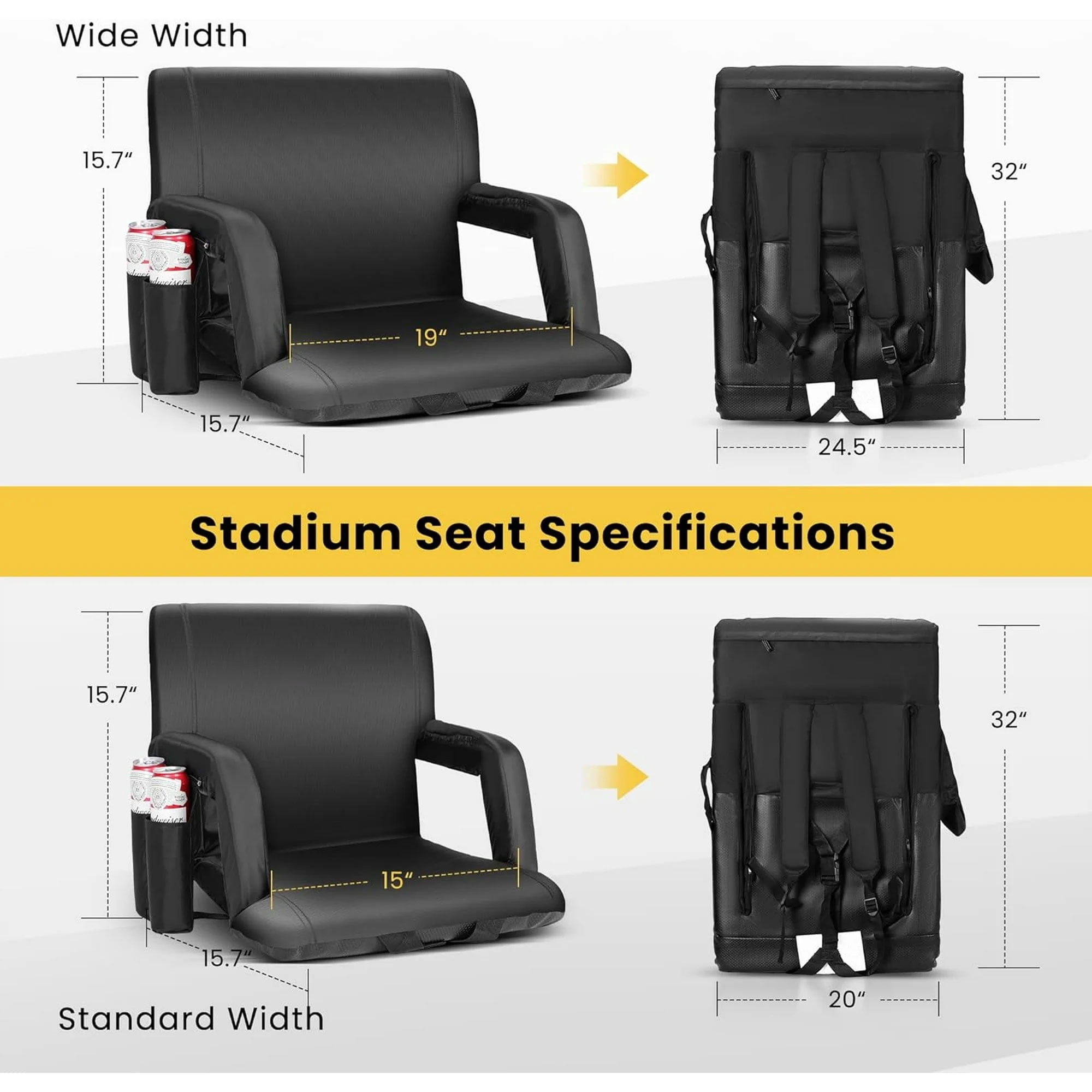 SPECSTAR Foldable Stadium Seat Chair for Bleachers Set of 1 DURABLE & LIGHTWEIGHT & FOLDABLE & PORTABLE & EXTRA POCKETS Bring the comfort of your own home with the SPECSTAR portable stadium seat. Made for traveling, this seat can be compacted into a backpack with two adjustable straps and will quickly become your go-to transportable seat. It provides you with a comfortable experience in all your outdoor activities! Convenient Storage Pockets This bleacher chair is designed with 3 kinds of pockets, one elastic side pocket for small things, 2 zipper pockets (the large one is on the back, and the small one is on the side) for valuable stuff, and 2 round side pockets for drinks. These pockets are convenient for you to store things when you are watching games or having picnics. Comfortable Design Featuring a high-density thickened sponge pad, adjustable 6 seat angles, and foldable armrests, it is comfortable for you to sit in any place. Durable Material Made of a durable lightweight steel frame and 300D polyester materials, the stadium seat is easy to carry and clean, which can keep dry in light rain and snow days. Made of high-quality steel frame construction and a 300D polyester seat cover, ensuring the long time use of this seat. Different pockets can help you to store different items, and the zippers are convenient for you to put valuable stuff. The bottom material is water-resistant and anti-skid for a sturdy fit on any bleachers, bench, or floor surface. The adjustable backpack straps make this stadium seat easy to carry, giving you a comfortable experience for different events. It is perfect for sports events, camping, boating, concerts, beach parties, picnics, extra seats at home, and so on. Product and Package Information Material: Steel + Sponge + 300D Polyester Product Size: 19” (L) x 15.7” (W) x 15.7” (H) (Unfolded), 32” (L) x 24.5” (W) (Folded) Product Weight: 7.6 lbs. 1 x Stadium Seat 1 x Instruction Note: The package includes only 1 stadium seat chair; don’t be misled by the main picture which is wrongly displayed due to a system bug.