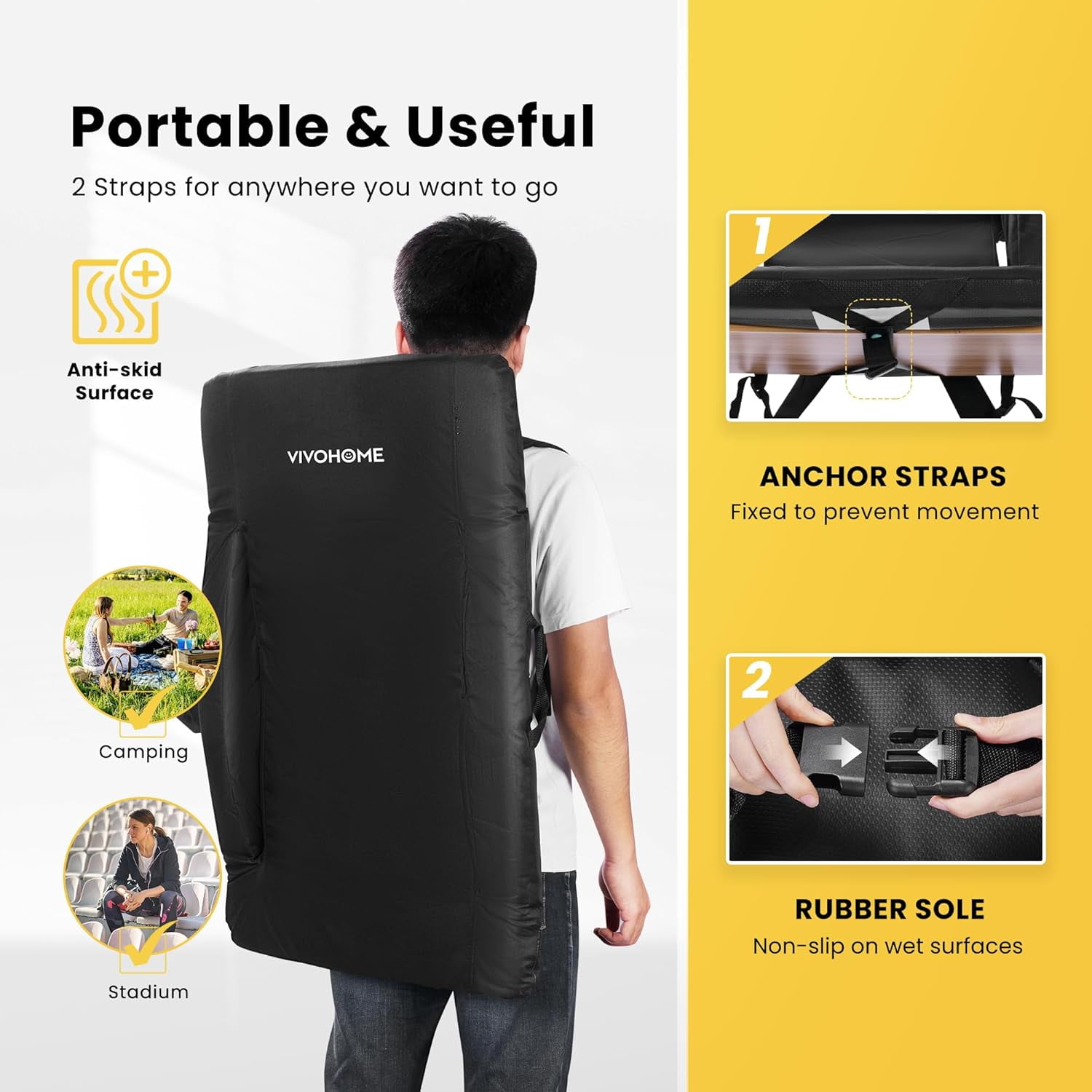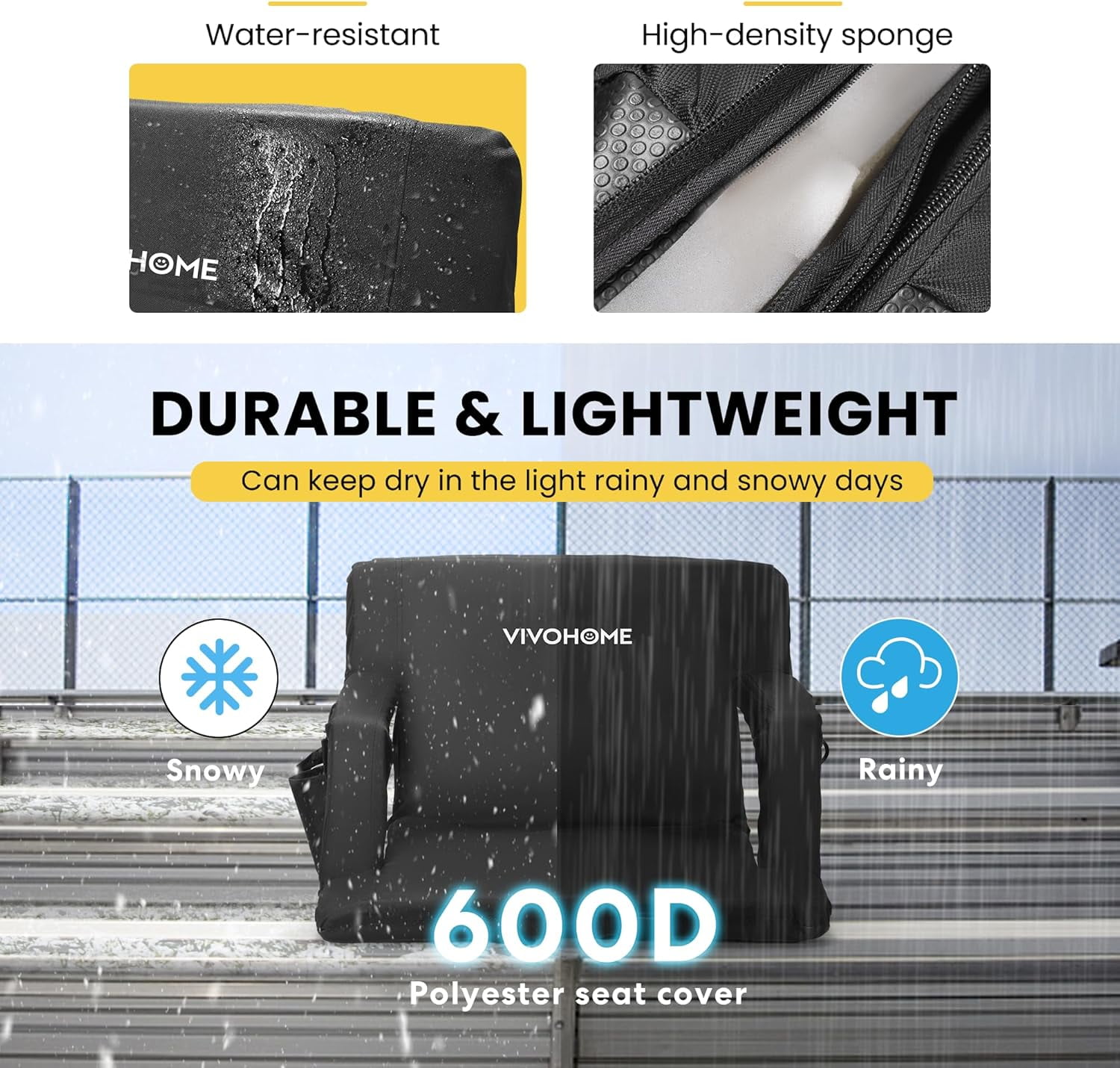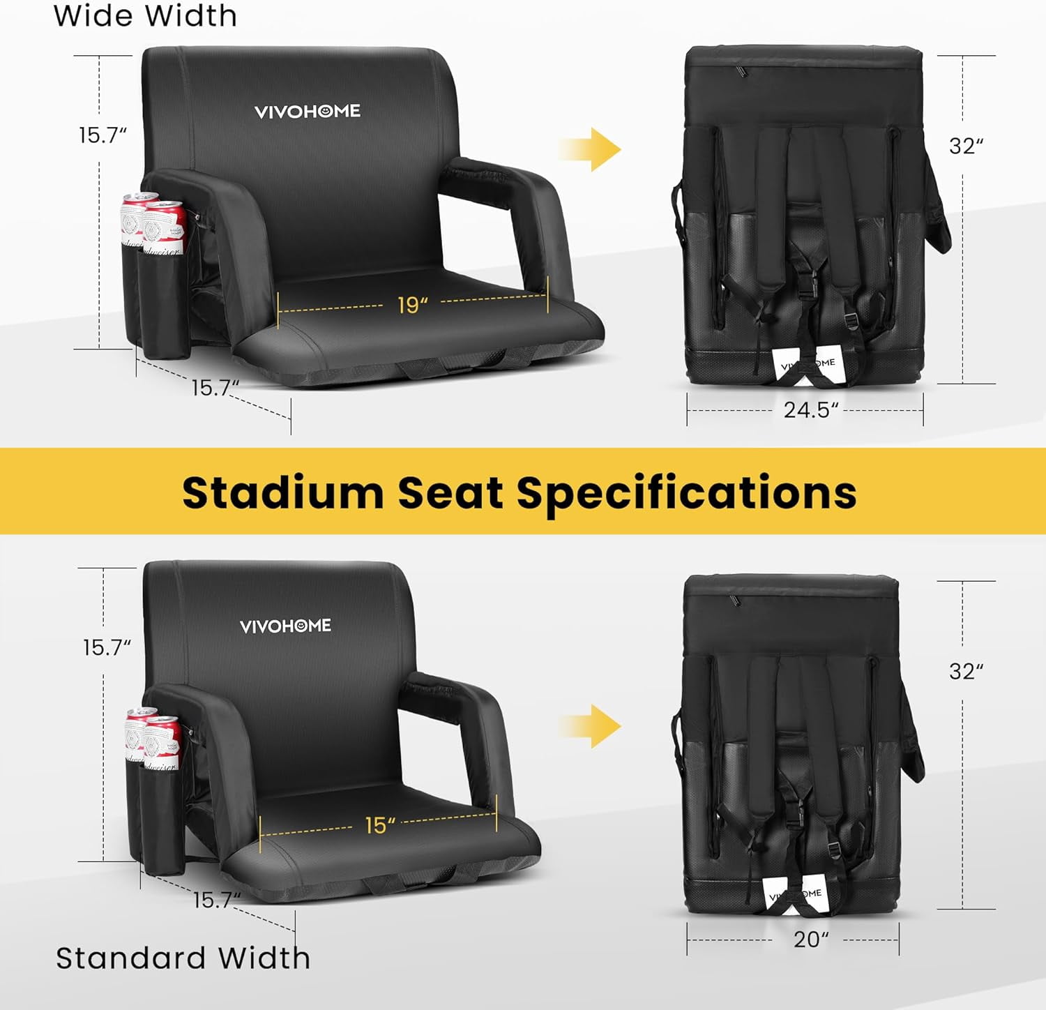 DURABLE & LIGHTWEIGHT – Made of a lightweight steel frame, high-density sponge, and 600D water-resistant oxford cloth seat cover, this SPECSTAR stadium seat is wear-proof, comfortable, and durable to use; The weatherproof surface is also easy to clean and maintain that can keep dry in the light rain and snow days; PLEASE NOTE: THE ITEM QUANTITY IS ONE INSTEAD OF TWO, THE PICTURE SHOWS SOMETHING WRONGLY DUE TO A SYSTEM BUG COMFORTABLE & CONVENIENT – The chair is 24.5” extra wide seat with thickened foam padded cushion, back support, and armrests, which is a perfect tool for indoor and outdoor activities; Features multiple pockets include 2 round side pockets, 2 zipper pockets, and 1 elastic side pocket, and different pockets have different uses, such as putting cold drinks and your phone ADJUSTABLE POSITIONS – There are 6 different reclining degrees to adjust based on your need, including 90°, 105°, 130°, 145°, 160°, and 180°; Adjust the seat position by pushing the seat past the forward-most position and then push it all the way back for a flat position; The armrests are also adjustable, they can invert to increase the width if you prefer a wider seat ANTI-SKID SURFACE – Designed with a rubberized bottom and anchor straps to attach to the bleacher, this stadium seat resists slippery even on wet surfaces so as to make a secure place to sit; The 2 straps can also be used as shoulder straps to carry the chair on the back, which is convenient to take it with you PORTABLE & USEFUL – When you want to carry it, you only need to press the backrest 6 times and then stretch it flat, and the seat can be packed as a backpack for taking; It is ideal for watching professional sports games, and also great for parties, concerts, picnics, and so on
