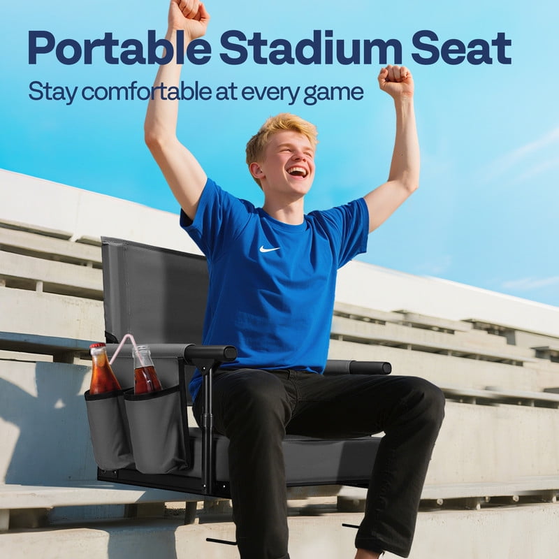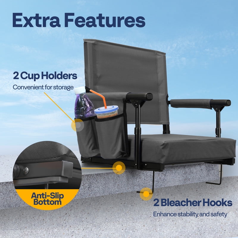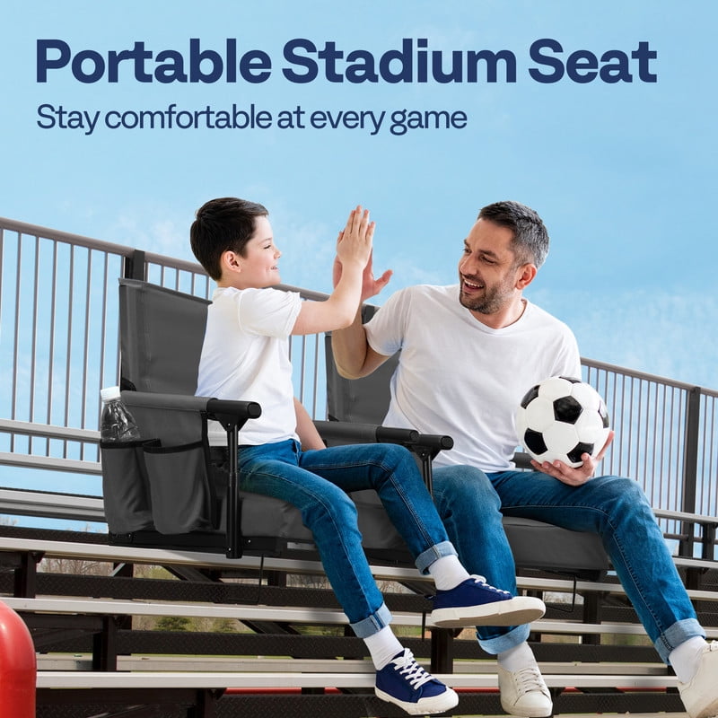 PORTABLE AND CONVENIENT: SPECSTAR stadium seats are lightweight and foldable, making them easy to carry and store; The built-in shoulder strap with adjustable length allows for both shoulder and hand carrying, making transportation hassle-free; The compact design ensures they fit easily in your car trunk or storage space EXTRA FEATURES: Equipped with two cup holders, the stadium chairs offer added convenience for storing personal items or beverages; The anti-slip bottom ensures the seat stays securely in place on bleachers, while the two hooks at the bottom enhance stability and safety; The thoughtful features make your stadium experience more enjoyable and practical STURDY CONSTRUCTION: Built with a durable steel frame, the bleacher seats can withstand up to 350 lb, making them suitable for most adults; The surface is coated with a powder finish, preventing the steel tubes from rusting and scratching, ensuring long-lasting performance; The seat fabric is made of 600D Oxford cloth, offering a great touch and abrasion resistance PREMIUM COMFORT: Back support and armrests help you find the perfect angle for relaxation; Filled with 2.8 in soft sponge, the seat cushion provides excellent support, ensuring you stay comfortable throughout the entire game; The overall ergonomic design promotes good posture and reduces back fatigue WIDE APPLICATION: Easy to set up and fold down, these seats are perfect for those who need quick and convenient seating solutions; The stadium seats with back support are ideal for a wide range of events, including sports games, concerts, and outdoor festivals, providing comfort and support wherever you go