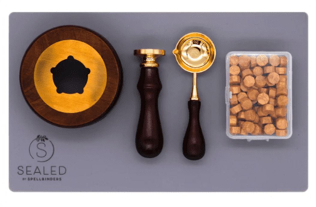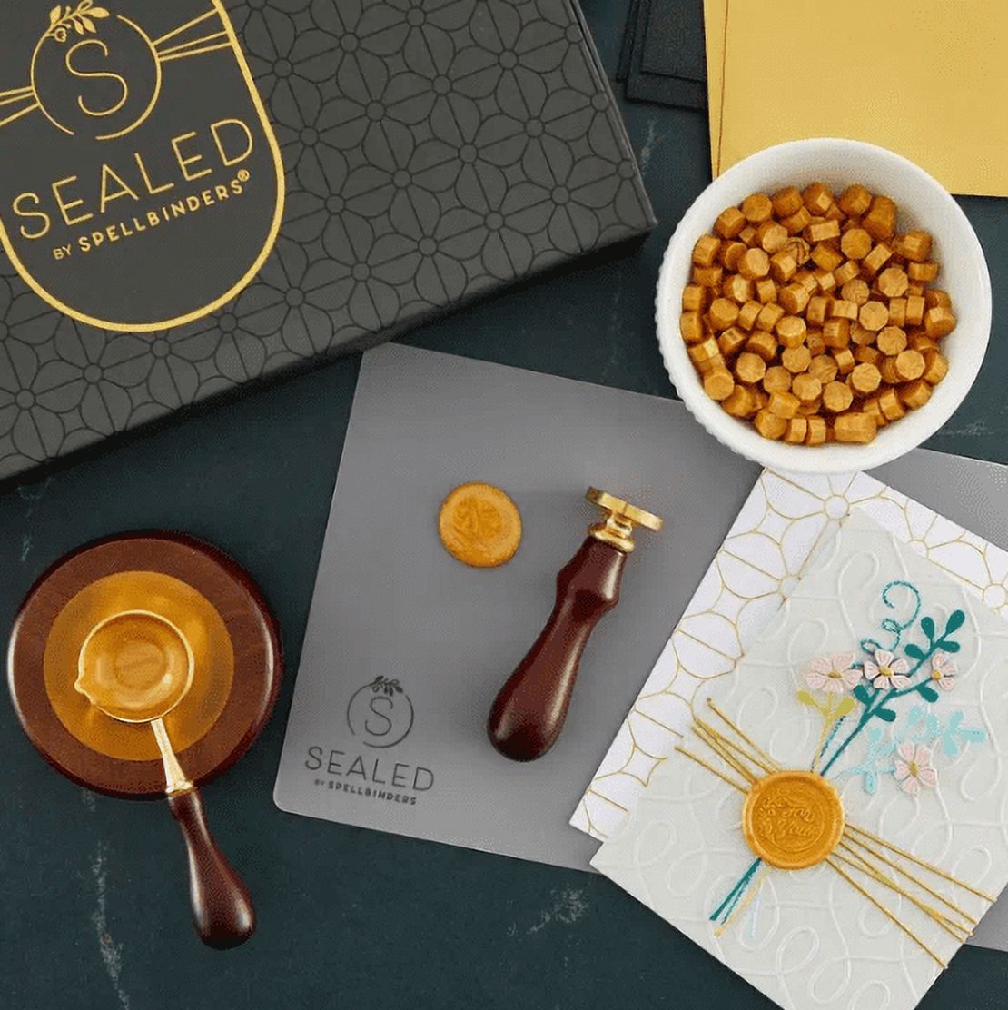 Spellbinders Wax Seal Kit contains five pieces to get you started on your stationery journey. It includes a wax warmer, also called a kettle; a wax bead warmer spoon with pouring spouts on both sides; a 1″ circular wax seal stamp and handle with the words “For You” centered in a leafy circle; 100 premium gold wax beads; and a 10 x 7-inch silicone mat to protect your surface. Sealed by Spellbinders is a collection perfect for those who love creating handmade cards, envelopes, and invitations with extra flair. Add a classic touch of wax seal-inspired designs to embellish your cardmaking creations and other projects.