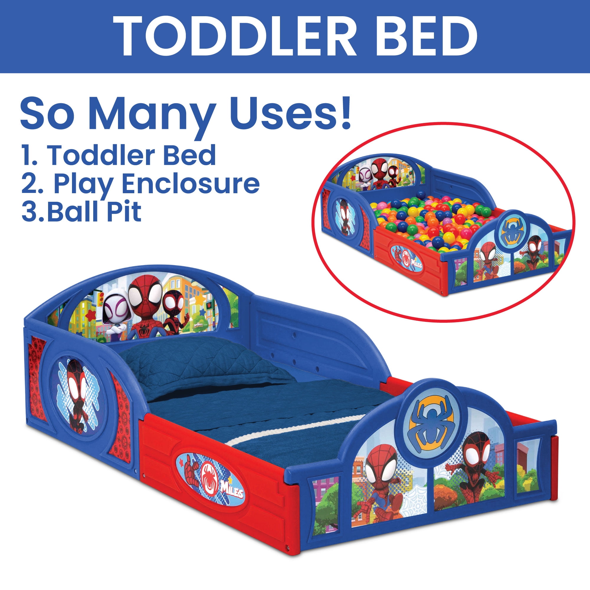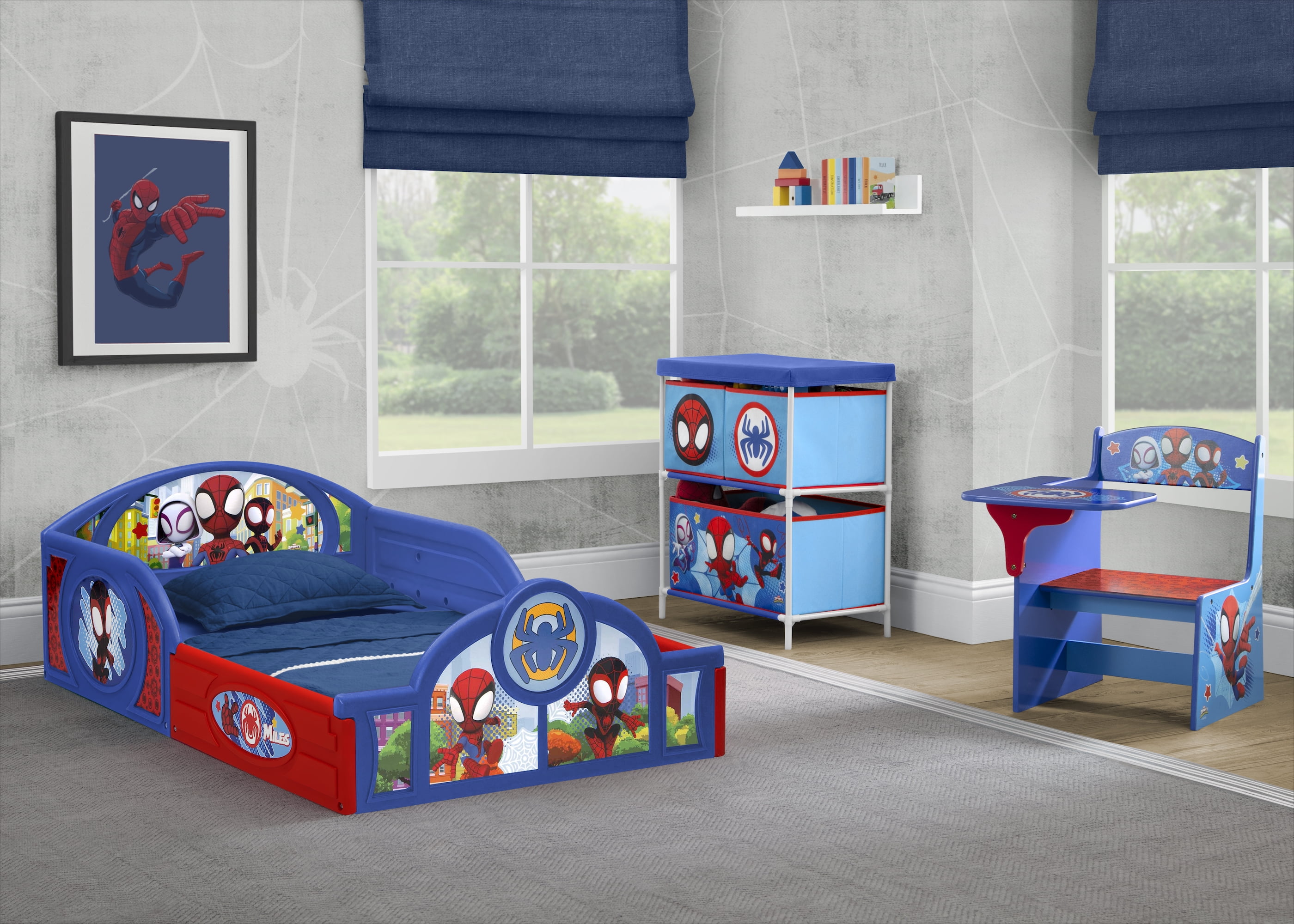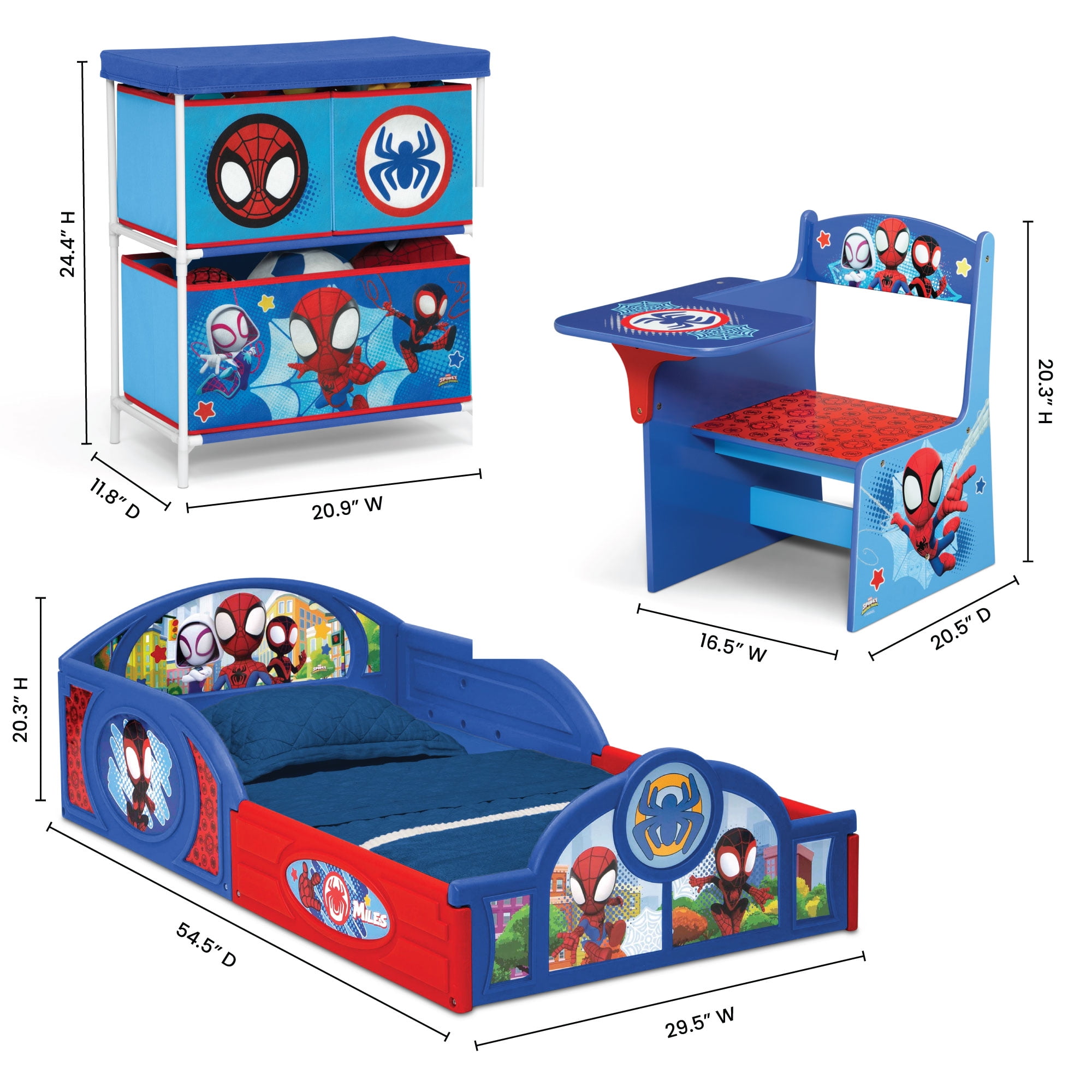 WHAT’S INCLUDED: This 3-Piece Toddler Bedroom Set includes 1 Sleep and Play Toddler Bed, 1 Chair Desk, 1 Toy Organizer with 3 Fabric Bins FOR SPIDEY FANS: Colorful Spidey and His Amazing Friends graphics makes this a must-have set for any fan SLEEP AND PLAY TODDLER BED: Built in toddler guardrails to keep your child secure | Mattress is designed to sit low in the bed frame for your child’s safety and ease (mattress sold separately) | JPMA certified to meet or exceed all safety standards set by the CPSC & ASTM | Versatile frame of the Sleep and Play Toddler Bed can be used as a bed, play enclosure, ball pit and much more (play balls not included) TOY ORGANIZER: Toy Organizer has 3 fabric bins in varying sizes to fit a wide variety of toys, from small to large CHAIR DESK: Holds up to 50 lbs. | Desk sits low to the ground for easy access SIZE: Sleep and Play Toddler Bed: 29.5”W x 54.5”D x 17”H; Chair Desk: 16.5”W x 20.5”D x 20.3”H; Organizer: 20.9”W x 11.8”D x 24.4”H | Easy assembly | Recommended for ages 15 months+