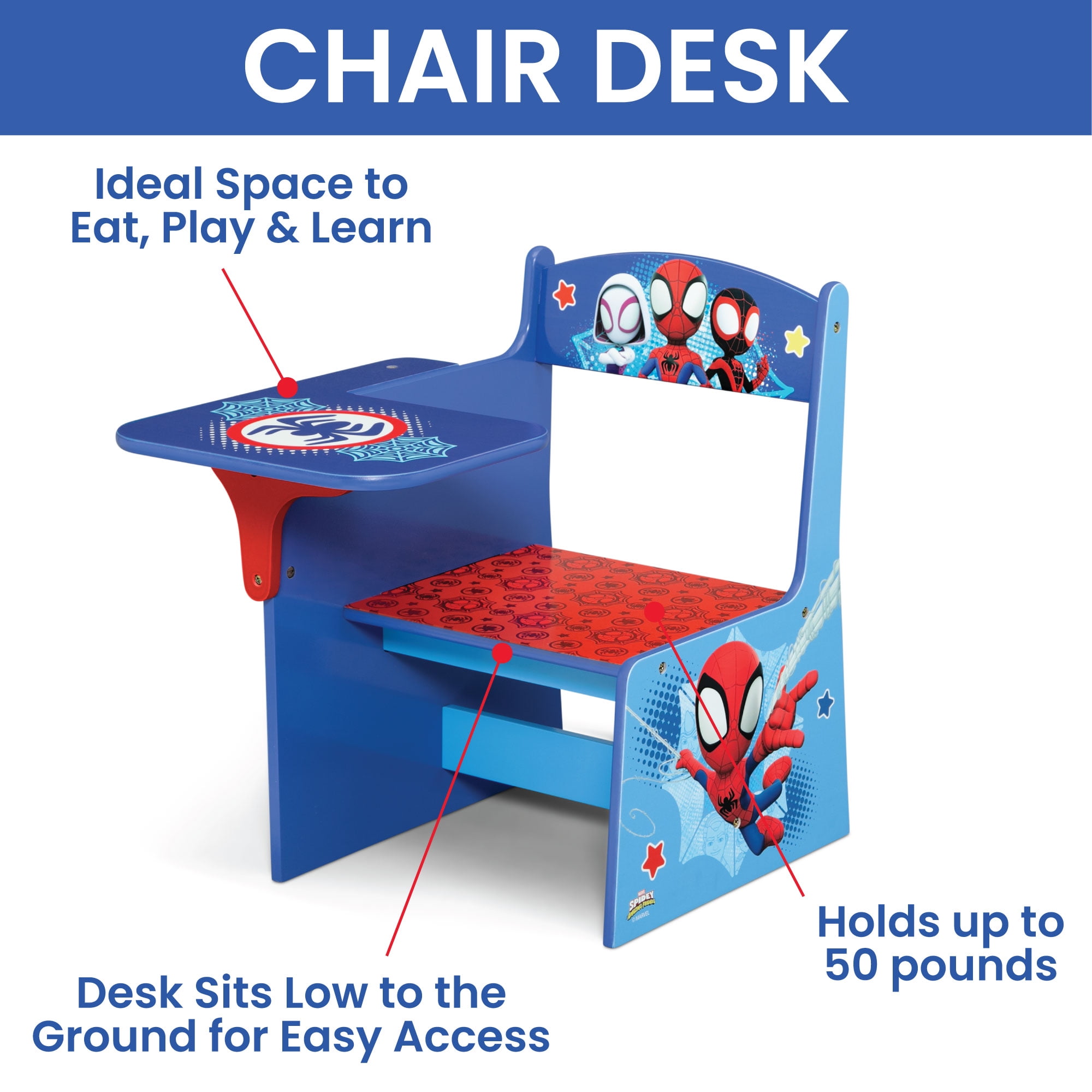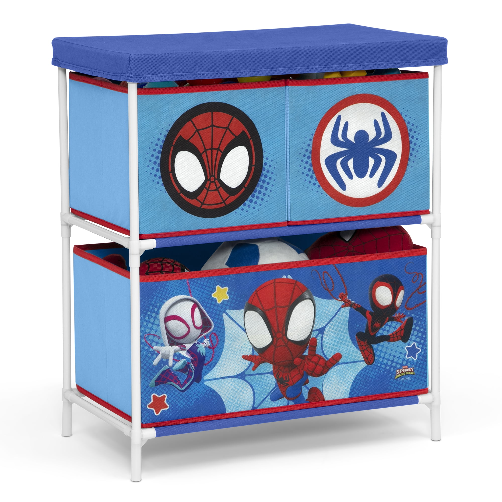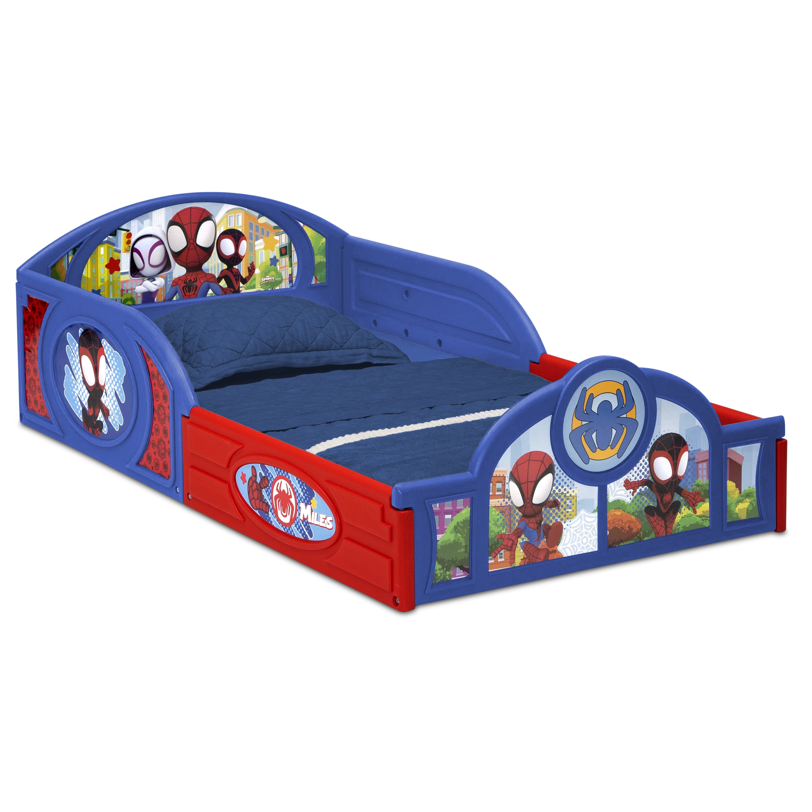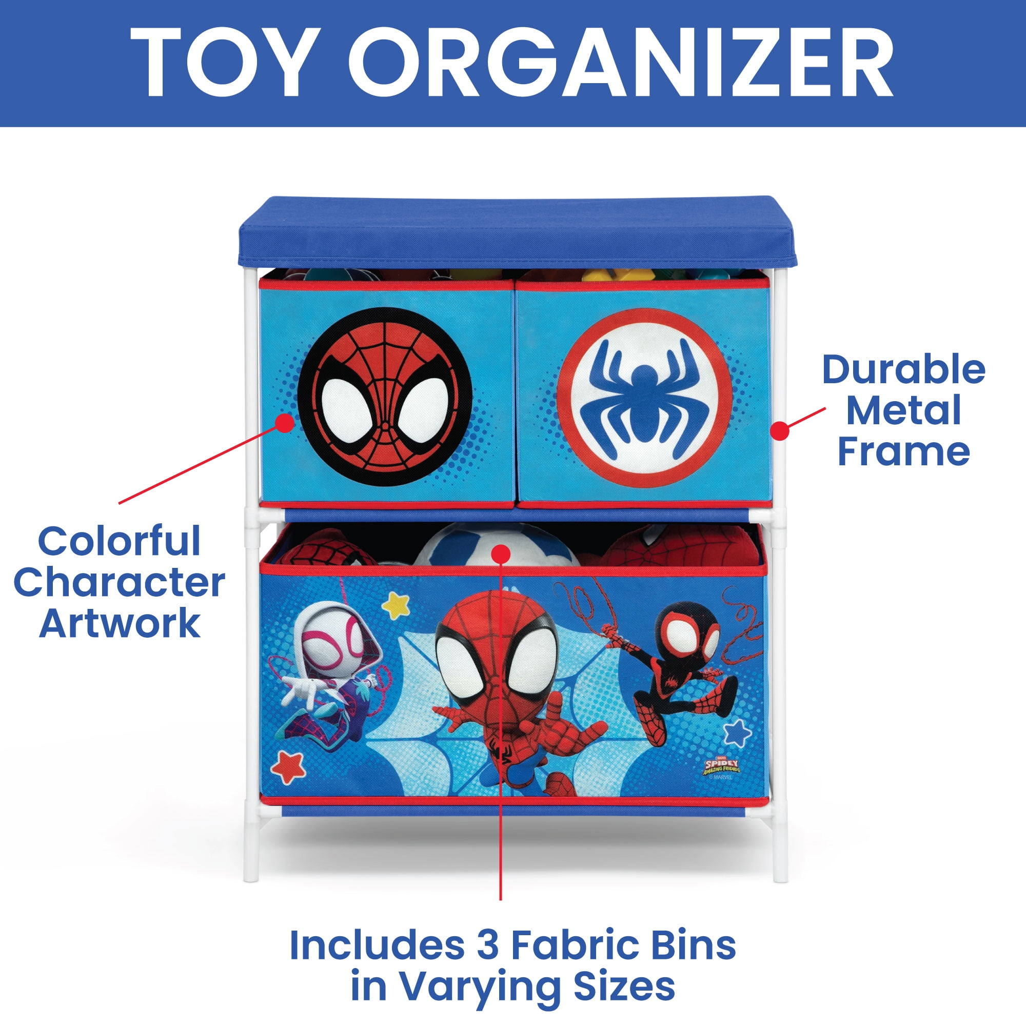 WHAT’S INCLUDED: This 3-Piece Toddler Bedroom Set includes 1 Sleep and Play Toddler Bed, 1 Chair Desk, 1 Toy Organizer with 3 Fabric Bins FOR SPIDEY FANS: Colorful Spidey and His Amazing Friends graphics makes this a must-have set for any fan SLEEP AND PLAY TODDLER BED: Built in toddler guardrails to keep your child secure | Mattress is designed to sit low in the bed frame for your child’s safety and ease (mattress sold separately) | JPMA certified to meet or exceed all safety standards set by the CPSC & ASTM | Versatile frame of the Sleep and Play Toddler Bed can be used as a bed, play enclosure, ball pit and much more (play balls not included) TOY ORGANIZER: Toy Organizer has 3 fabric bins in varying sizes to fit a wide variety of toys, from small to large CHAIR DESK: Holds up to 50 lbs. | Desk sits low to the ground for easy access SIZE: Sleep and Play Toddler Bed: 29.5”W x 54.5”D x 17”H; Chair Desk: 16.5”W x 20.5”D x 20.3”H; Organizer: 20.9”W x 11.8”D x 24.4”H | Easy assembly | Recommended for ages 15 months+