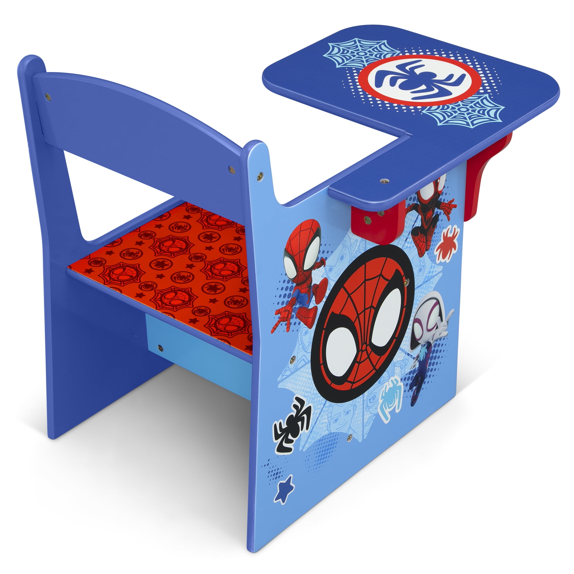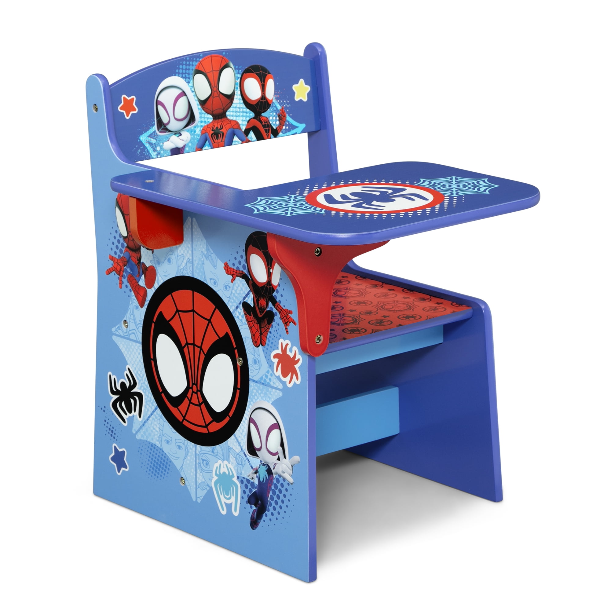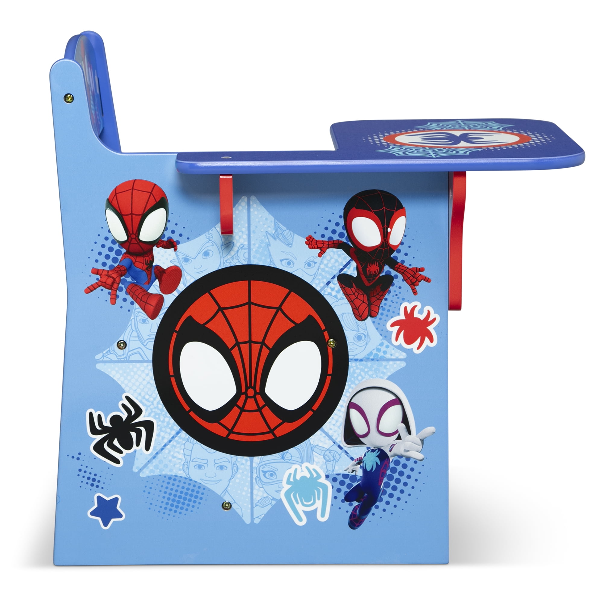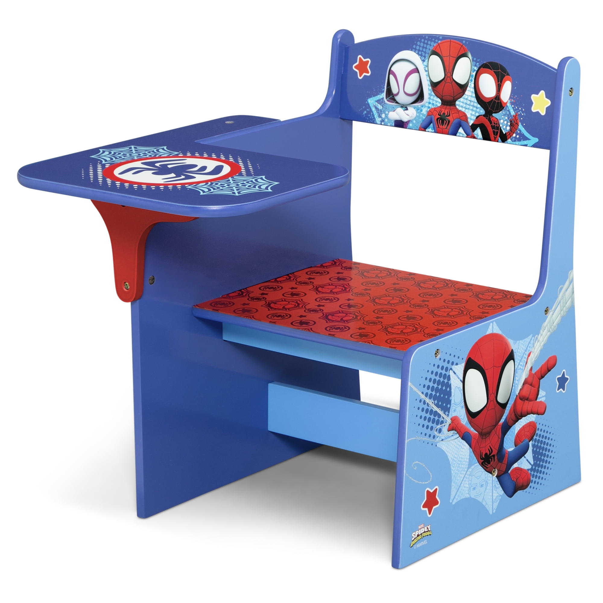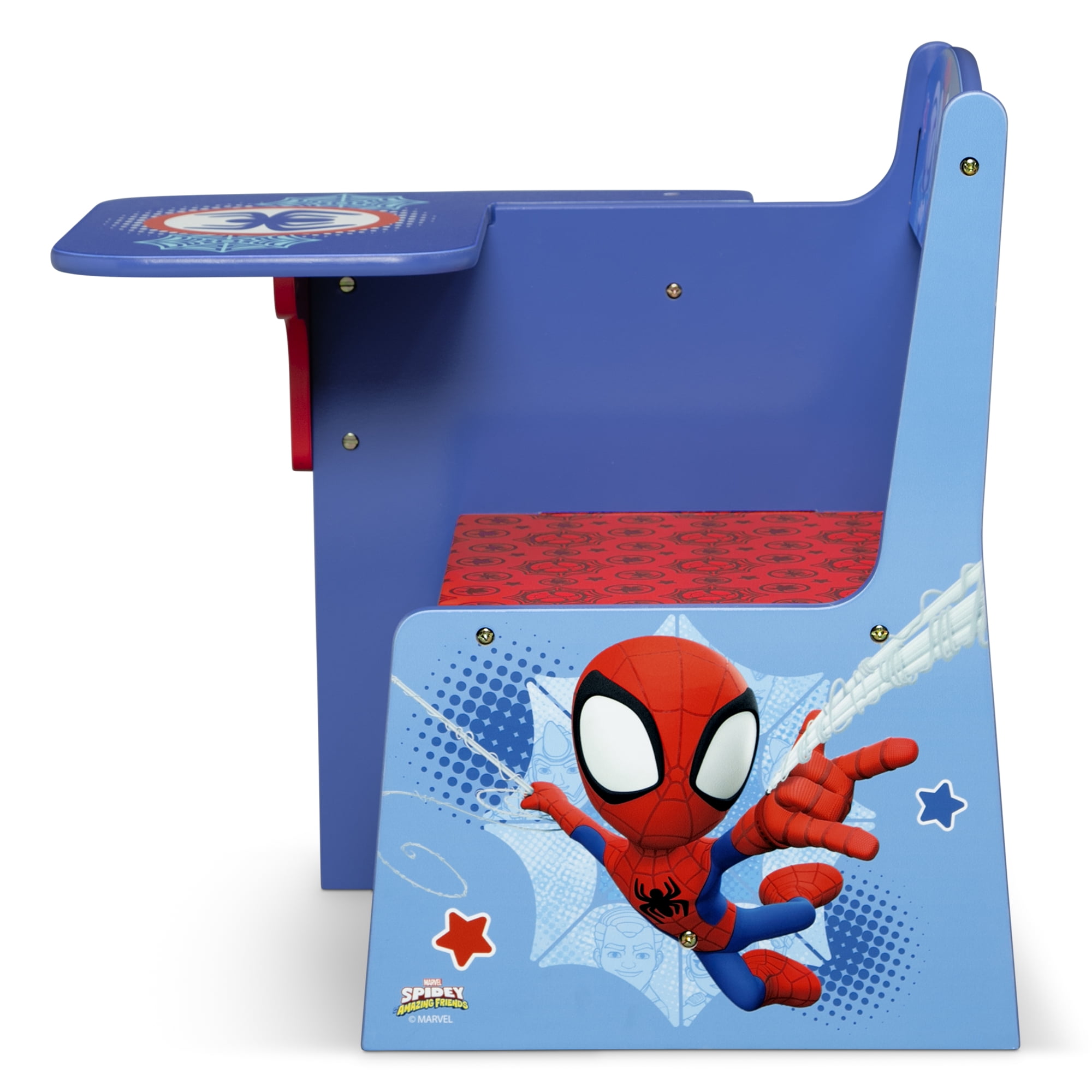 Kids love themed bedroom sets—and this Spidey and His Amazing Friends 3-Piece Toddler Bedroom Set by Delta Children is the best there is! This colorful bedroom set with Spidey graphics includes all the pieces you need to create the room of their dreams, like a Sleep and Play Toddler Bed, Toy Organizer with 3 Fabric Bins and a Chair Desk. The Sleep and Play Toddler Bed features a low mattress height and built-in guardrails that make it the best option for your child’s first big-kid bed, giving them the independence they crave while keeping them safe throughout the night. The bed’s versatile plastic frame can also be used as a play enclosure or a ton of other fun things, like a ball pit (play balls not included). The Toy Organizer with 3 Fabric Bins features three fabric toy bins in two different sizes to stow a ton of toys. The Chair Desk provides the perfect space for your child to do homework, art projects or eat. Get the Spidey and His Amazing Friends 3-Piece Toddler Bedroom Set by Delta Children today! About Spider-Man: After being bitten by a radioactive spider, Peter Parker gained incredible special powers. Along with his newfound abilities, Peter used his scientific knowledge to construct tools, a suit and a new alter ego, Spider-Man. Using his superpowers to protect the public from evildoers, he knows that with great power comes great responsibility! Bring the action-packed fun of Spider-Man to your child’s bedroom or playroom with furniture and decor from Delta Children.