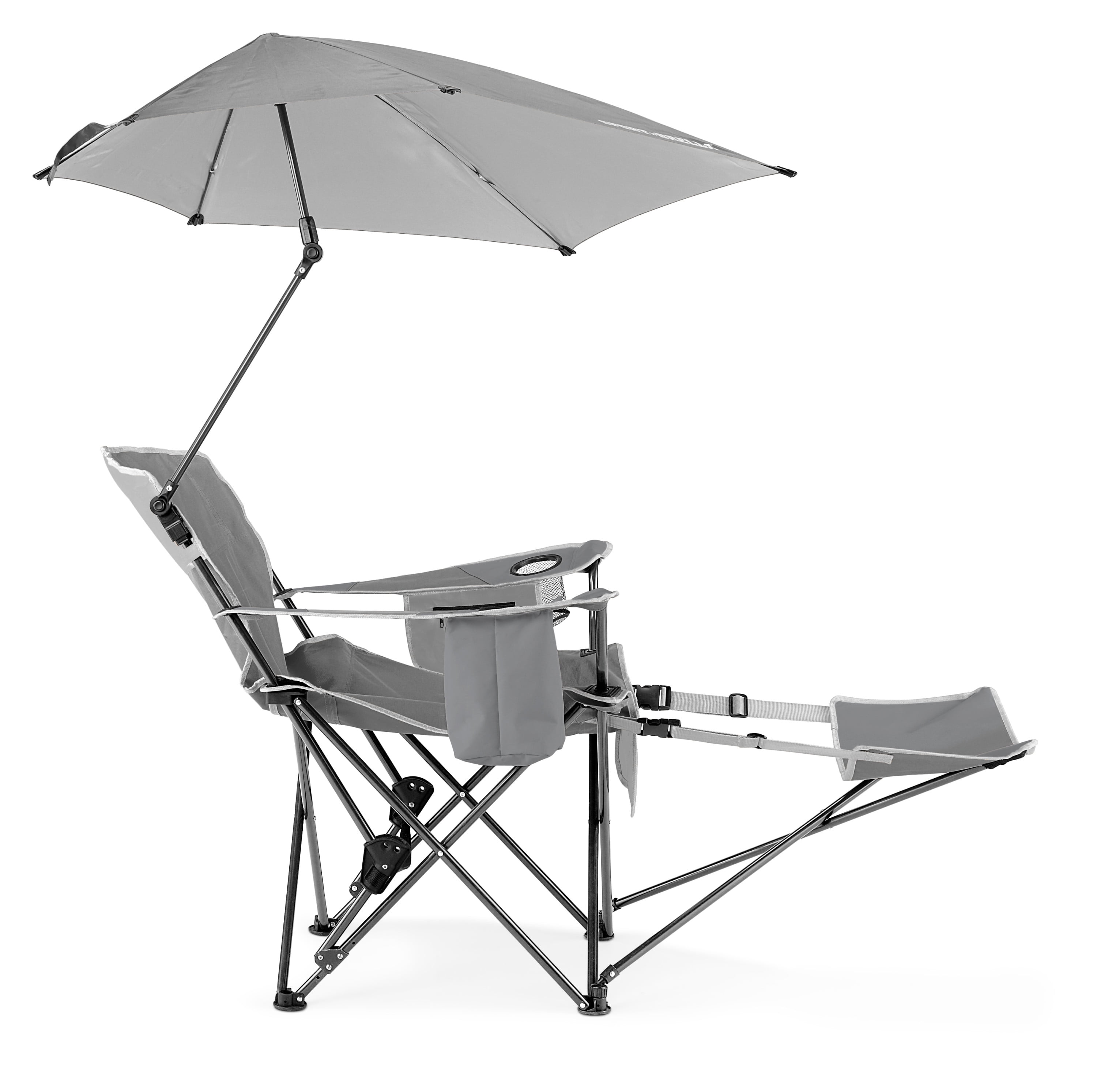The Sport-Brella Recliner Chair is perfect for camping, sporting events, tailgating and the beach. Kick back with the easily adjustable 3-position recliner and stay protected with the 360-degree overhead umbrella. Fully enjoy yourself with all the extra features like the extra wide seat, insulated pocket, cup holder, bottle opener, and adjustable or removable footrest. 3-position recliner with easy adjusting hinges 3-way swiveling umbrella Built-in insulated pocket holds up to 4 drinks Cup holder and storage pockets with bottle opener Metallic undercoating for UPF 50+ sun protection Umbrella folds down on chair for storage as a single unit Adjust or completely remove the footrest Eye protective safety tips on umbrella points Umbrella attaches to either side with quick-release clips Ultra-strong, lightweight steel construction 250lb maximum capacity