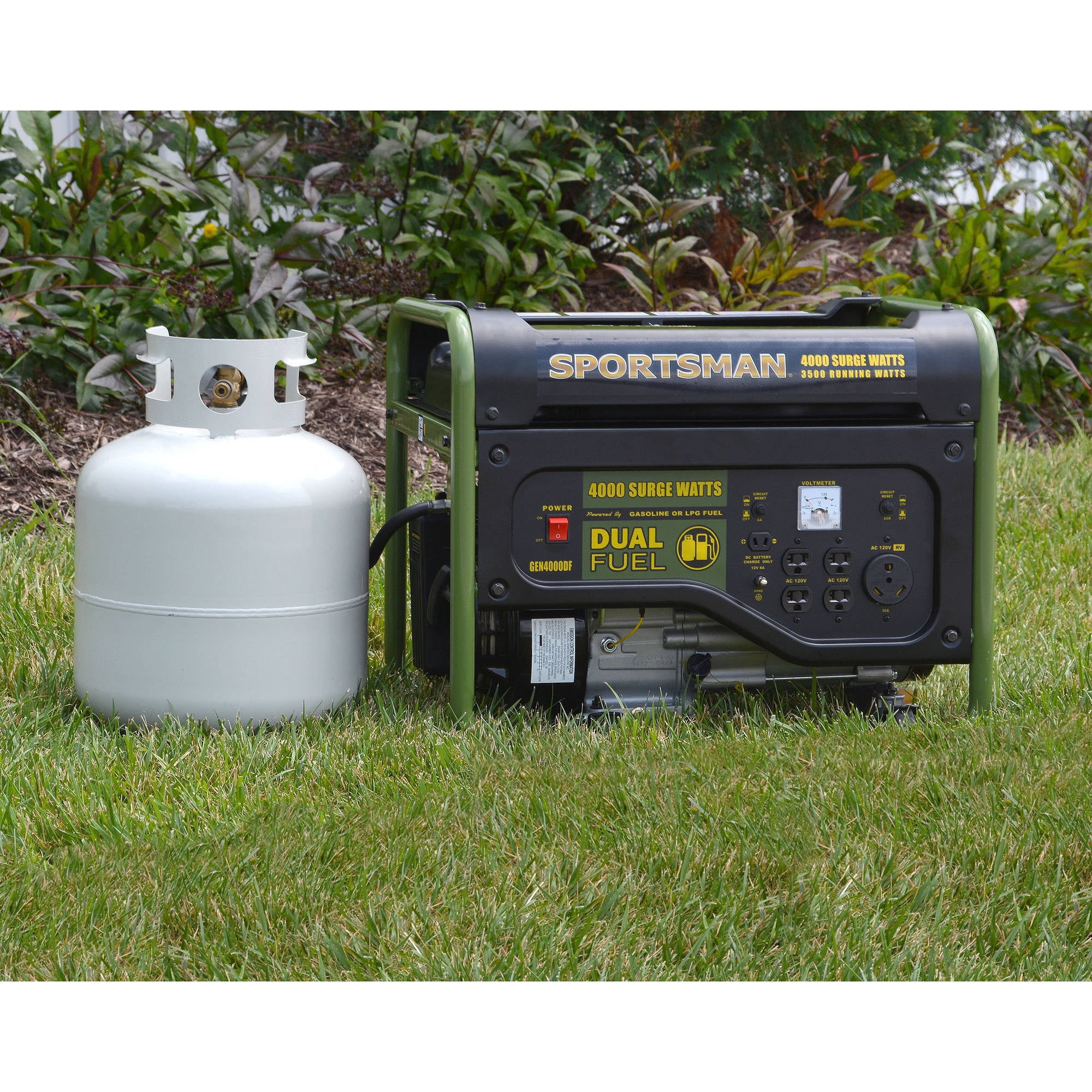 Sportsman 3500W Dual Fuel Pull Cord Start Power Generator 4,000 peak surge watts and 3,500 rated running watts Capable of running most household appliances and power tools Operates on gasoline or liquid propane fuel 7 HP, 4-stroke OHV engine for maximum performance Easy recoil start mechanism