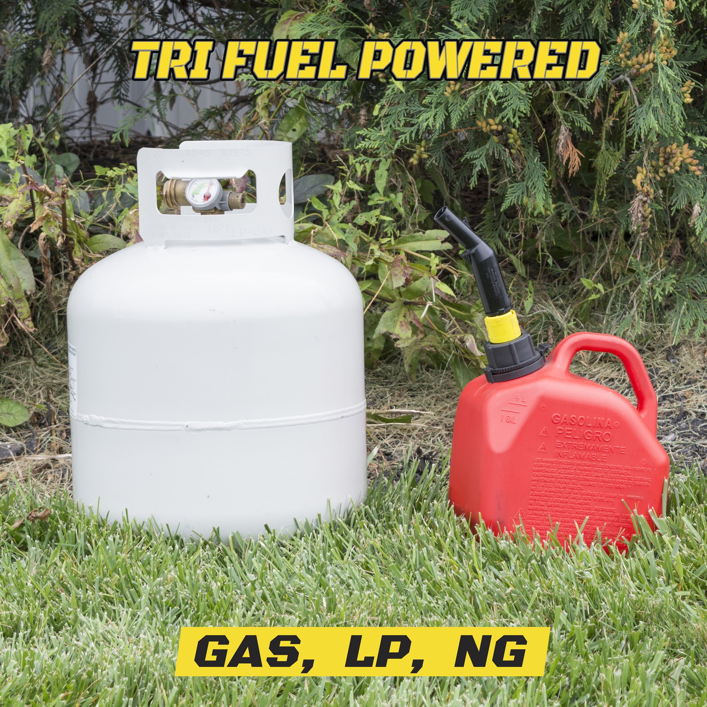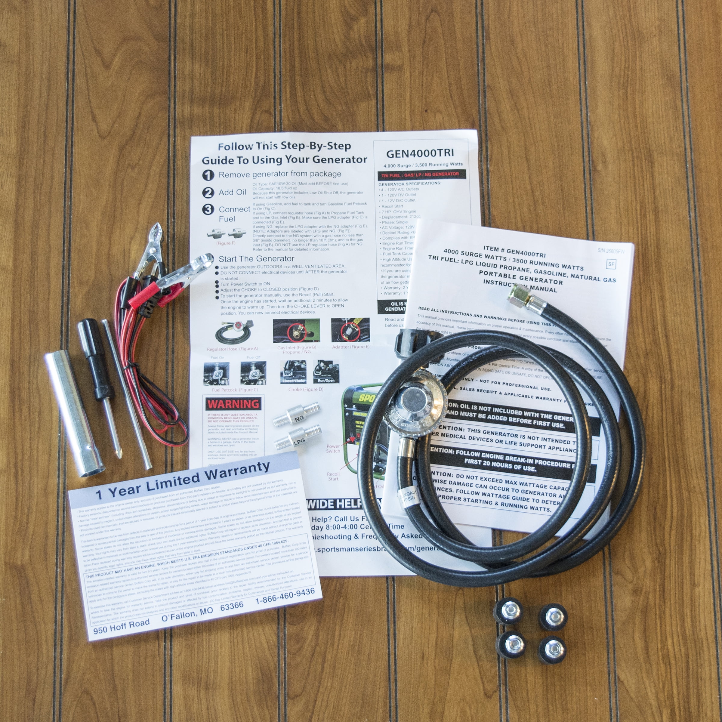Portable generator runs on NG Natural Gas, LPG Propane, or unleaded gasoline 4,000 surge watts and 3,500 running watts can run the RV, household appliances, and power tools Compact size and weight make it easy to move and transport 7.0 HP engine, 4650 RPM, 4 stroke, 212cc, air cooled, recoil start, OHV Engine 10 hour run time with a full 3.6 gallon gas tank, or 12 hours with a full 20 lb. propane tank at 50 percent load 18.5 oz. SAE 10W30 oil capacity UL listed electrical components, engine shut off switch, AC reset, AVR automatic voltage regulation, low oil shutdown, voltmeter Decibel rating less than 68 dB with no load at 24 feet Comes with separate adapters for LPG and natural gas, a DC connector wires for charging 12 Volt automotive-type batteries, a spark plug wrench, a screwdriver, and a 5 ft. regulator hose kit High Altitude Use: This generator is not recommended for high altitude use above 3,000 ft. If you are using a generator at 3,000 feet above sea level, the generator may not function properly because of air flow getting through the carburetor. EPA approved, Non-CARB compliant/Not for sale in California Surge watts / running watts may be reduced by 10% when using propane vs using gasoline Surge watts / running watts may be reduced by 20% when using natural gas vs using gasoline Read instruction manual before use: FOR LP, you must use the supplied LP Regulator for safe operation. FOR NG, the pressure supplied to the generator must be 4 TO 6 OUNCES or 7 TO 11 INCHES W.C. (water column). The primary regulator at the fuel supply must be capable of delivering the proper volume of fuel at this pressure. Contact your local natural gas professional for installation. Two adapters are included, one is for LPG, the other is for NG. Before using LPG or NG fuel, choose the correct adapter according to the fuel you’ve connected”