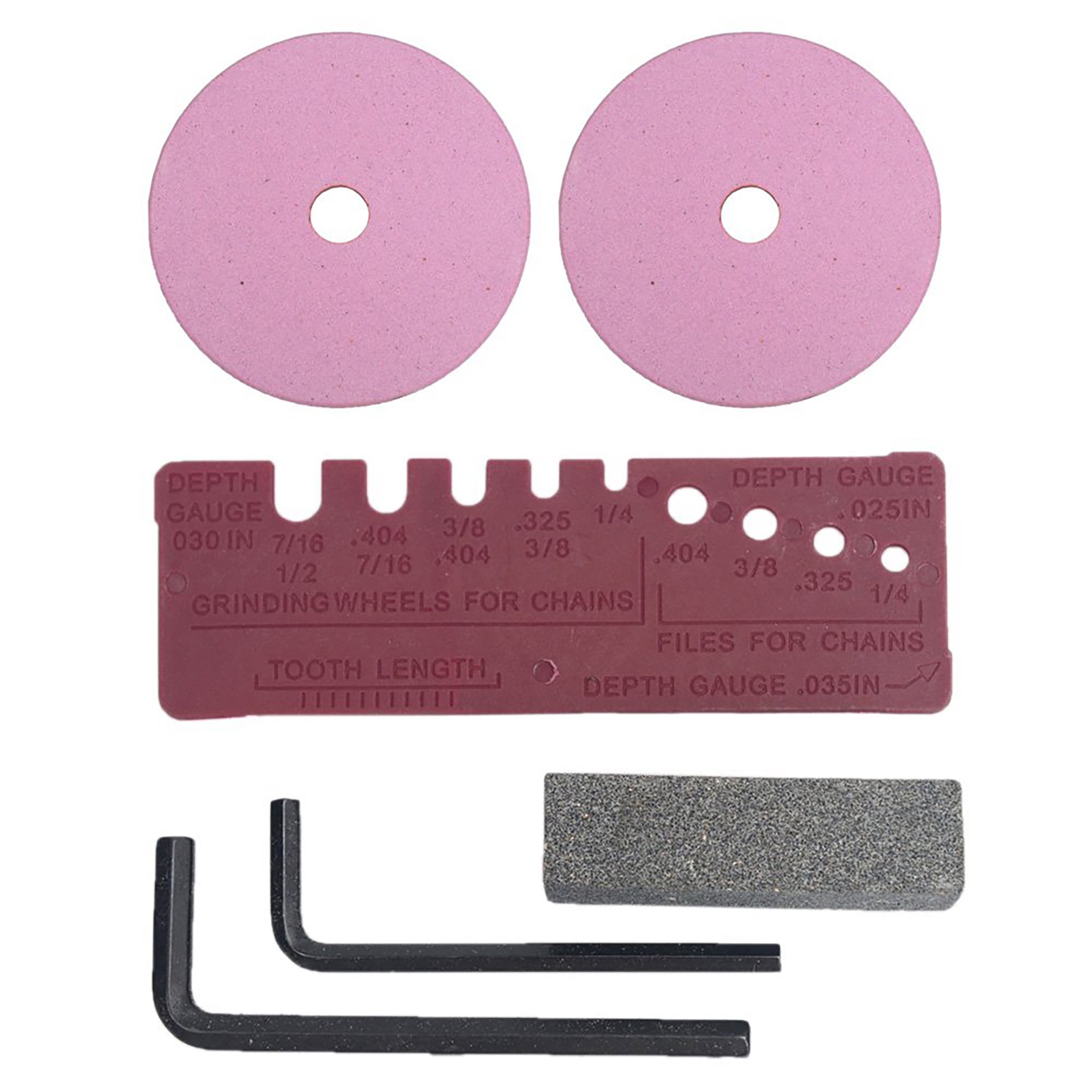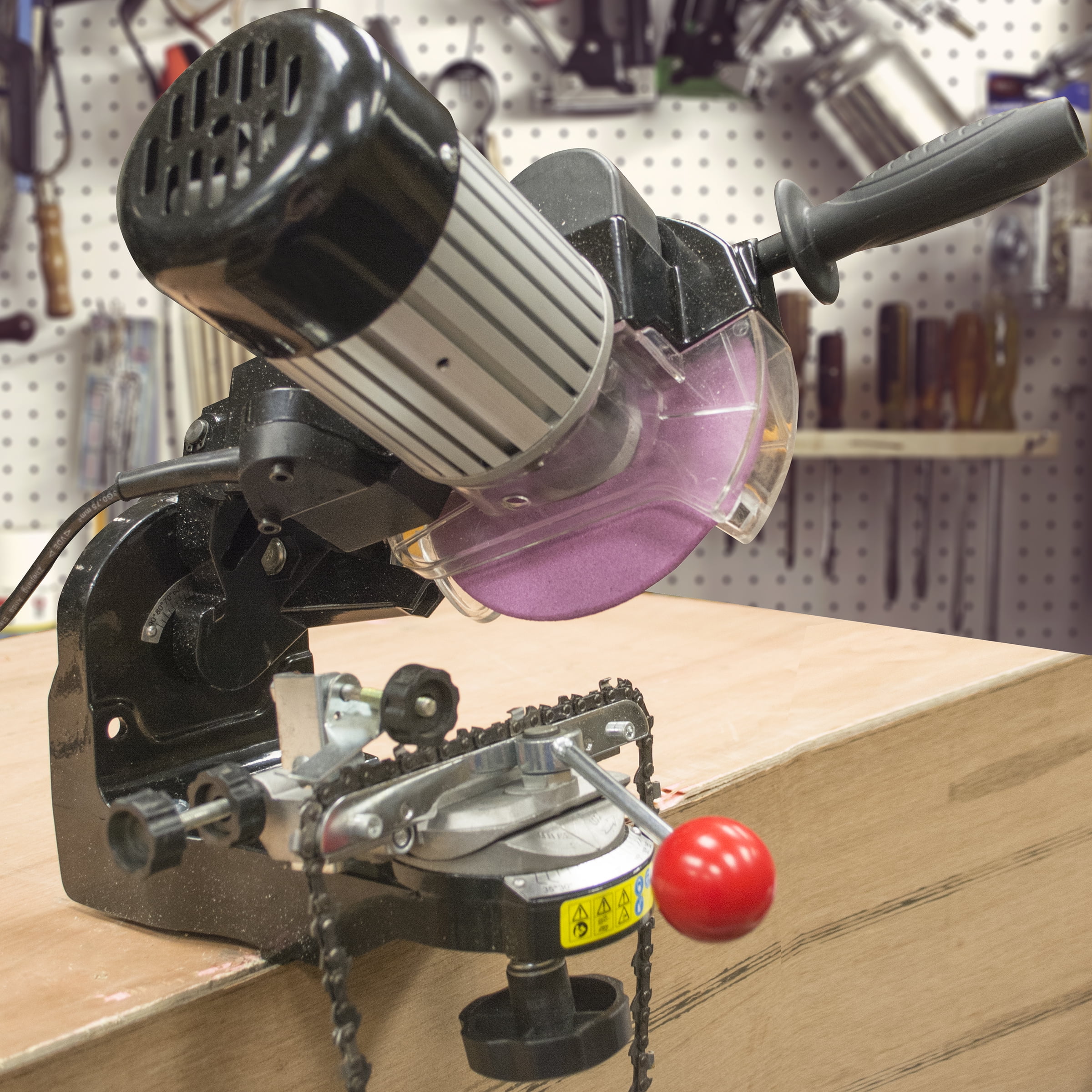 Keep your chain in top condition and save money by sharpening your own saw Fits most brands and 4 common size chains 1/4, .325, 3/8, and .404 inch 2 grinding wheels included, 1/8 inch and 3/16 inch, 5.5 inch dia, Mounts to bench or worktop for safety and stability Built-in light illuminates work surface