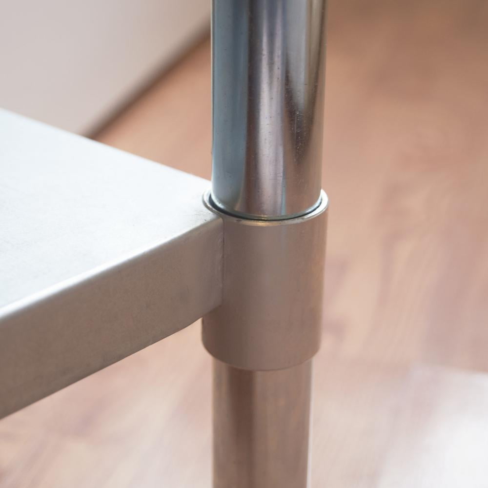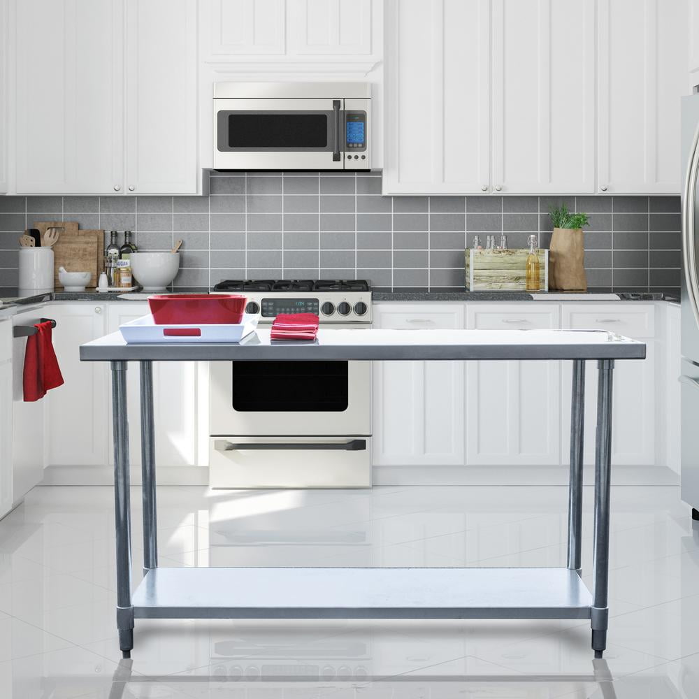 Choose from the available sizes. 19-gauge 420 stainless steel construction Adjustable metal shelf fits underneath table No mar plastic feet create level workspace. 330-lb. weight capacity