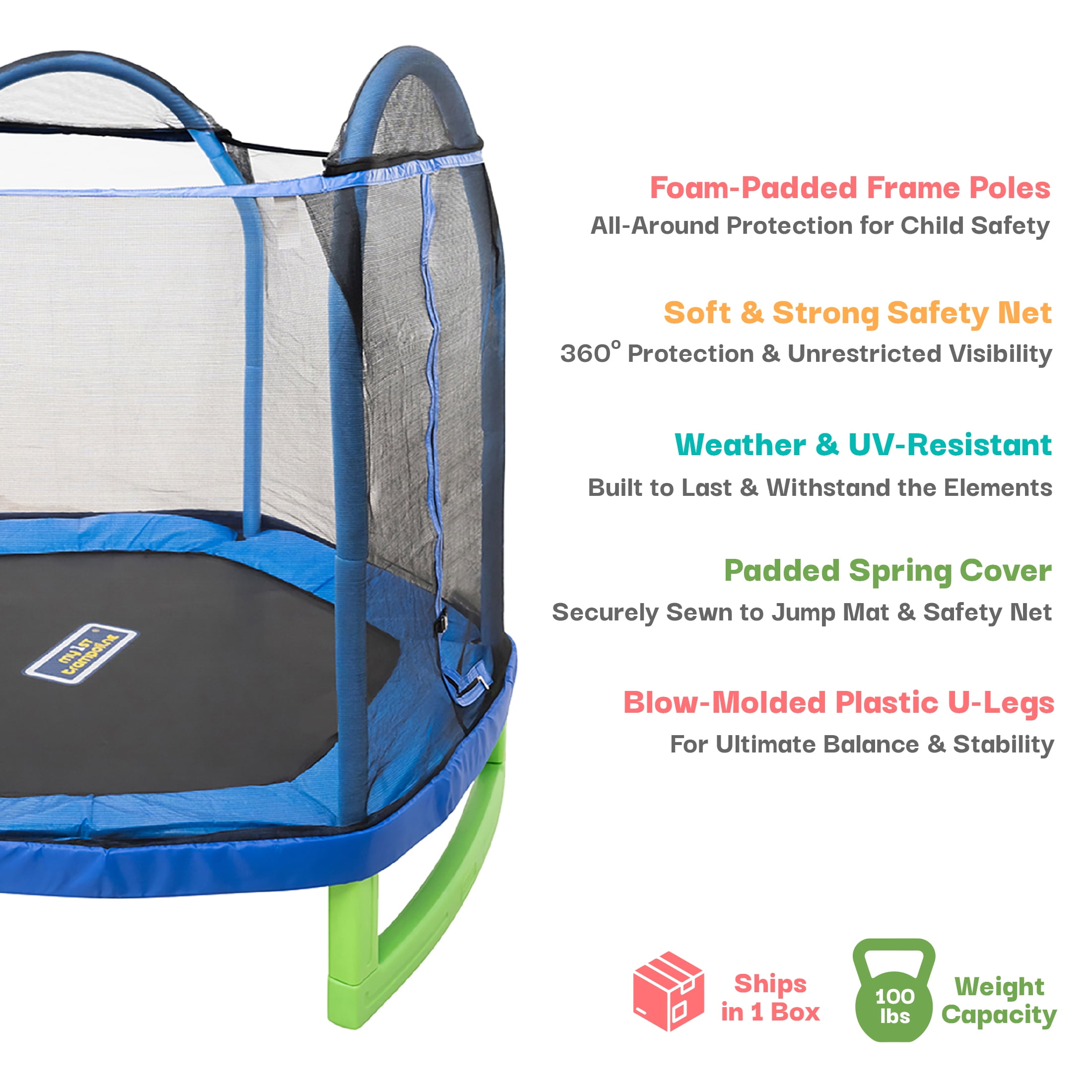 Brand: My First Trampoline by Sportspower Rust-resistant galvanized steel frame Kid-friendly features for added safety UV-resistant jump mat, pad protector and safety-enclosure net 360º soft and durable netting Blow-molded plastic “U-leg” design Foam-padded spring cover sewn to jump mat to prevent contact Product Diameter: 7 ft Easy assembly Zipper entry and exit Maximum Weight Capacity: 100 lbs Product Dimensions: L x W x H: 7’ x 7’ x 33’’ Ships in 1 Box US-based customer service