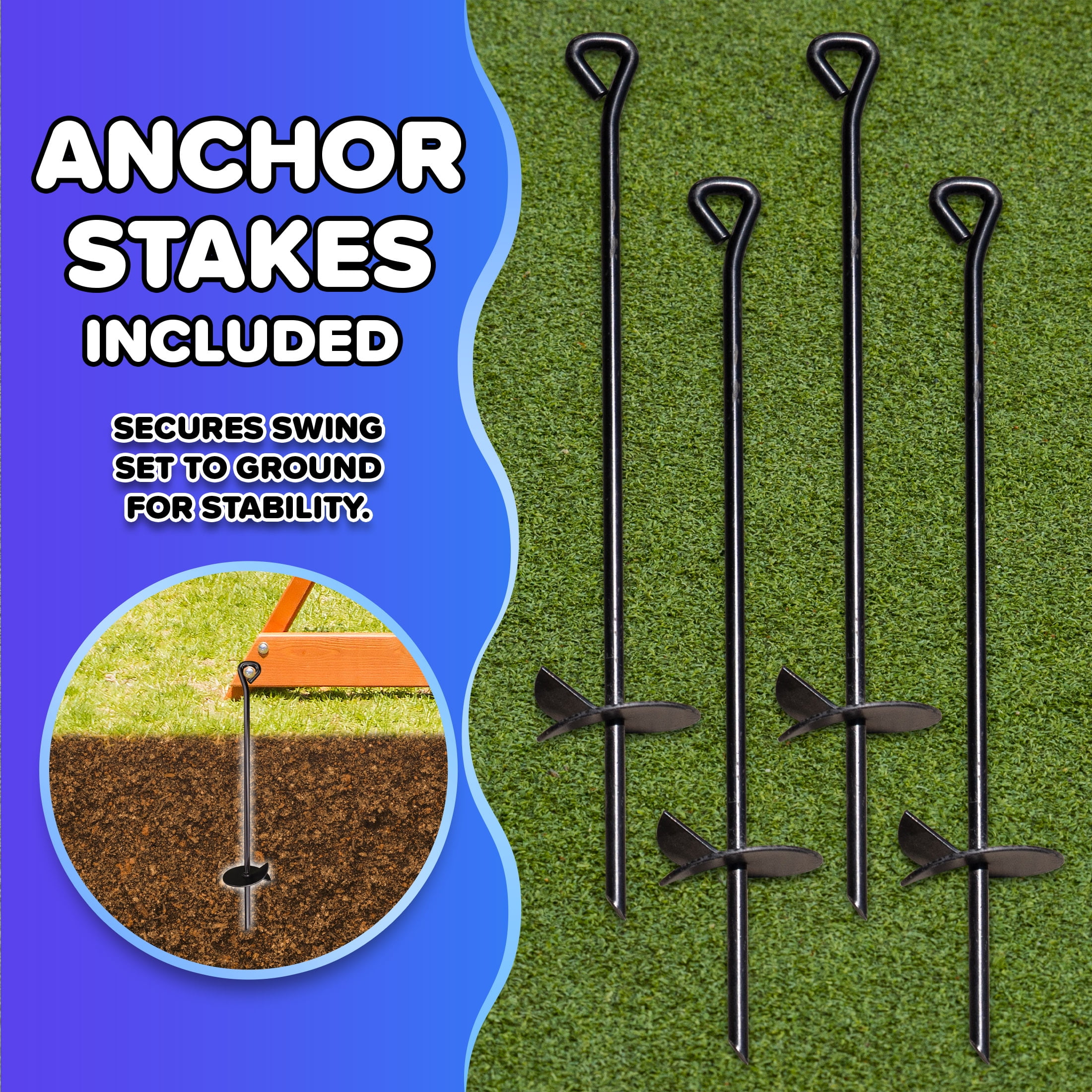 Constructed of heavy duty wood 1 padded saucer swing for up to 2 children 1 height-adjustable sling swing for growing kids 6′ double walled blow-molded slide comes with a lifetime warranty Sandbox (sand not included) Ladder to play fort Chalk tarp for imaginative play (chalk not included) Dual A-frame support beam adds stability & security the competition does not have Play deck with UV-resistant canopy roof Includes anchor kit to help safely secure the swing set into the ground