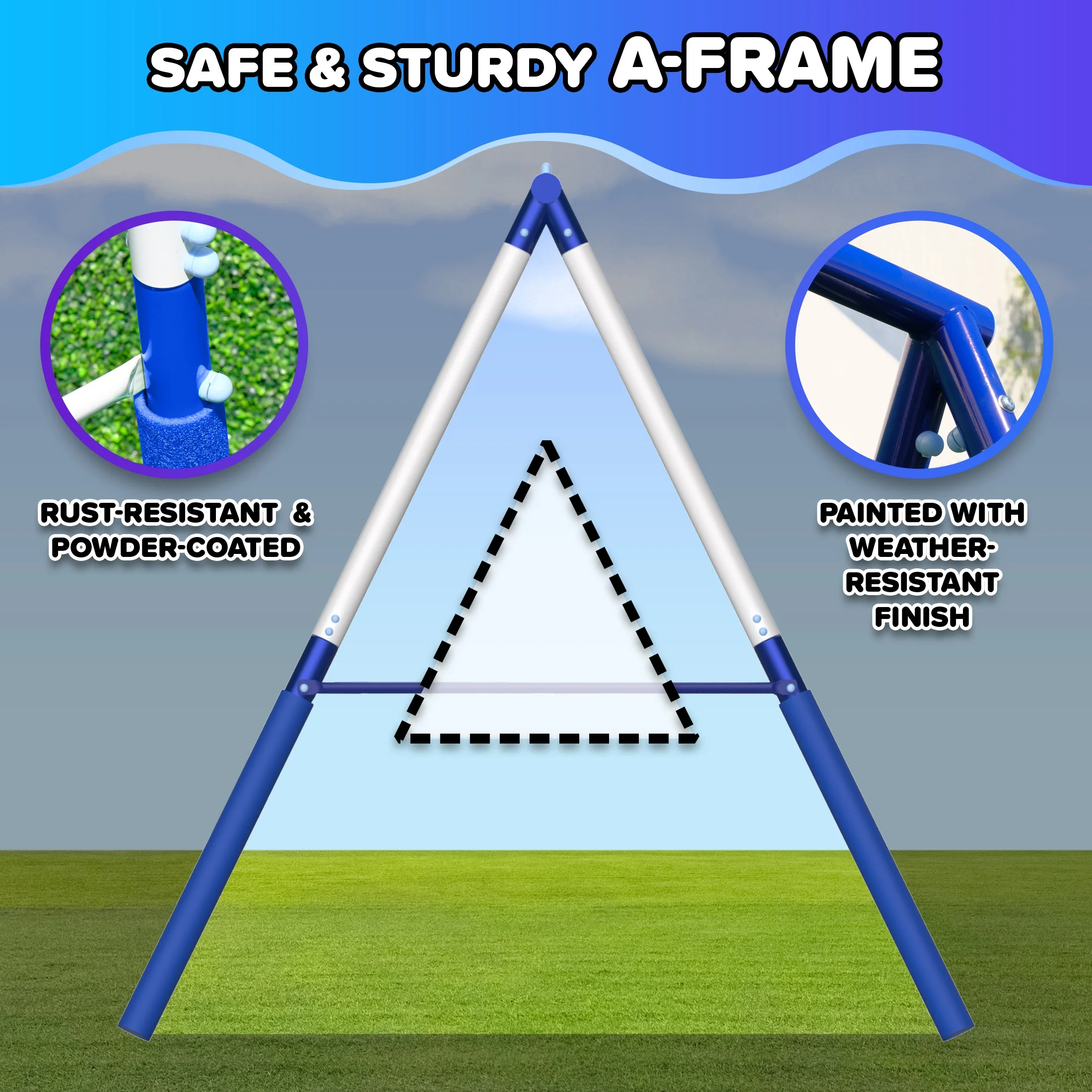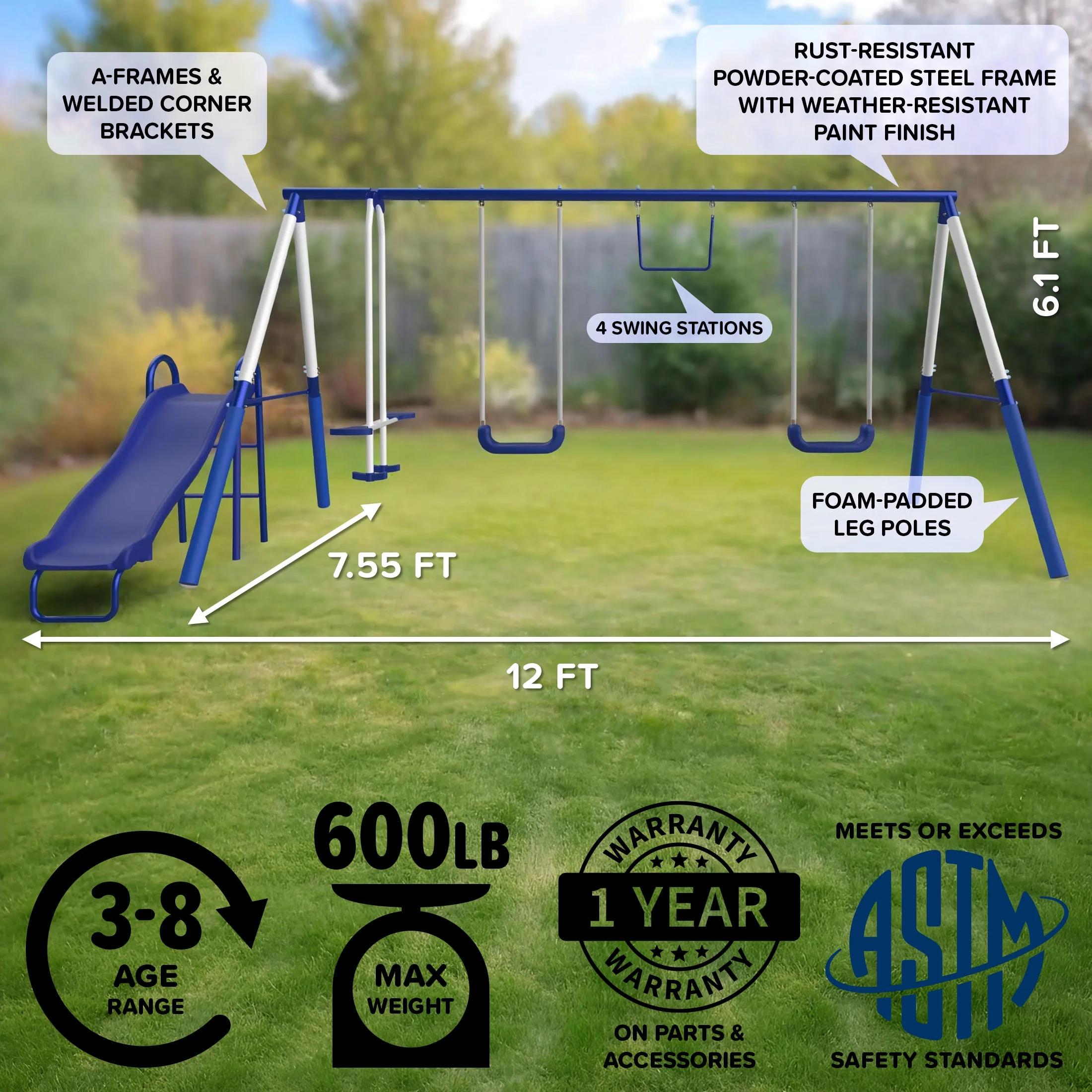 Crafted with heavy-duty 2-inch powder-coated steel tubes for more durability; Two wide blow-molded swings with safe vinyl chain covers to protect hands As many as 6 kids (maximum 100 lbs each) can have fun together Meets or exceeds all ASTM safety standards 4-piece anchor kit secures swing set to the ground for extra safety & stability