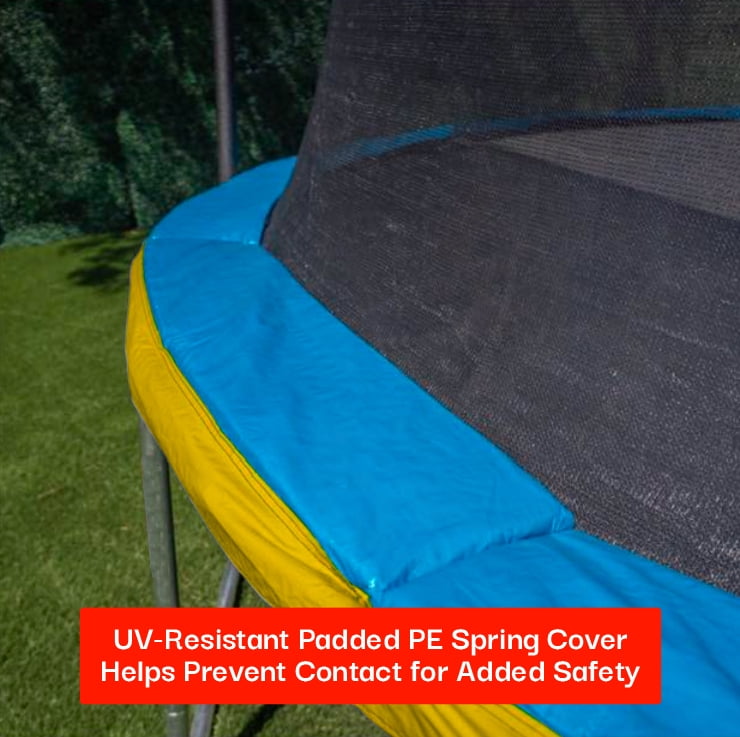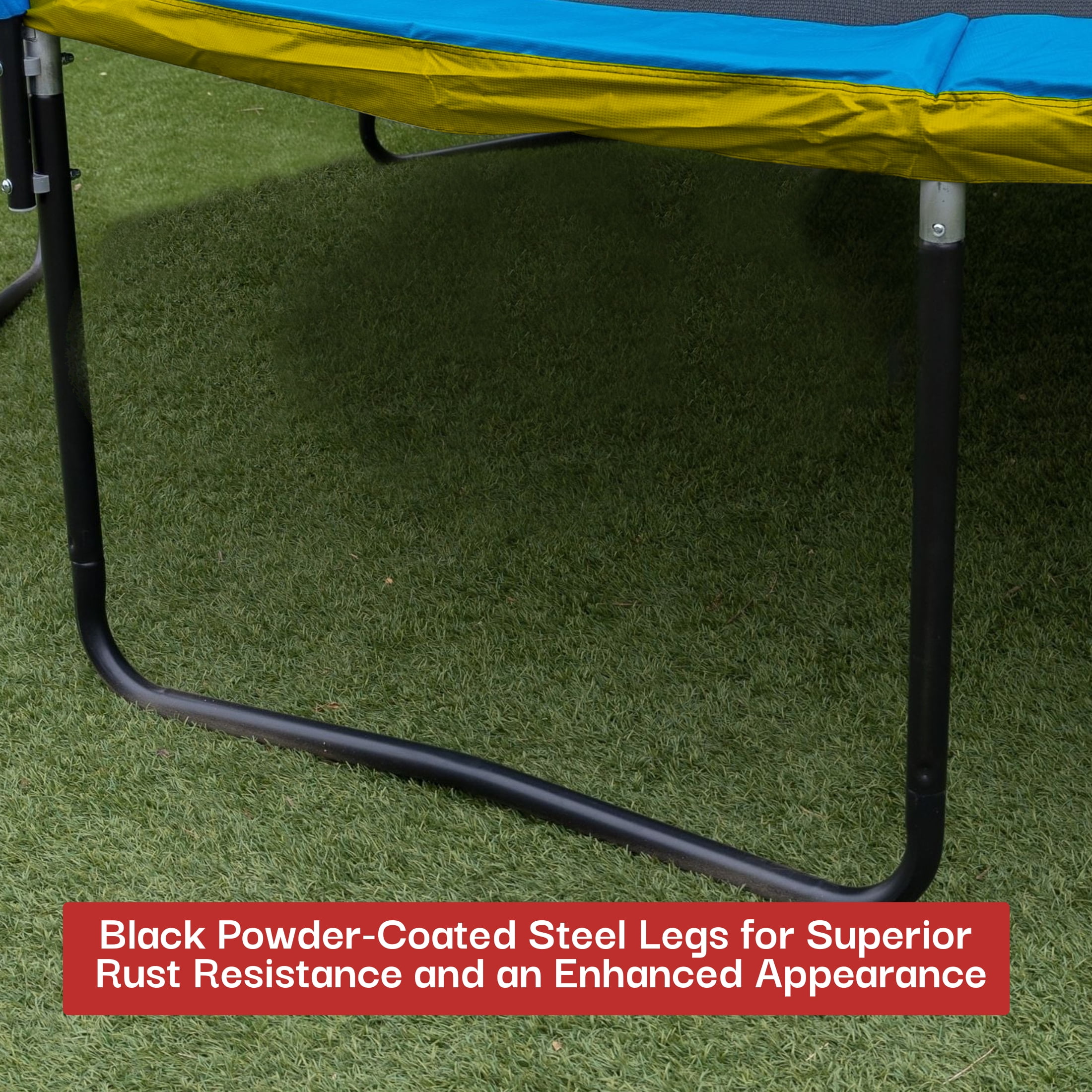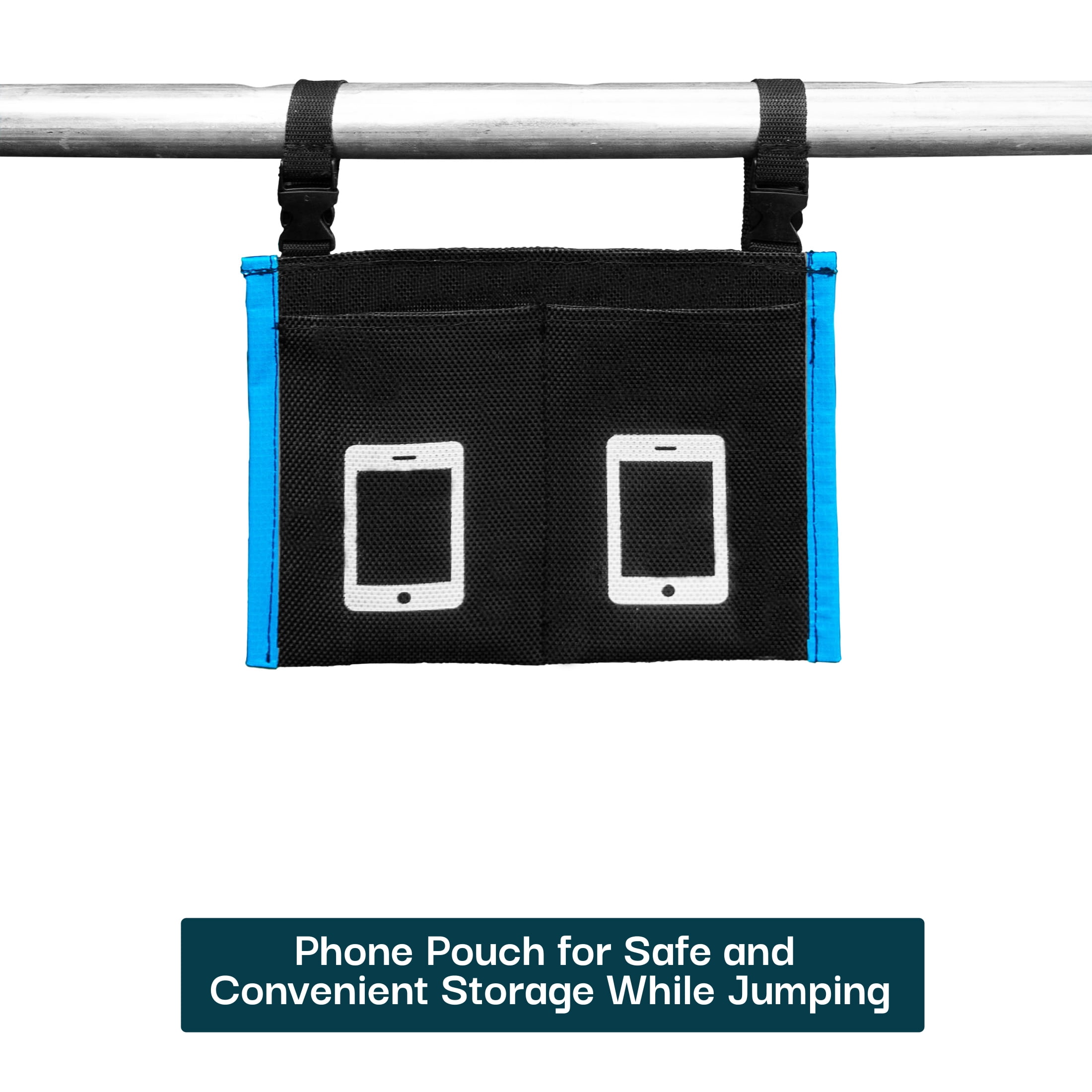 Experience the perfect blend of safety and fun with this 12ft Round Trampoline with Enclosure from Bounce Pro. Designed with families in mind, this trampoline offers an array of features that ensure a safe and enjoyable jumping experience for everyone. Safety is our priority. Built with the best-in-market galvanized steel structure, this trampoline is both sturdy and durable. Its black anti-rust painted legs not only add a sleek, modern look but also provide long-lasting rust protection. The UV-resistant jumping mat ensures longevity, made with trampoline park-quality materials for maximum enjoyment and durability. To enhance the fun, this trampoline includes a fabric basketball board, complete with a ball and pump, encouraging active and playful competition. Super fun electronic lazzer game to shoot the targets and keep a score for the best competitive action. Flashing lights activated by motion that flashes lights in the center of the trampoline to bring kids to the safest jumping zone in the mat. A convenient phone pouch is included, giving a secure storage option for personal items while kids are playing. Finally, safety is reinforced with a padded spring cover, preventing any accidental contact with the springs. Designed and crafted with both safety and fun at its core, this trampoline is a perfect addition to any backyard, promising hours of safe play and excitement.