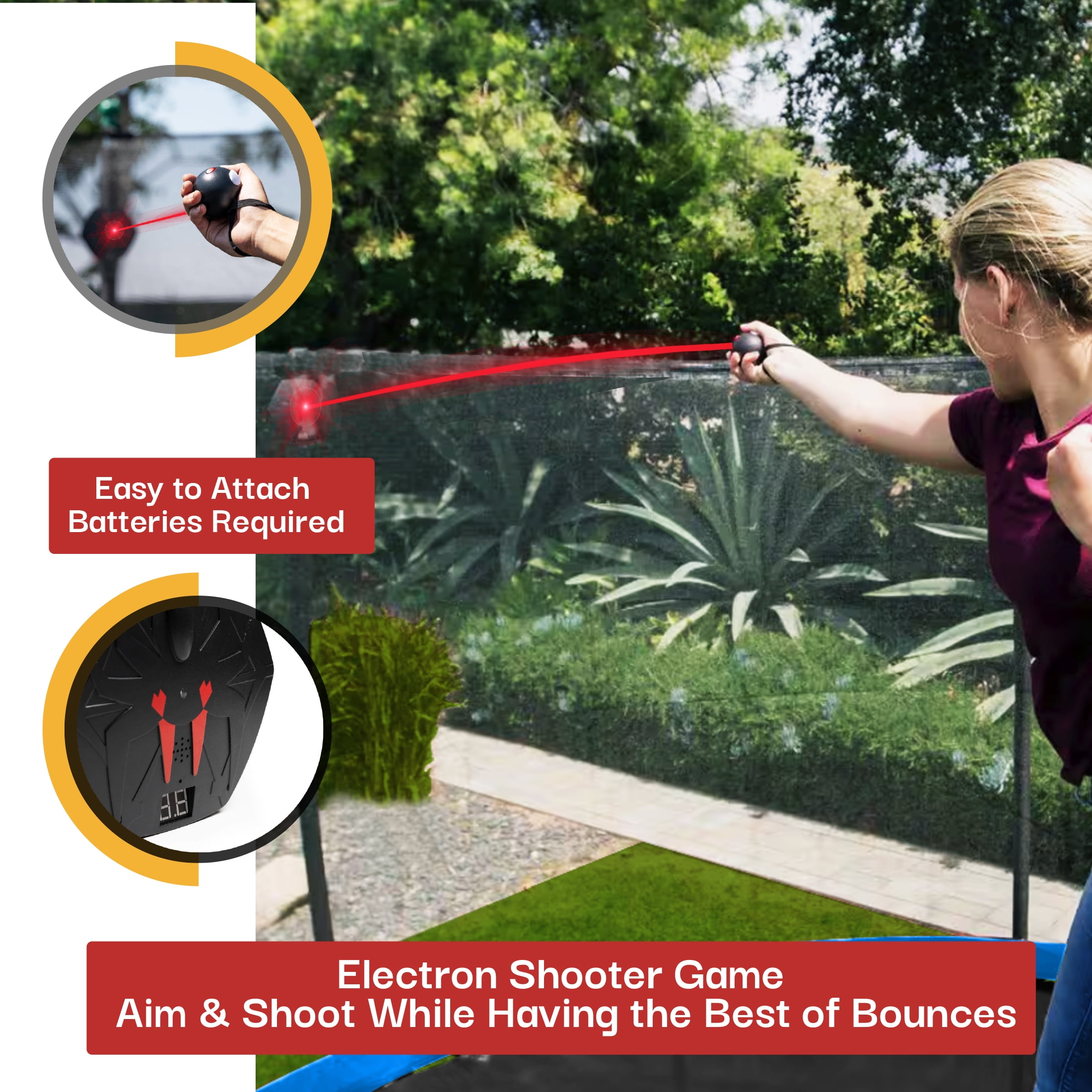Heavy Duty Steel Frame UV Resistant Jump Mat Multiplay features: electron shooter game, flash light zone, basketball board & ball Bounce Power #1 trusted brand