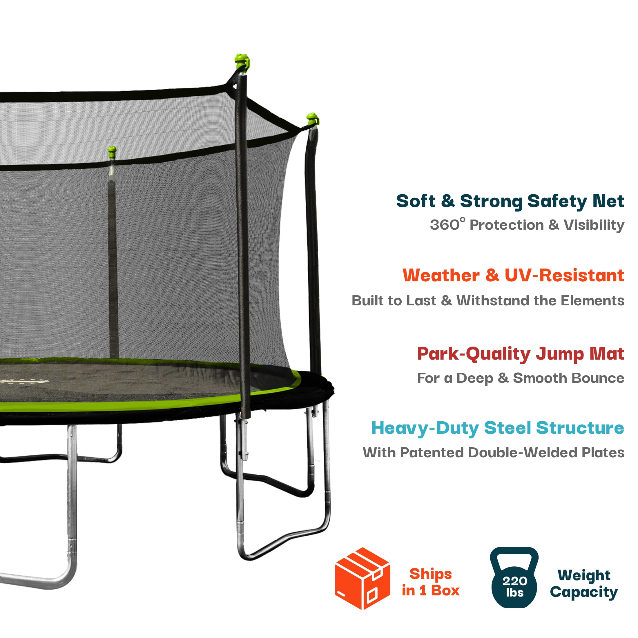 Rust-resistant galvanized steel frame UV-resistant jump mat, pad protector and safety-enclosure net 360º soft and durable netting Park-quality jump mat withstands over 5000 hours of UV testing Foam-padded spring cover for added safety Patented double-welded plates on joints and leg connections Steel “U-leg” design for stability Product Diameter: 14 ft Maximum Weight Capacity: 220 lbs Ships in 1 Box US-based customer service