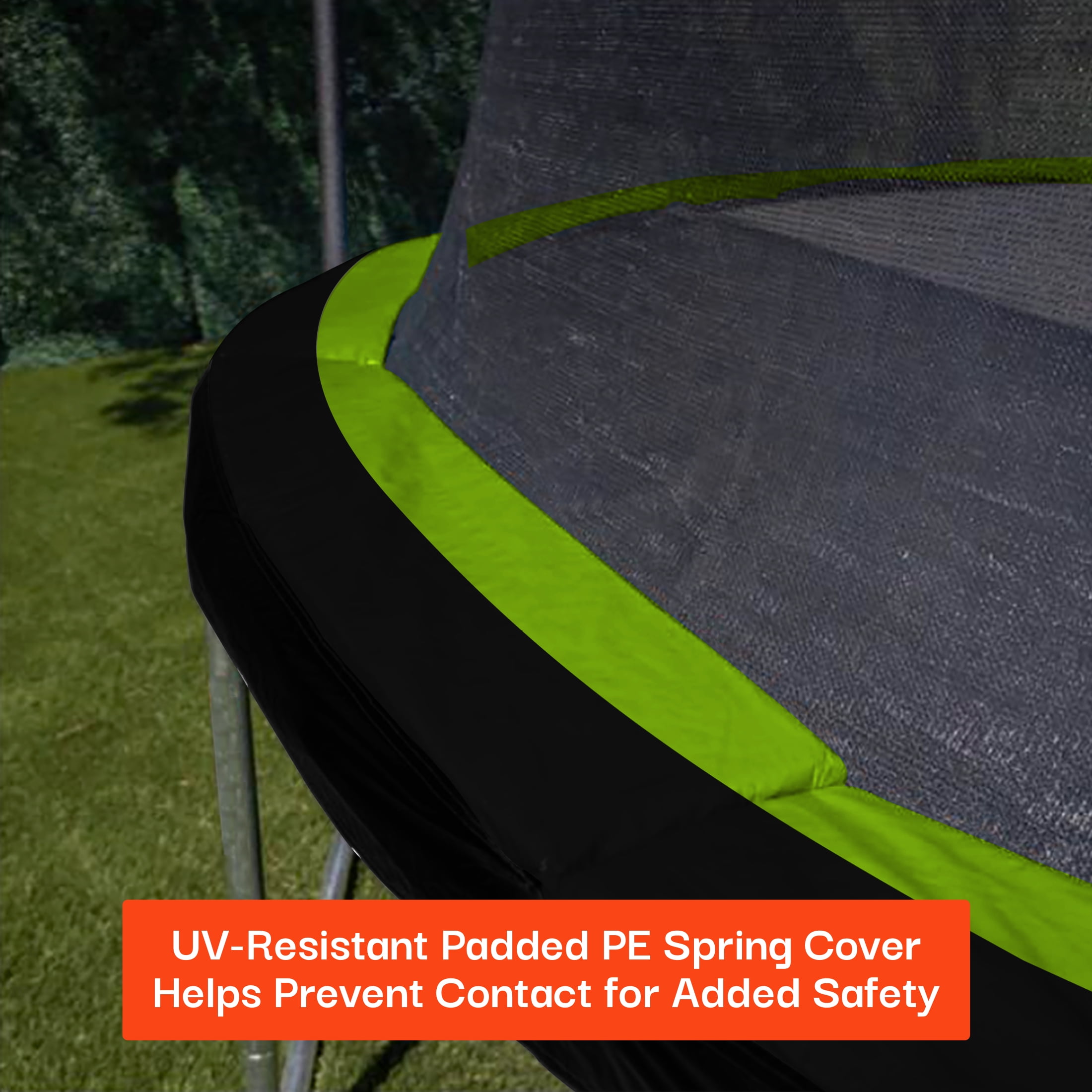 Rust-resistant galvanized steel frame UV-resistant jump mat, pad protector and safety-enclosure net 360º soft and durable netting Park-quality jump mat withstands over 5000 hours of UV testing Foam-padded spring cover for added safety Patented double-welded plates on joints and leg connections Steel “U-leg” design for stability Product Diameter: 14 ft Maximum Weight Capacity: 220 lbs Ships in 1 Box
