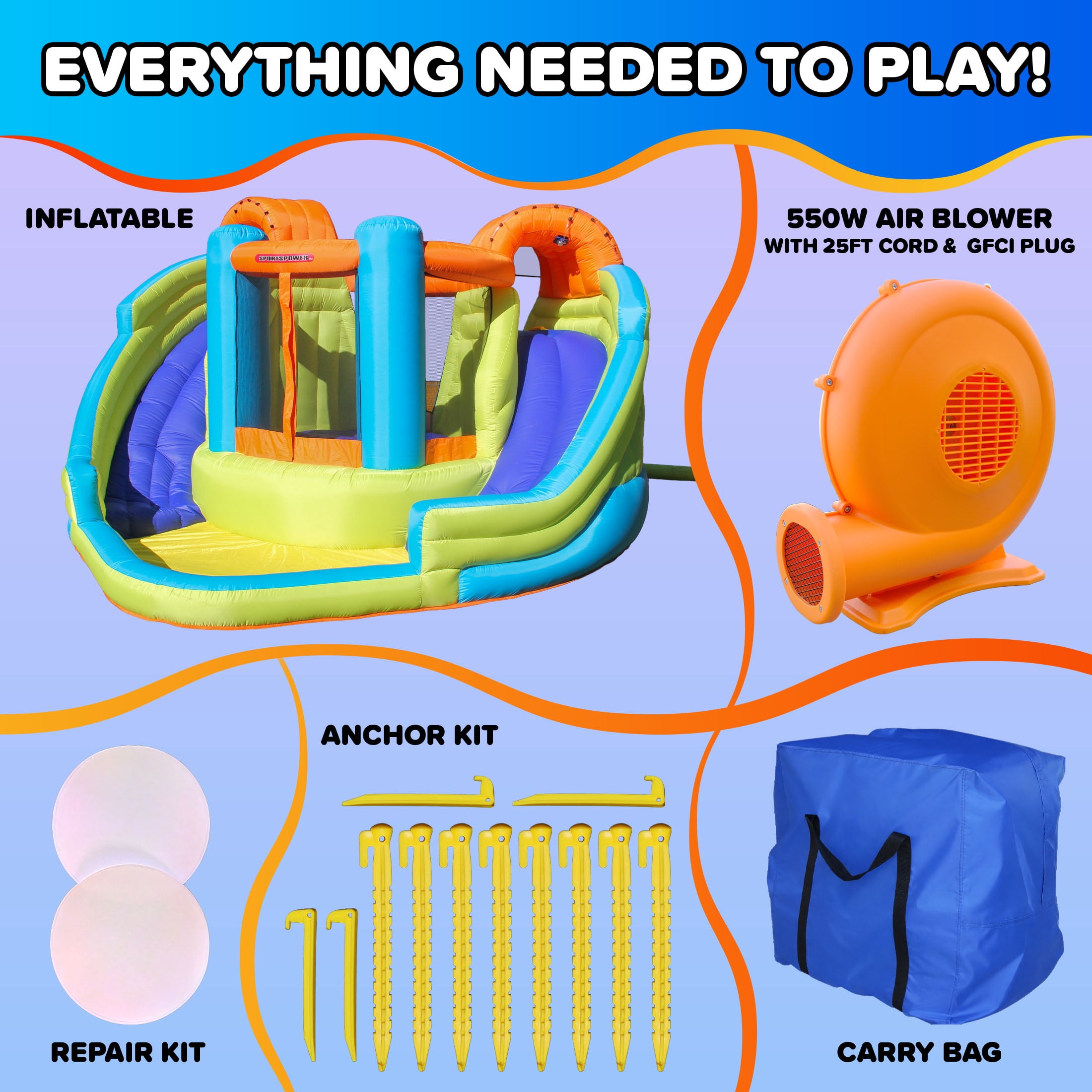 2-IN-1 WATER FUN – Combines two curved water slides with a central bounce house for nonstop backyard excitement COOLING SPRINKLERS – Built-in water sprayers above each slide keep kids refreshed as they race to the splash pool LARGE SPLASH POOL – Double slides lead to a spacious splash area for added fun and soft landings FAST INFLATION – Includes powerful electric air blower with GFCI plug and lifetime warranty for quick, safe setup DURABLE – Made with tough materials and meets or exceeds all ASTM safety standards for peace of mind COMPLETE SET – Comes with blower, hose, stakes, repair kit, and carry bag—everything you need for summer fun