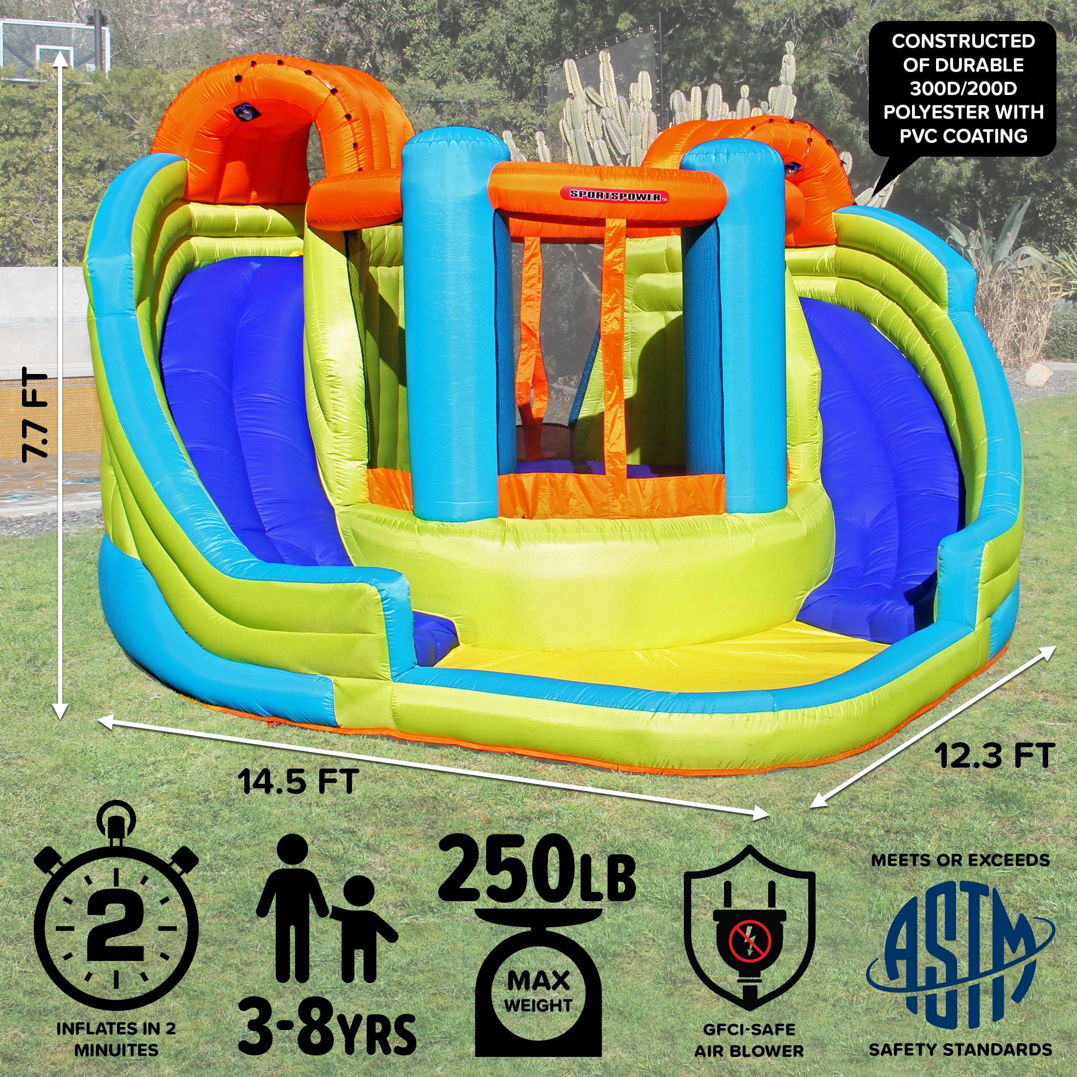 Sportspower™ Double Slide & Bounce House with Splash Pool, Water Sprinklers, Heavy Duty, ASTM Certified, Ages 3-8, Lifetime Warranty on Included Blower