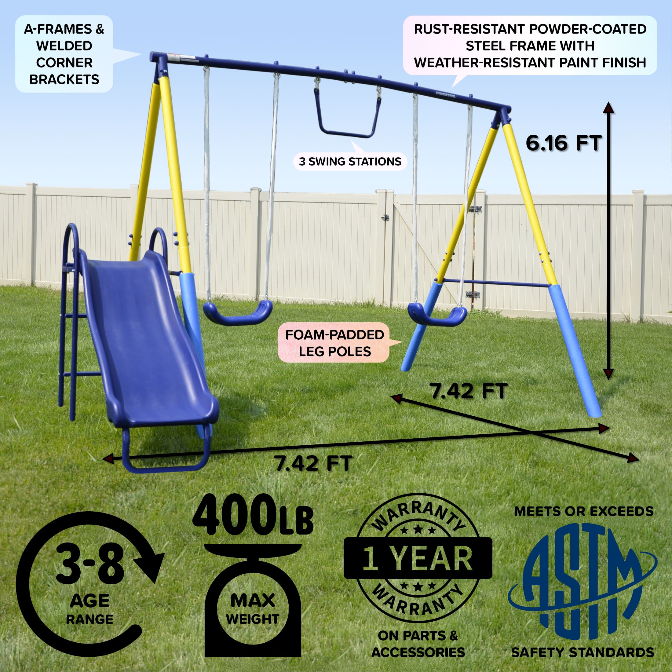 Crafted with heavy-duty 2-inch powder-coated steel tubes for more durability Two blow-molded swings with safe vinyl chain covers to protect hands Large and durable 5-foot one-piece blow-molded slide for easy assembly Metal trapeze bar for acrobatic fun Foam-padded legs for safety and comfort As many as 4 kids (maximum 100 lbs each) can have fun together Meets or exceeds all ASTM safety standards