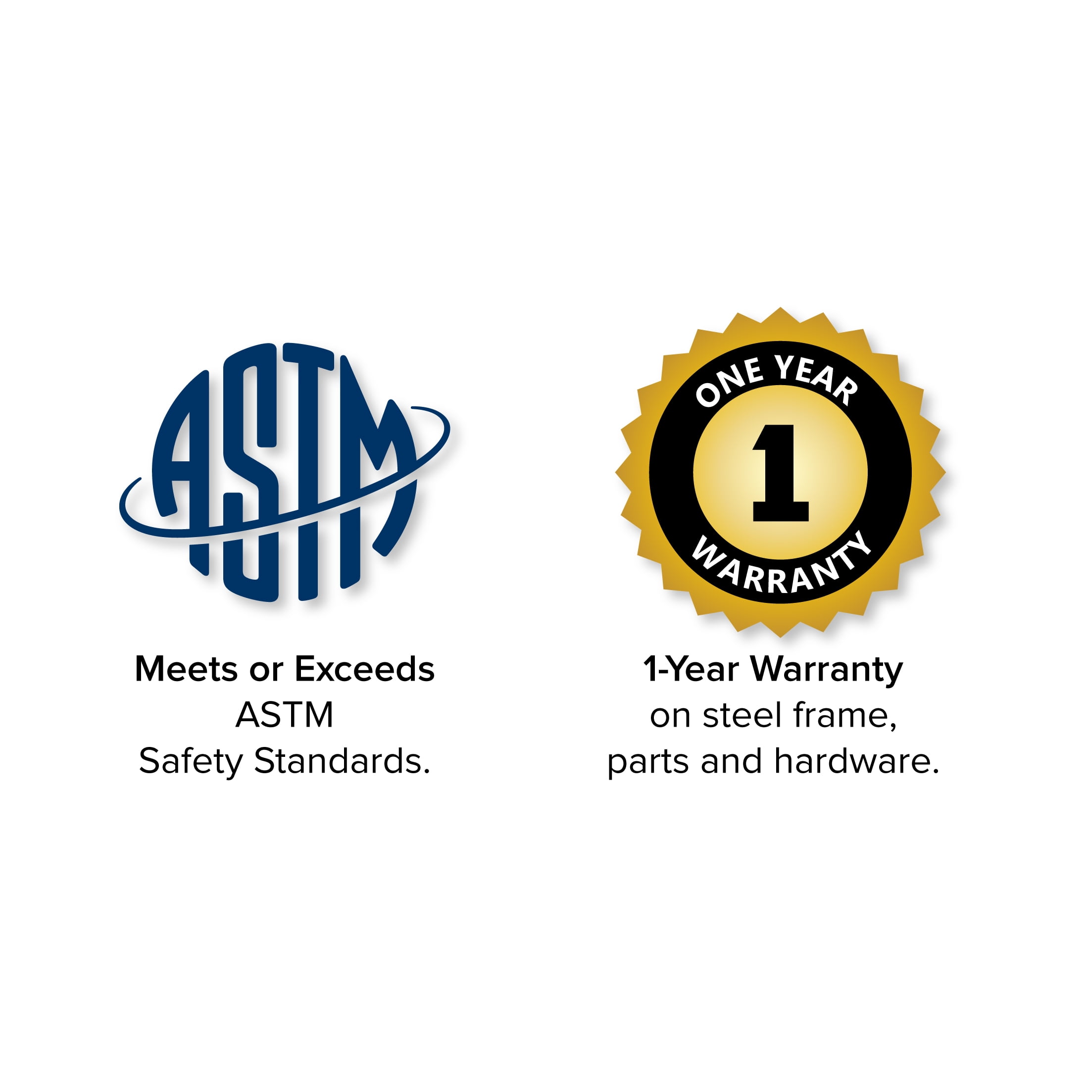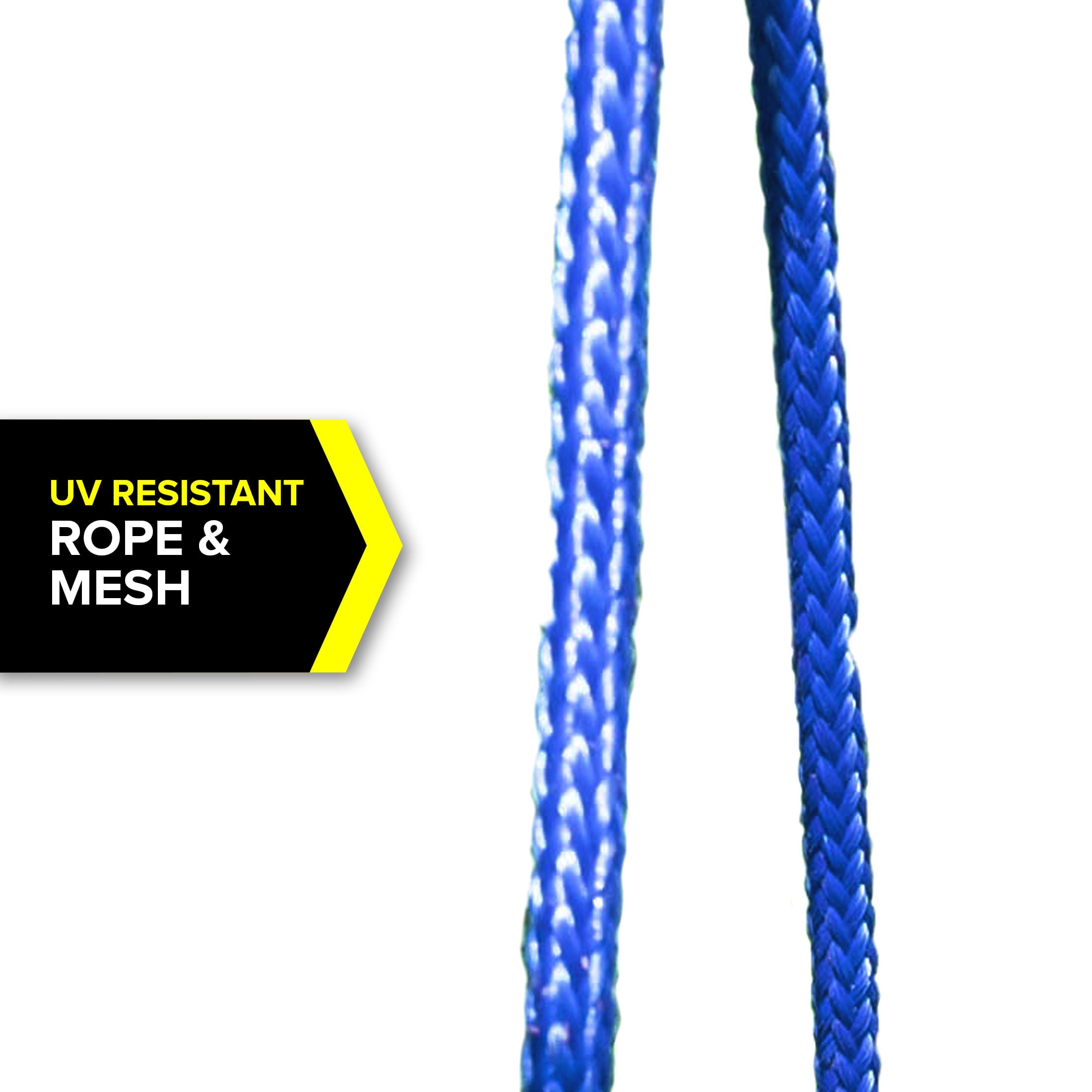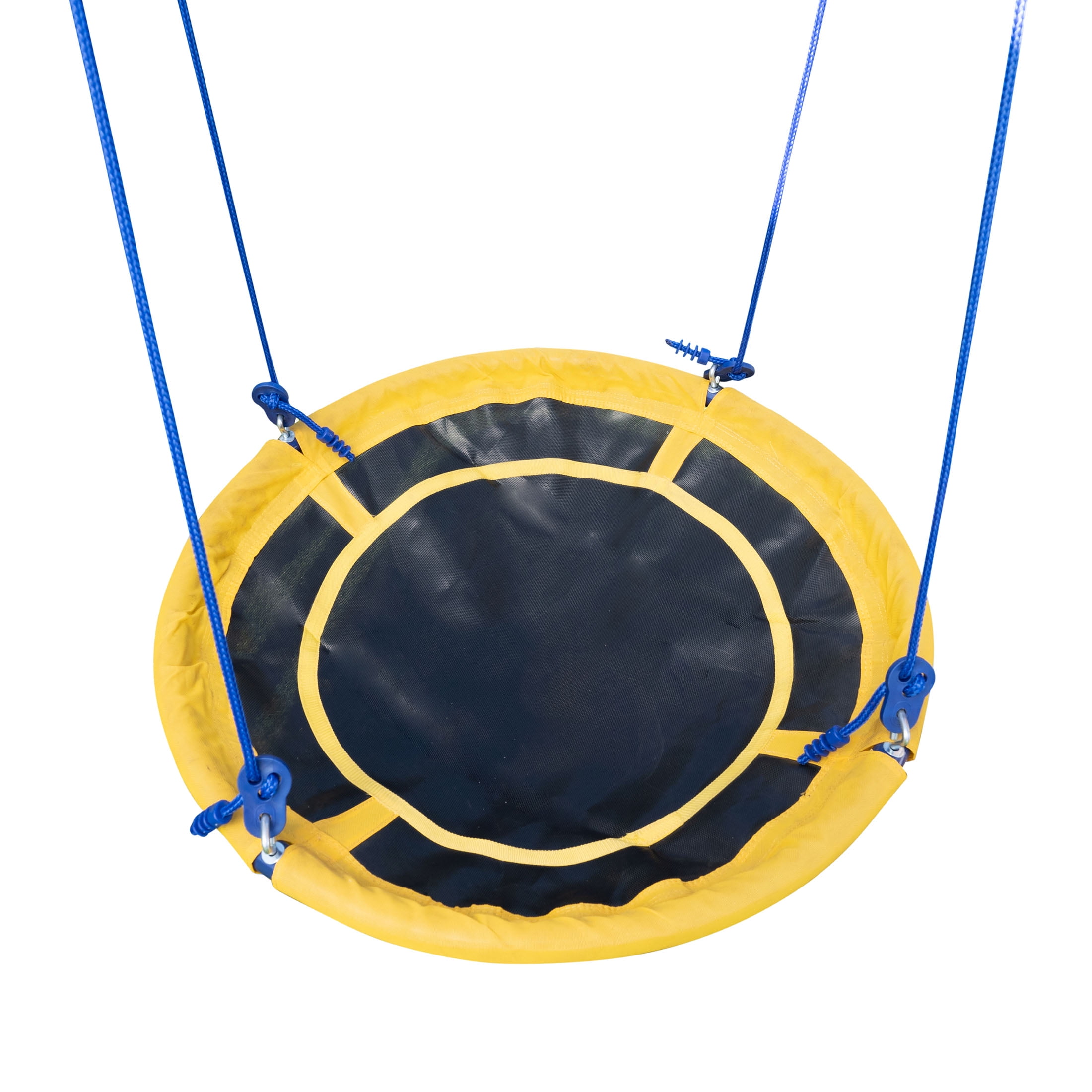Sturdy adjustable rope and carabiners included to secure saucer swing UV resistant rope and mesh Powder coated steel frame Reinforced inner netting for extra protection Includes 2 heavy-duty straps for hanging Meets or exceeds all ASTM safety standards