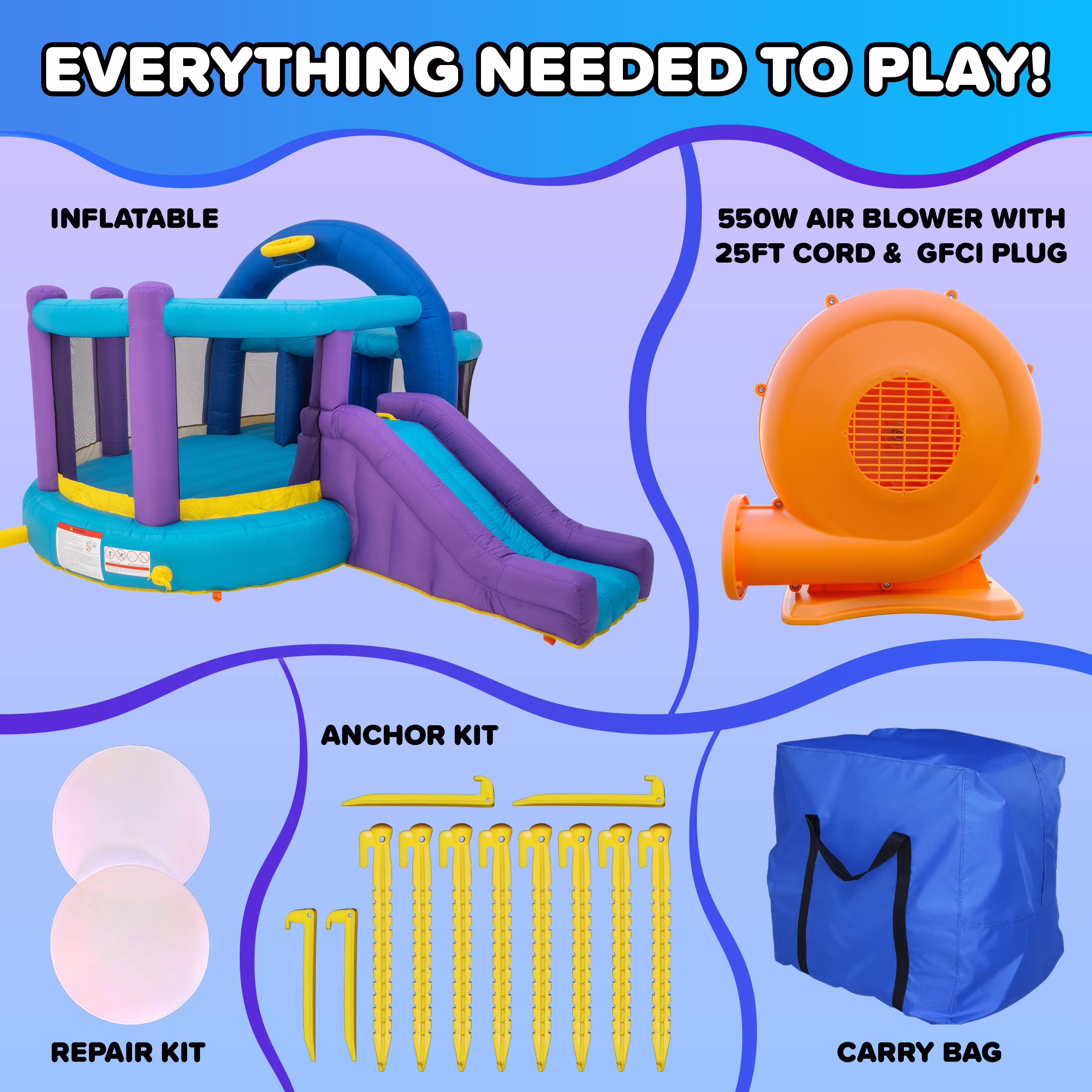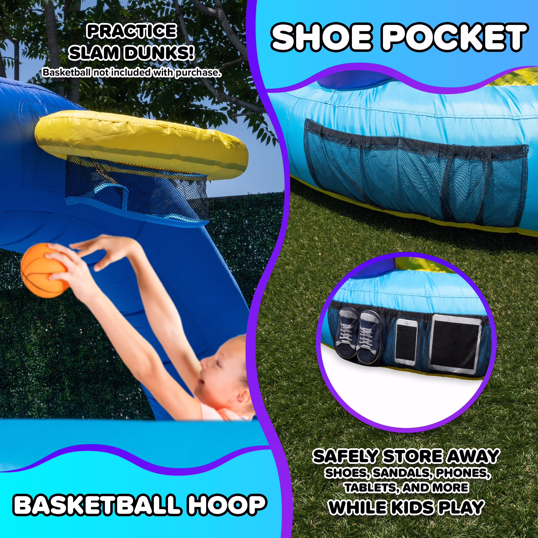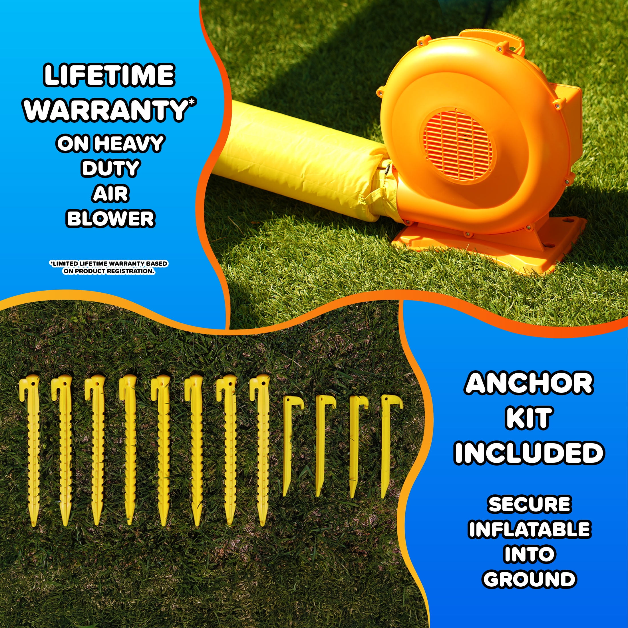 ACTION-PACKED FUN – Features bouncing, basketball, and a hilarious whack-a-play game with included inflatable hammer SAFE ENTRY SLIDE – Cushioned slide offers a safe and fun way to get in and out of the bounce area DURABLE & SECURE – Made with puncture-resistant polyester, mesh sides, and includes 6 ground anchors INFLATES IN MINUTES – Comes with powerful electric air blower and inflates quickly for fast setup PERFECT FOR PARTIES – Great for birthdays, BBQs, and outdoor events; adds excitement and color to any backyard COMPLETE PACKAGE – Includes blower (with lifetime warranty), stakes, basketball, hammer, repair kit, and carry bag