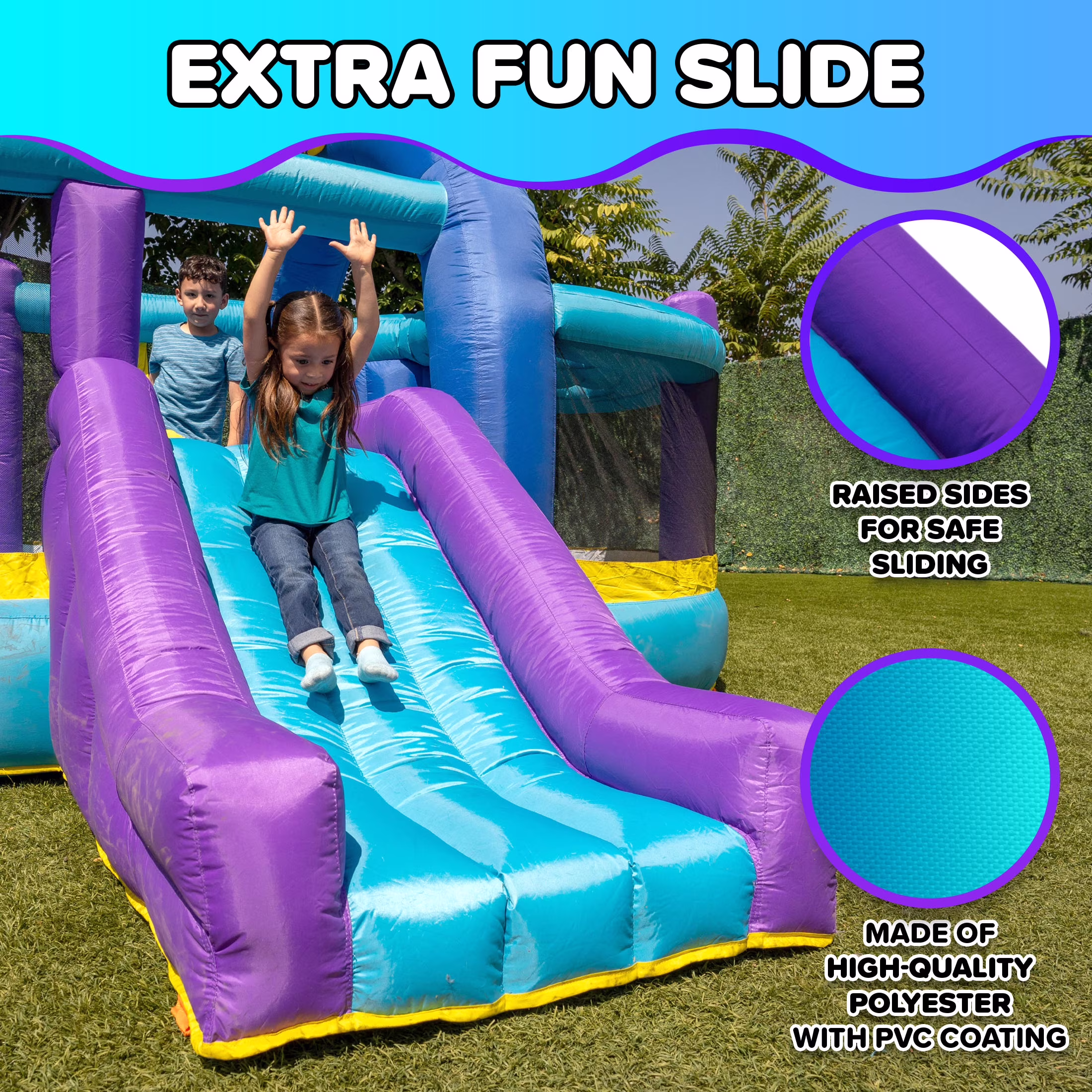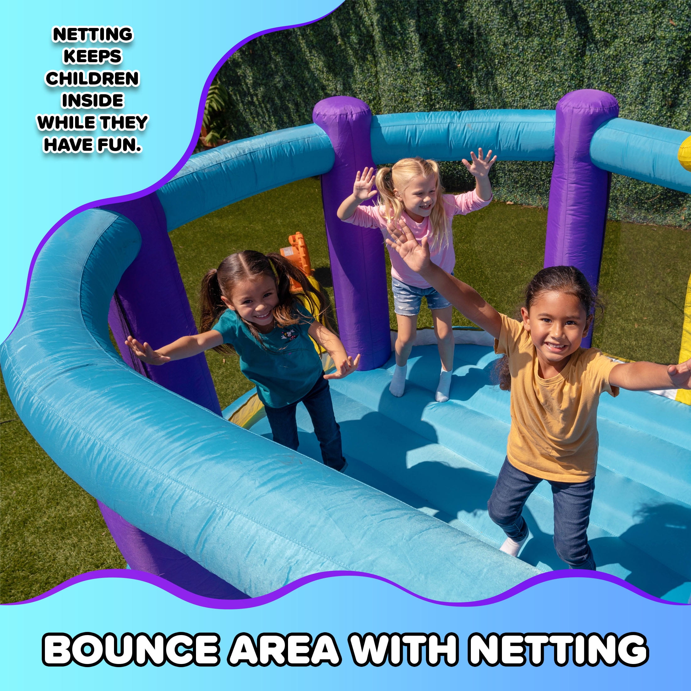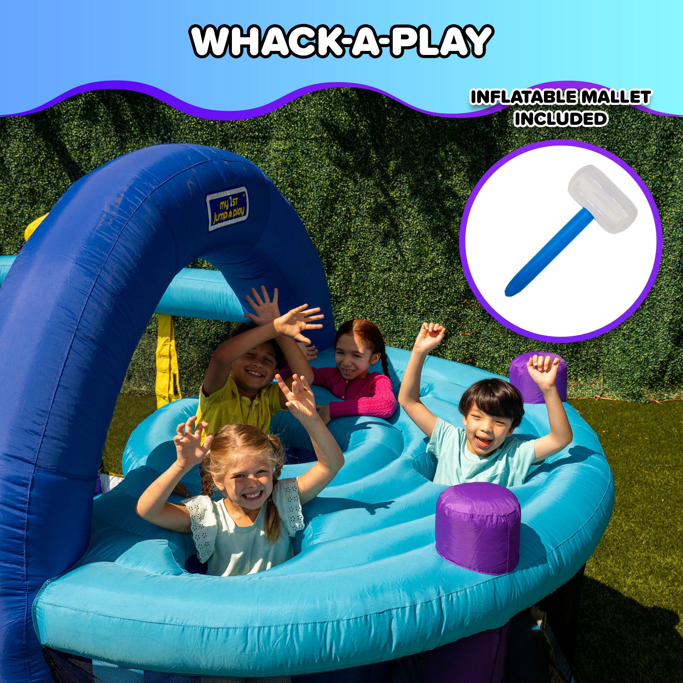 ACTION-PACKED FUN – Features bouncing, basketball, and a hilarious whack-a-play game with included inflatable hammer SAFE ENTRY SLIDE – Cushioned slide offers a safe and fun way to get in and out of the bounce area DURABLE & SECURE – Made with puncture-resistant polyester, mesh sides, and includes 6 ground anchors INFLATES IN MINUTES – Comes with powerful electric air blower and inflates quickly for fast setup PERFECT FOR PARTIES – Great for birthdays, BBQs, and outdoor events; adds excitement and color to any backyard COMPLETE PACKAGE – Includes blower (with lifetime warranty), stakes, basketball, hammer, repair kit, and carry bag