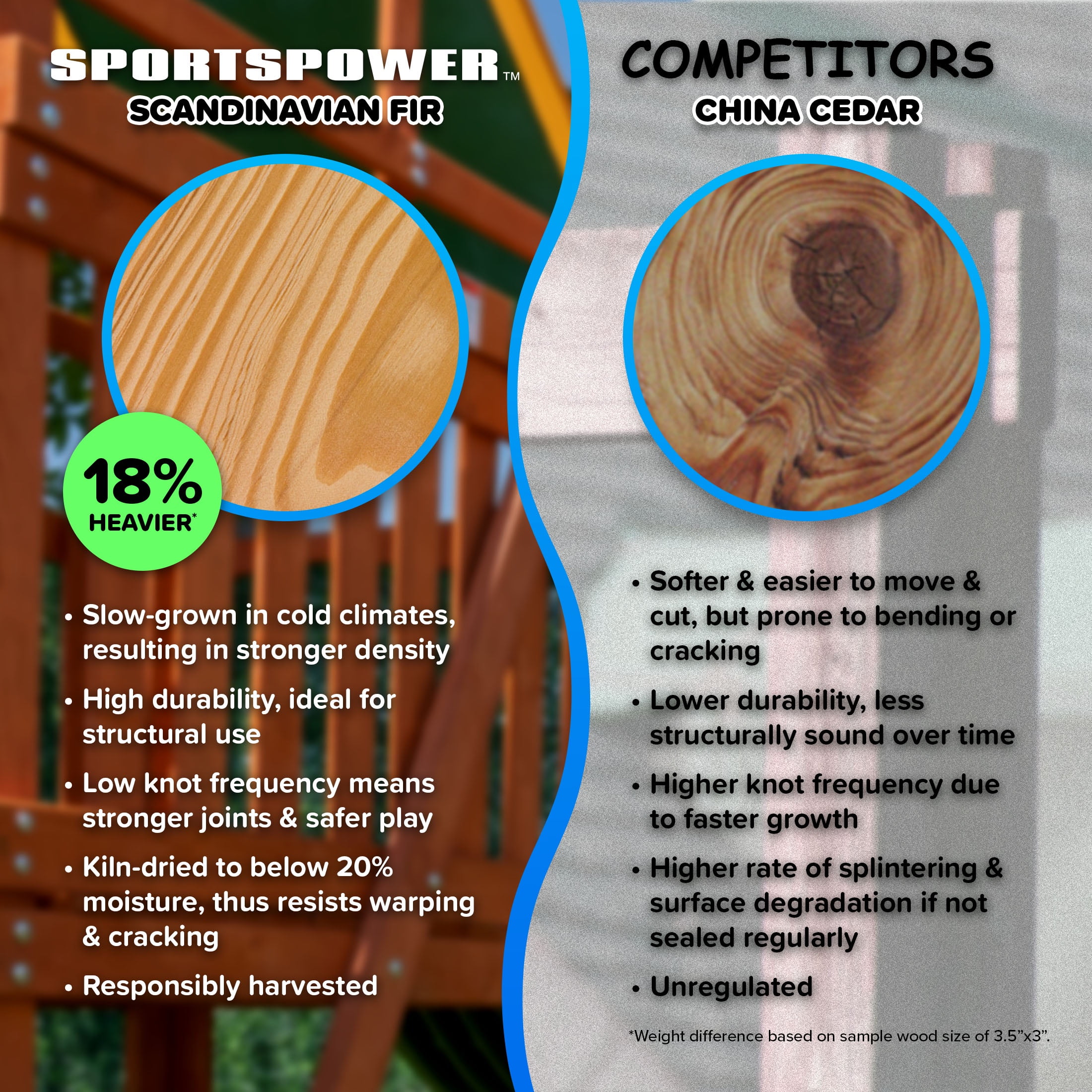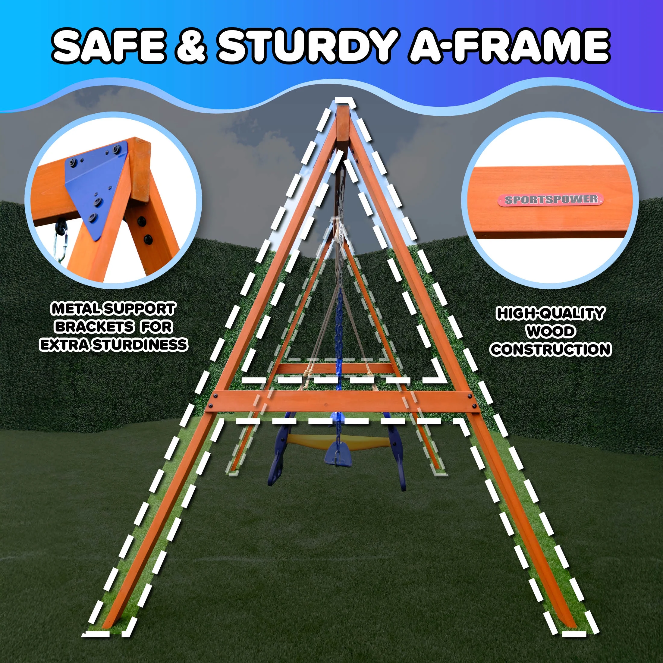 Improve your backyard fun with the Sportspower Kingston Wooden Swing Set! Featuring two belt swings and a trapeze swing bar, this classic swing set combines natural wood and vibrant blue accents. Measuring 113.9″ x 74.3″ x 82.3″, it provides plenty of room for swinging without overwhelming your yard. The belt swings are designed with vinyl-coated chains to protect little fingers from pinches, while all three swings are fully adjustable to accommodate kids of different ages. This thoughtful design allows the swing set to grow alongside your children, offering years of enjoyment. For added safety and stability, this swing set includes a 4-piece anchor kit to secure it firmly to the ground. The Sportspower Kingston Swing Set accommodates up to three children (100 lbs. max each) at once, so everyone can join the fun! All Sportspower products meet or exceed ASTM safety standards, giving you peace of mind while your kids enjoy endless backyard adventures.